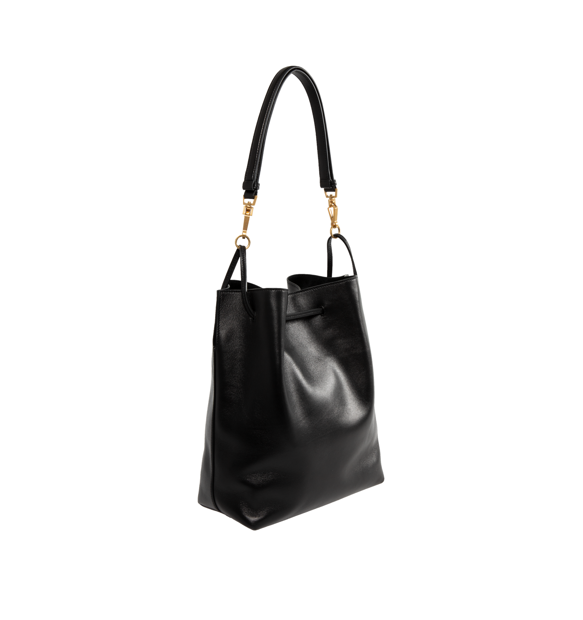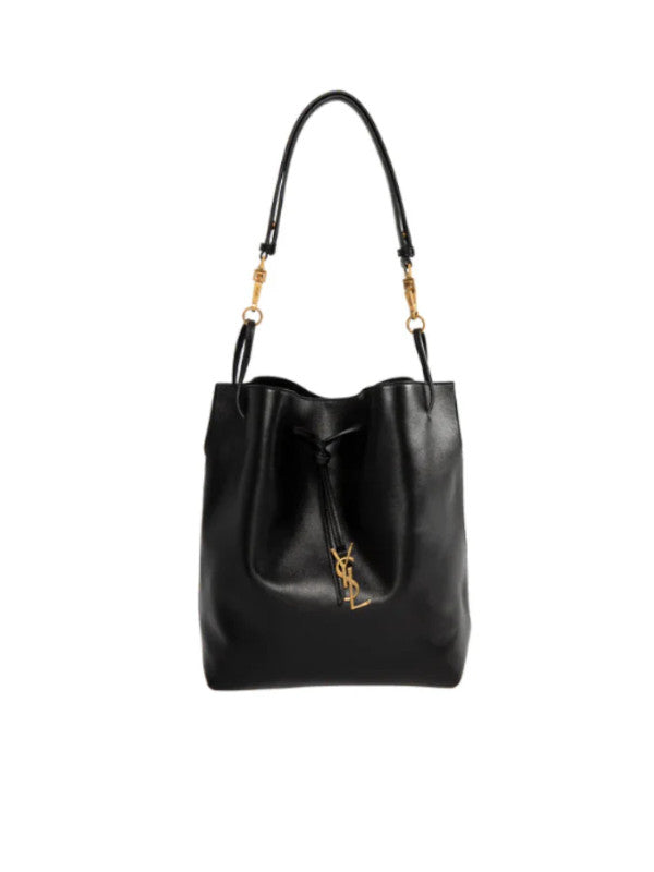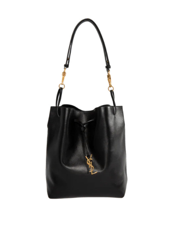Saint Laurent YSL Lambskin Pochon has a drawstring closure, a detachable leather strap, an interior pocket, and bronze tone hardware. 7.9 x 9.4 x 1.2 inches. Lined. 100% leather.