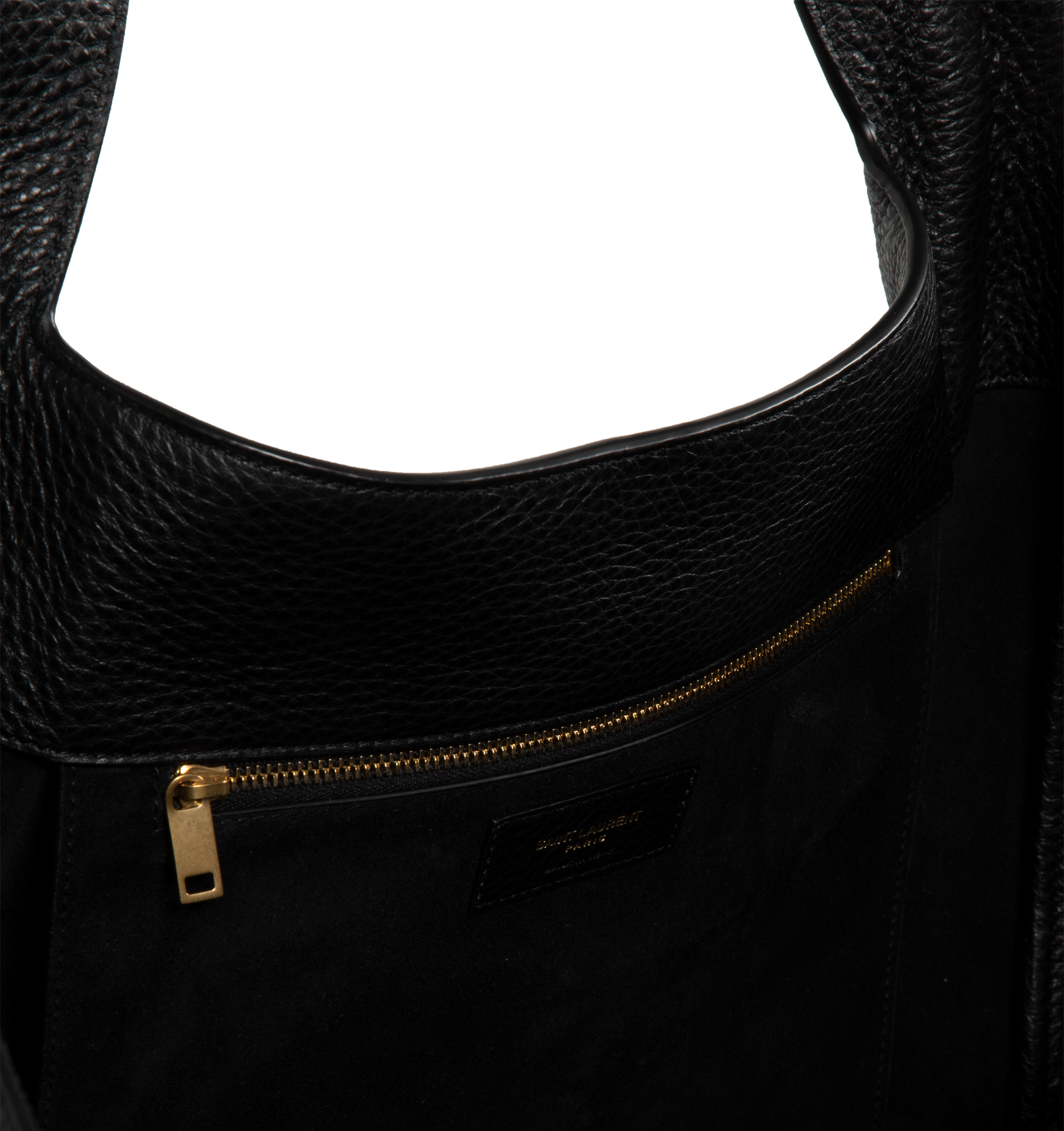 SAINT LAURENT Bea Shop Bag featuring leather tab closure, suede lining, inner zip pocket and inner ties to collapse or expand the sides. 19.7 X 11 X 7.1 inches. 100% deerskin. Made in Italy.