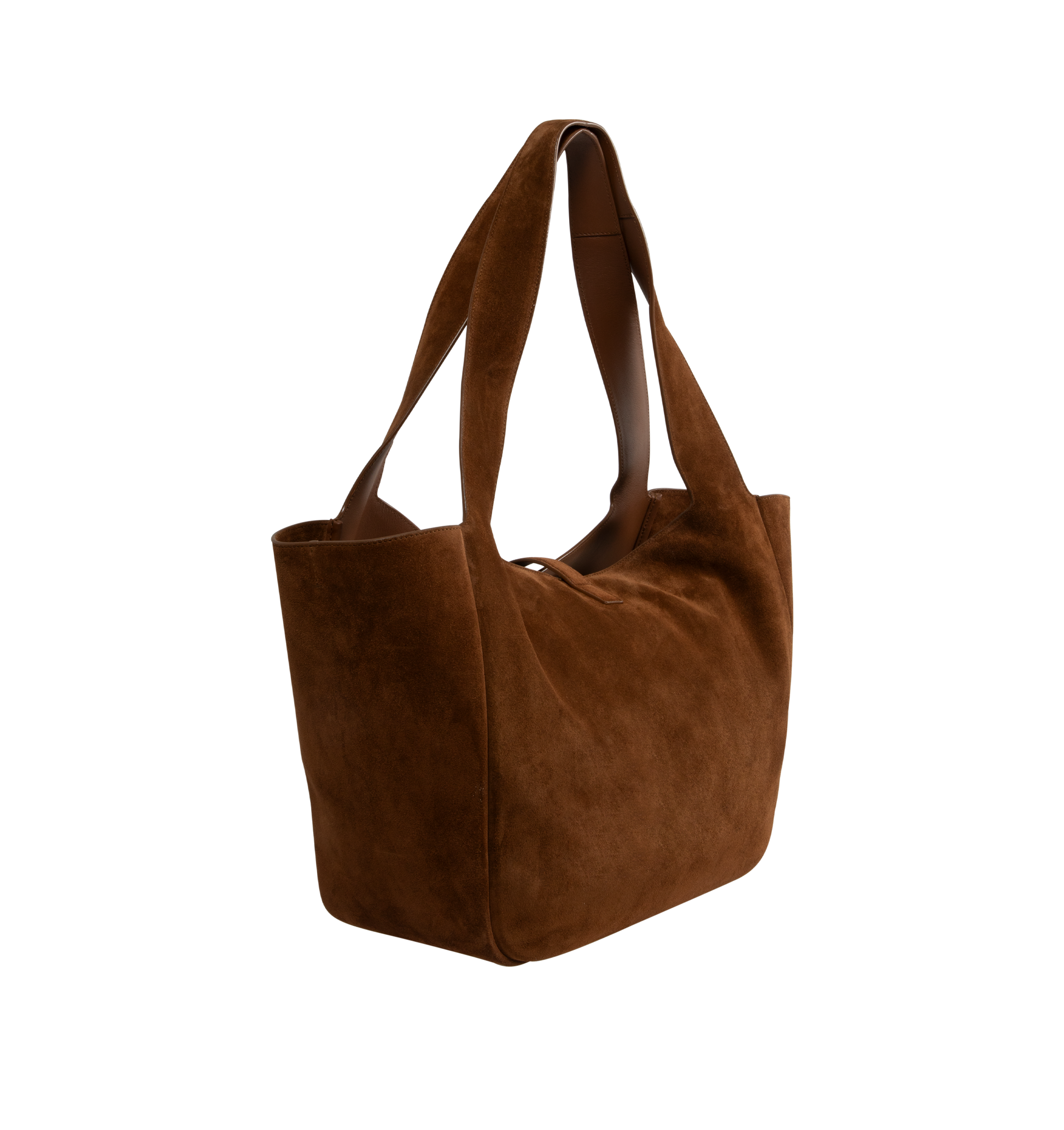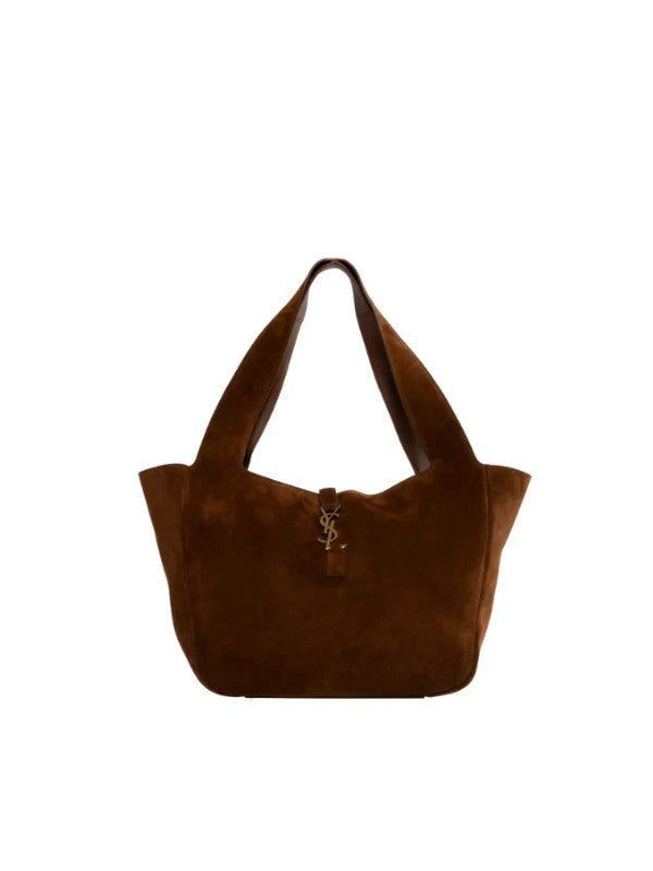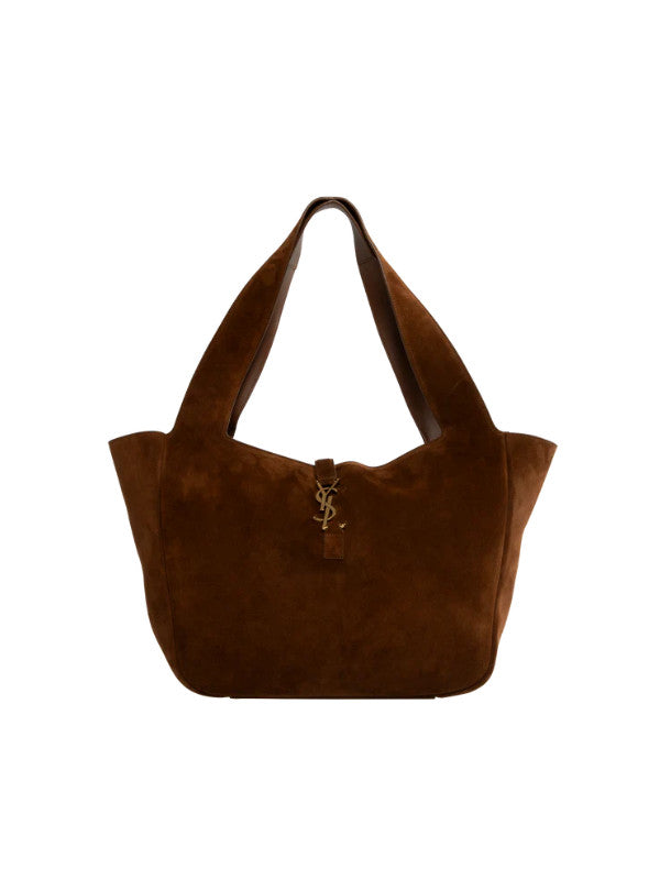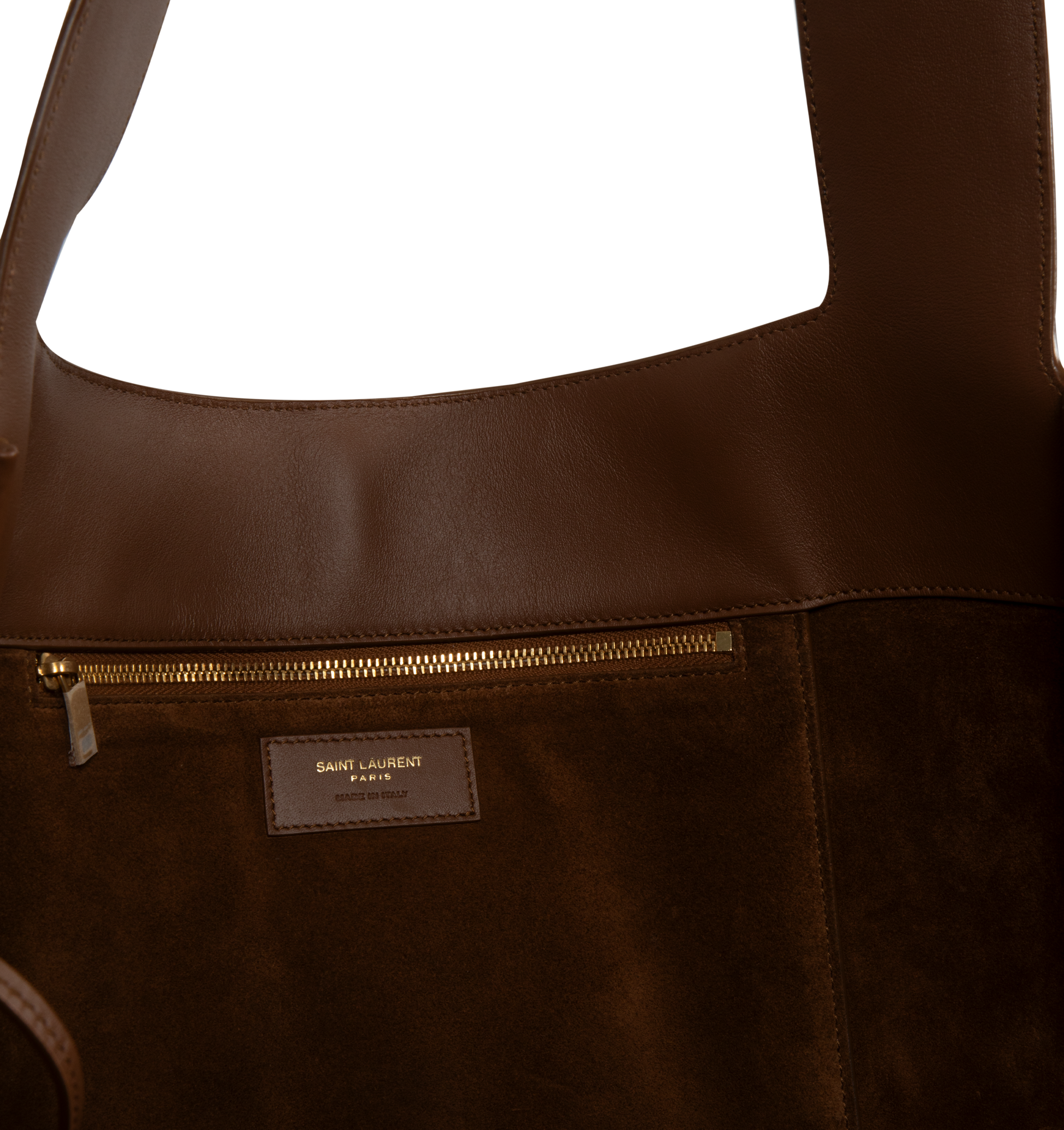 SAINT LAURENT Le 5 à 7 Bea Suede Bag featuring supple tote in suede, lightweight and fully lined in tonal suede, inner zip pocket, leather tab closure decorated with the cassandre, east/west format and inner ties allow the sides to be collapsed or expanded to create different silhouettes. 19.7" x 11" x 7.1". Calfskin.