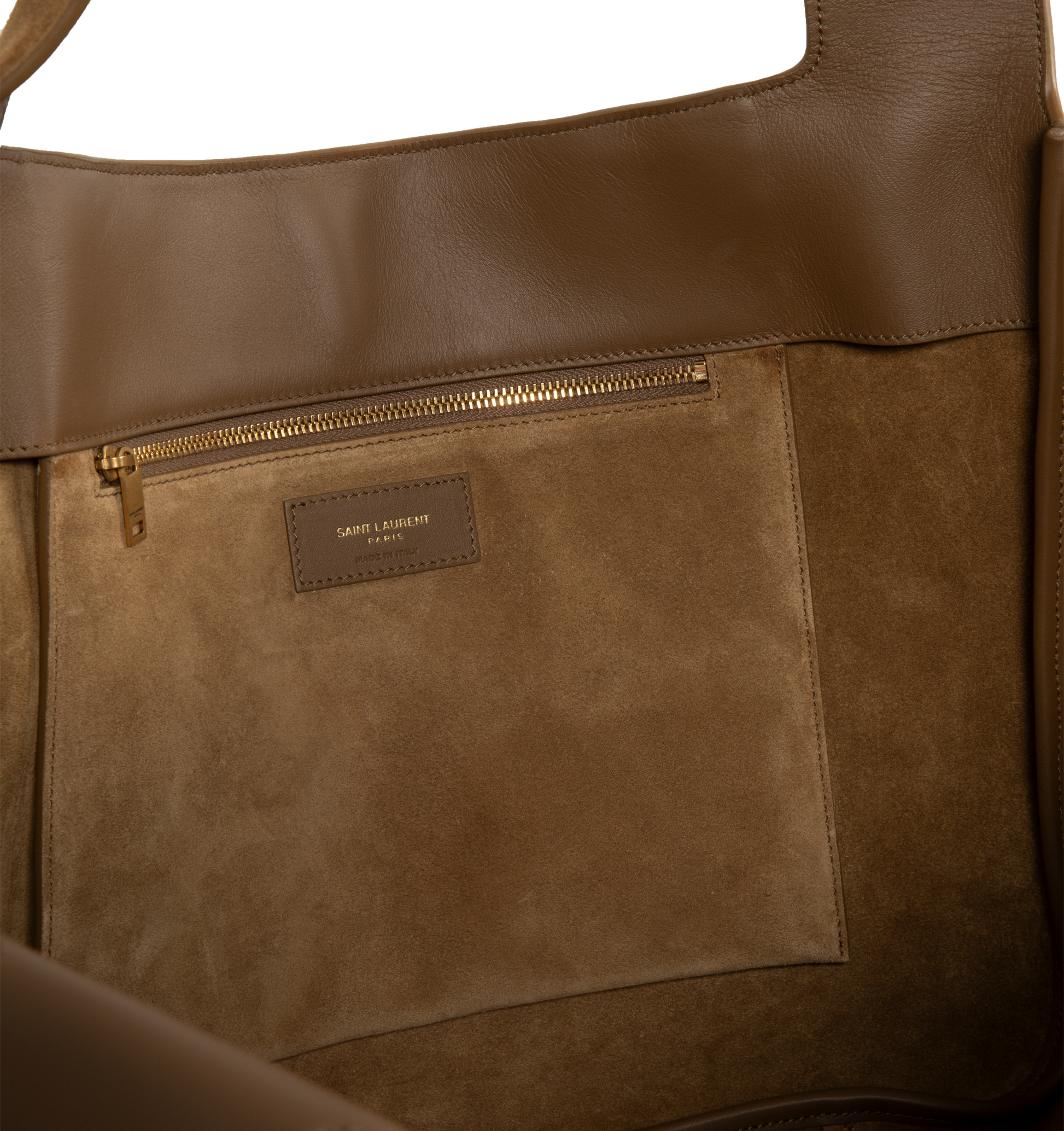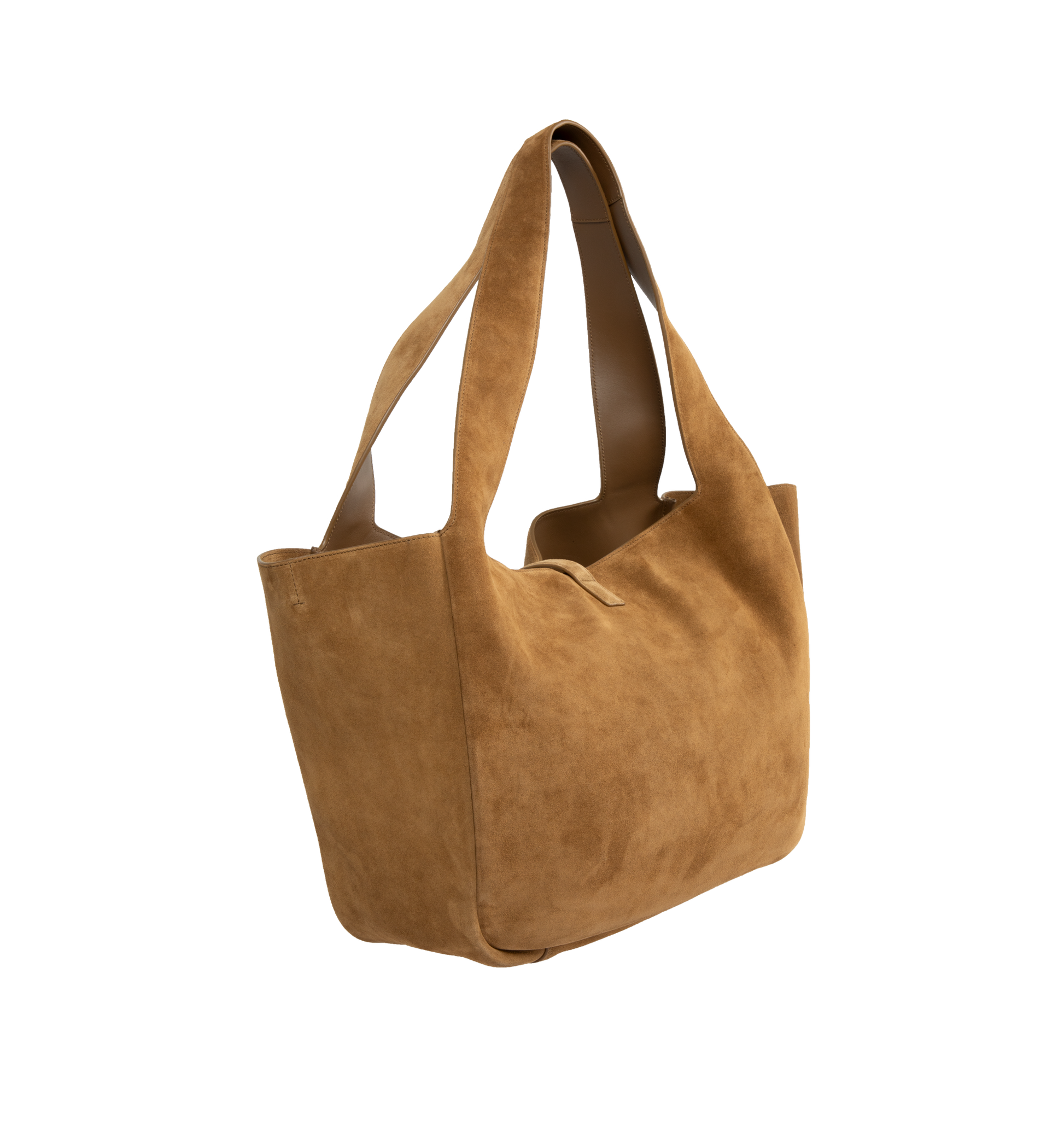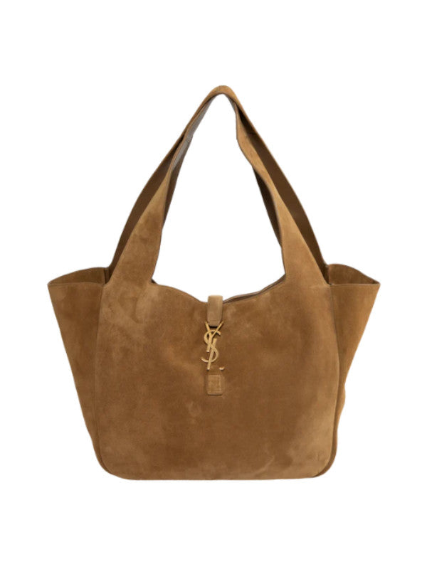 SAINT LAURENT Le 5 à 7 Bea Suede Bag featuring supple tote in suede, lightweight and fully lined in tonal suede, inner zip pocket, leather tab closure decorated with the cassandre, east/west format and inner ties allow the sides to be collapsed or expanded to create different silhouettes. 19.7" x 11" x 7.1". Calfskin.