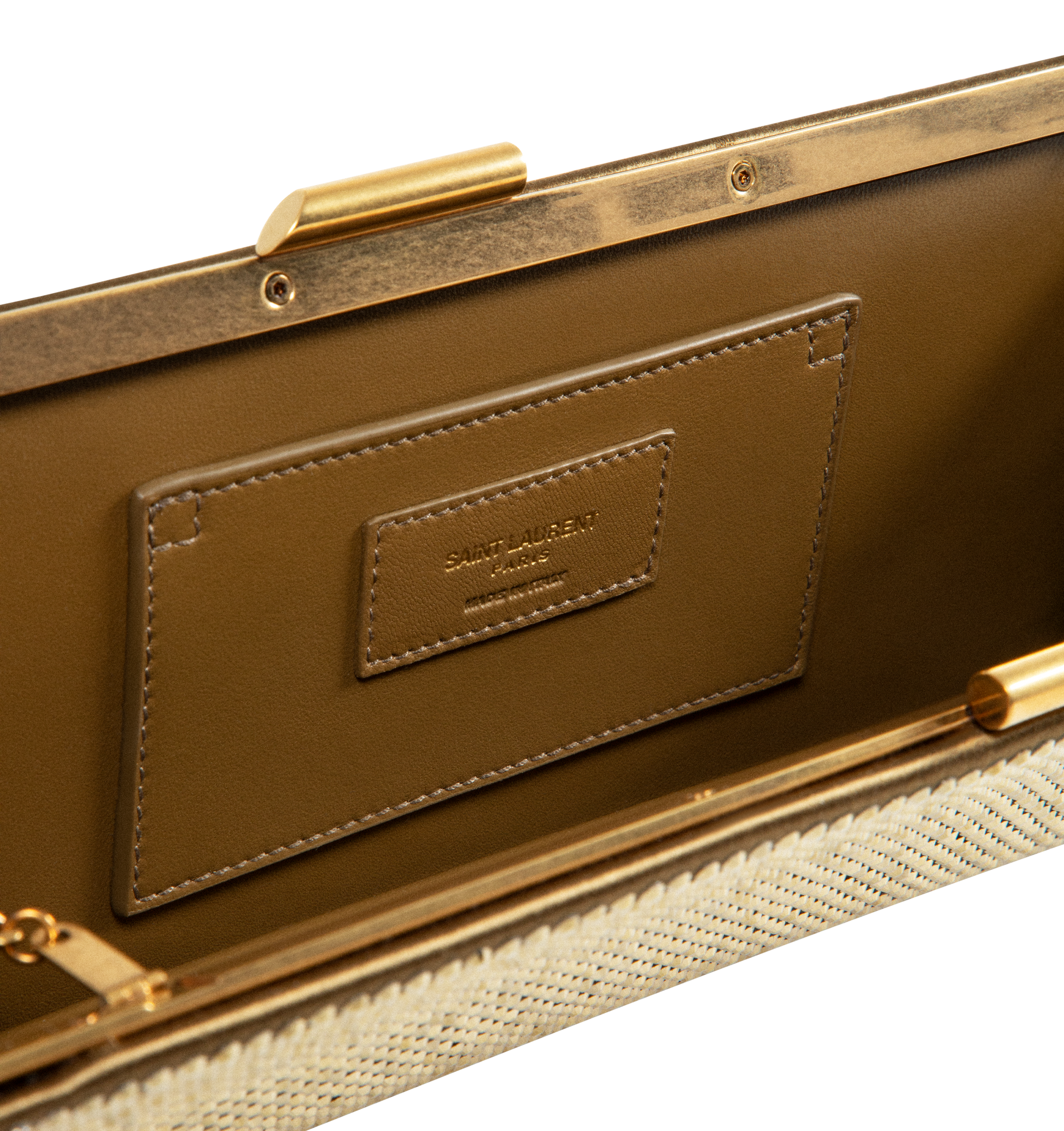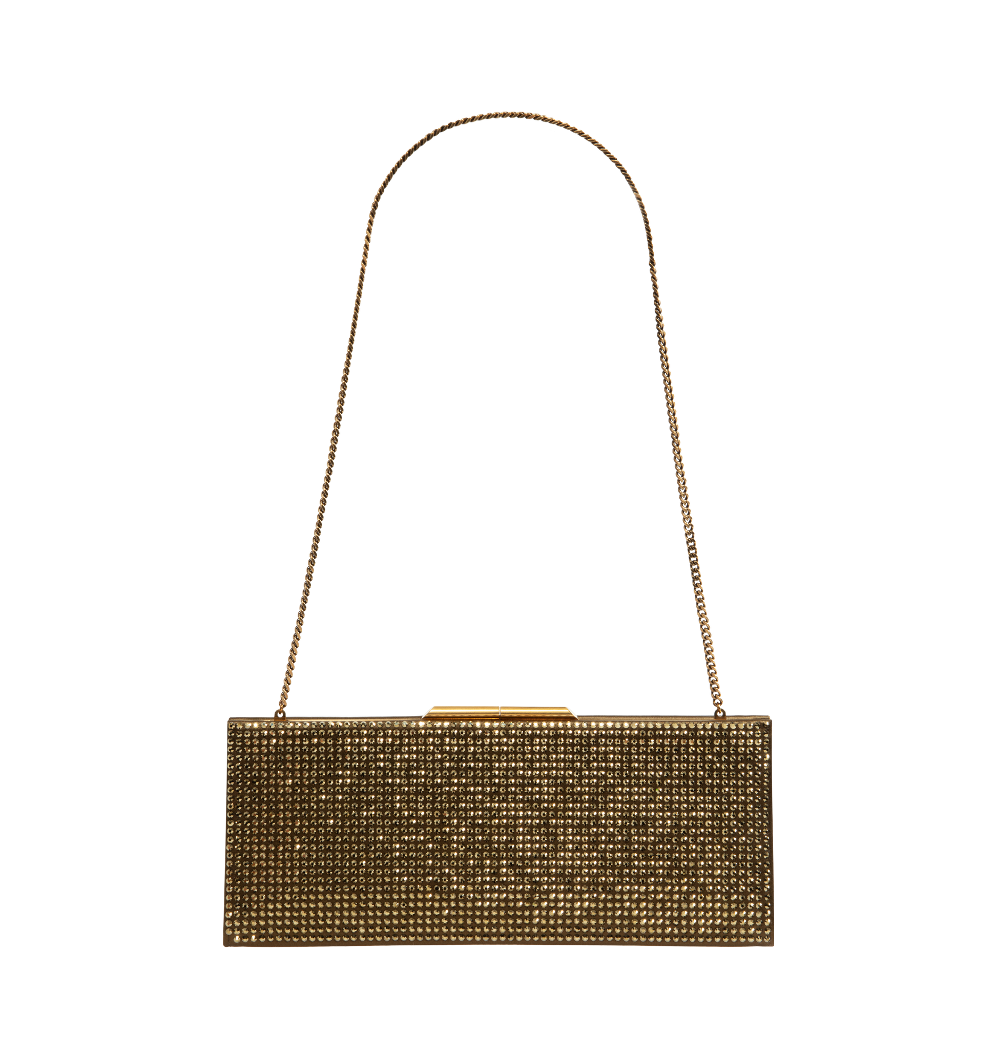 Saint Laurent YSL Midnight Pochette has a rhinestone-covered exterior, kiss-lock closure, interior card slot, and gold-tone chain shoulder strap. W 10.2 x H 3.9 x D 1.6 inches.  Leather lining.
