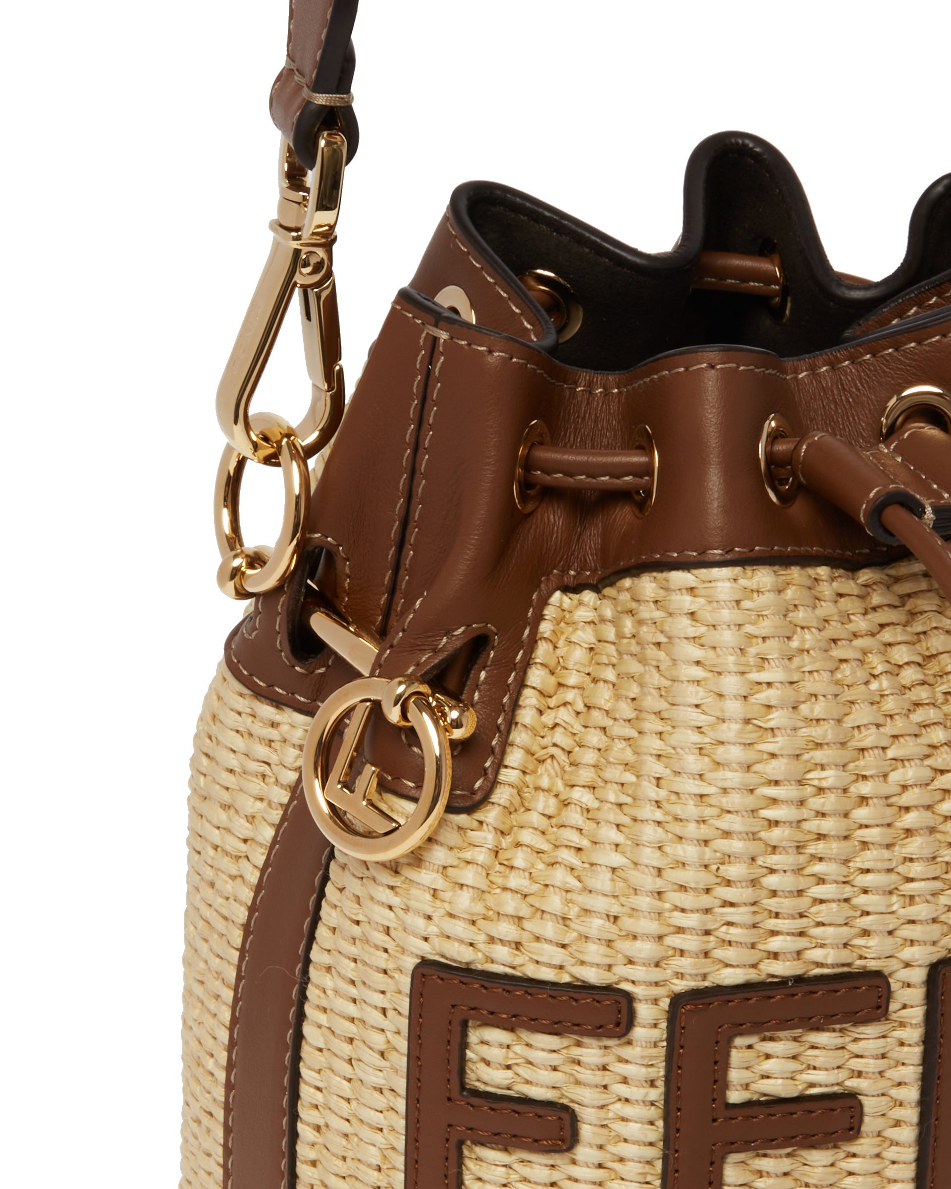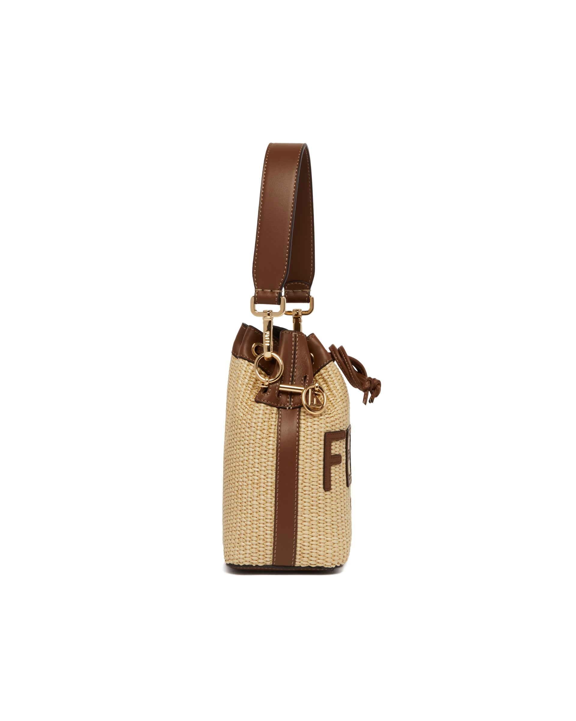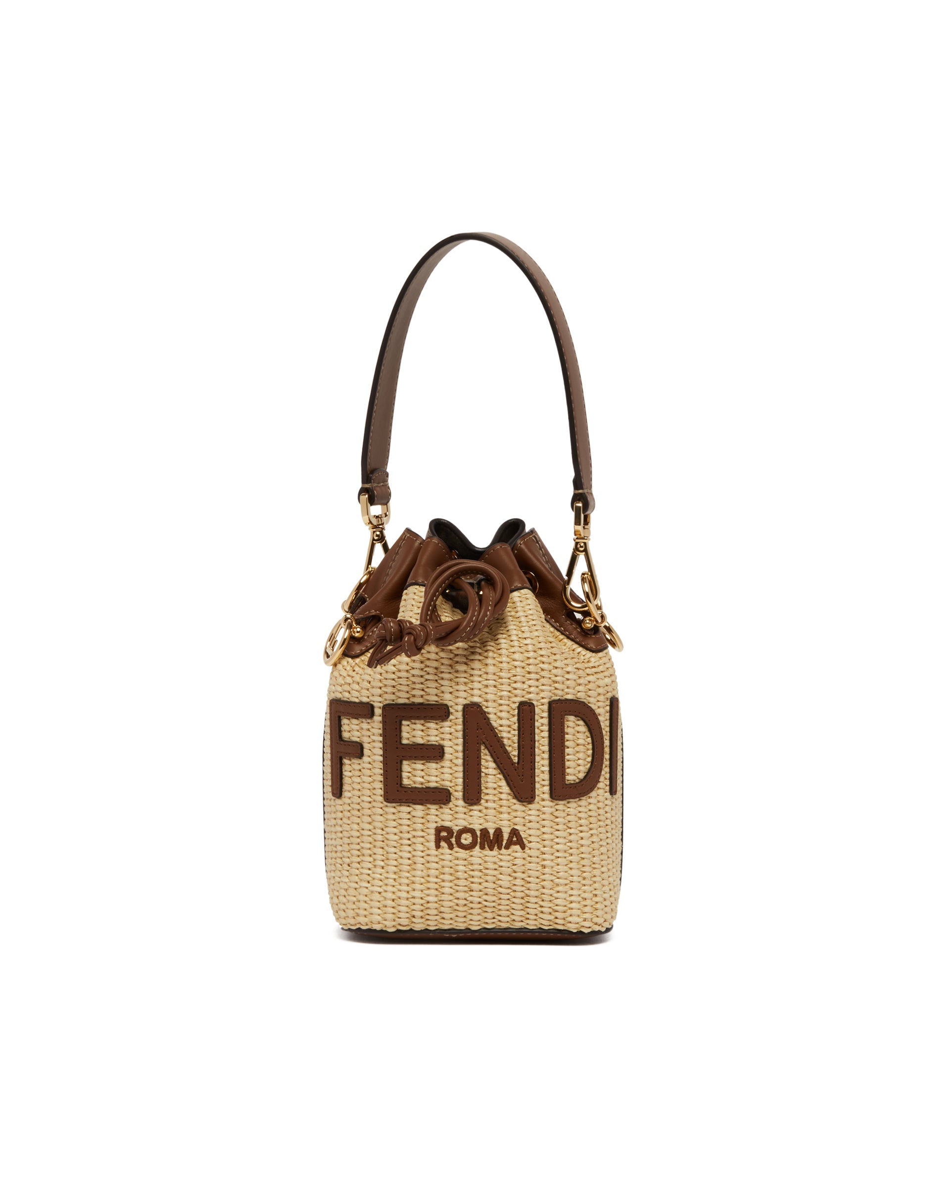 Fendi Mon Tresor Natural raffia mini-bag. Natural-coloured woven raffia, brown leather insert and brown leather logo lettering. Gold-finish hardware, two detachable shoulder straps, one long and one short, fully lined. Size (cm): 14X18X12