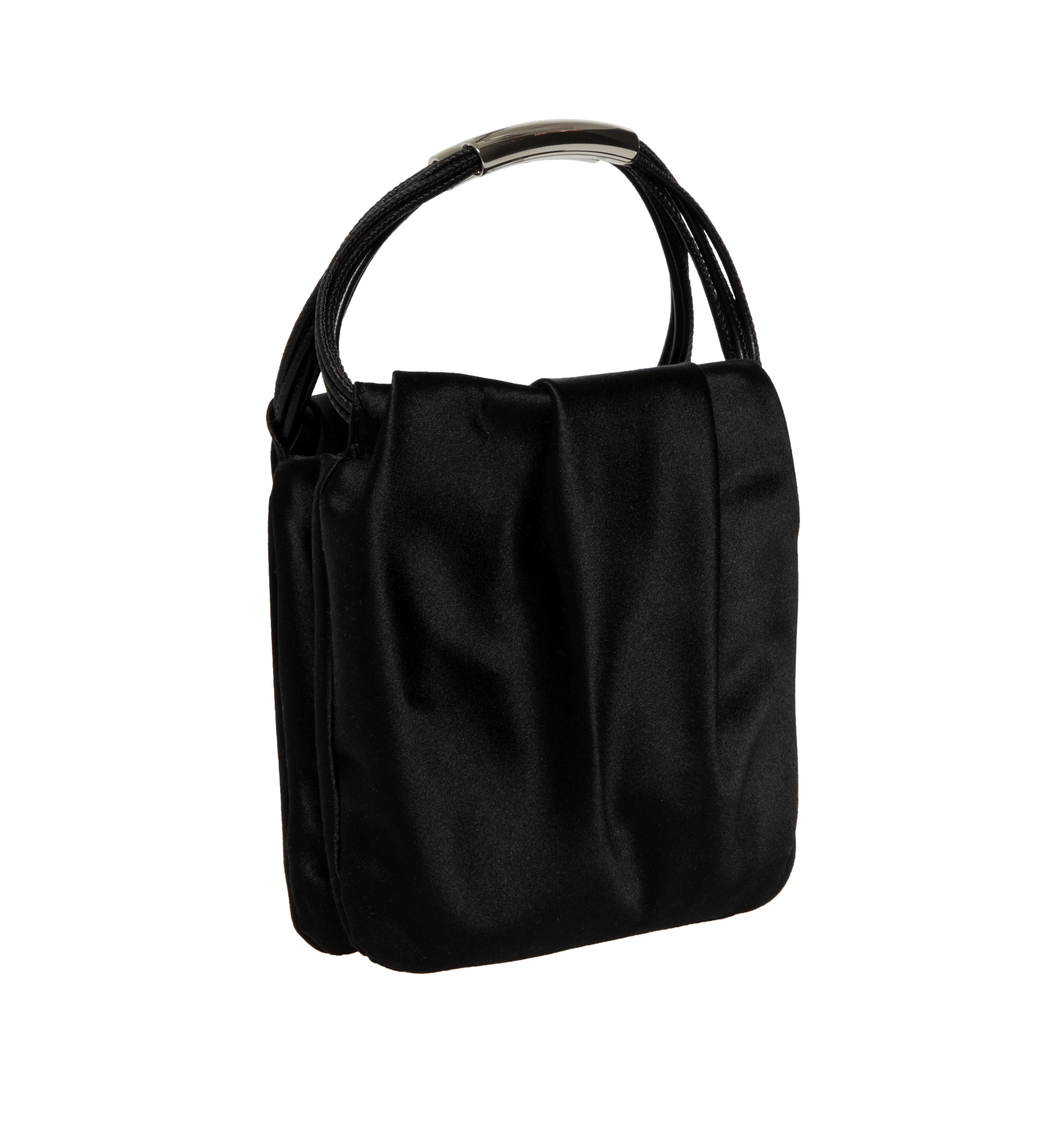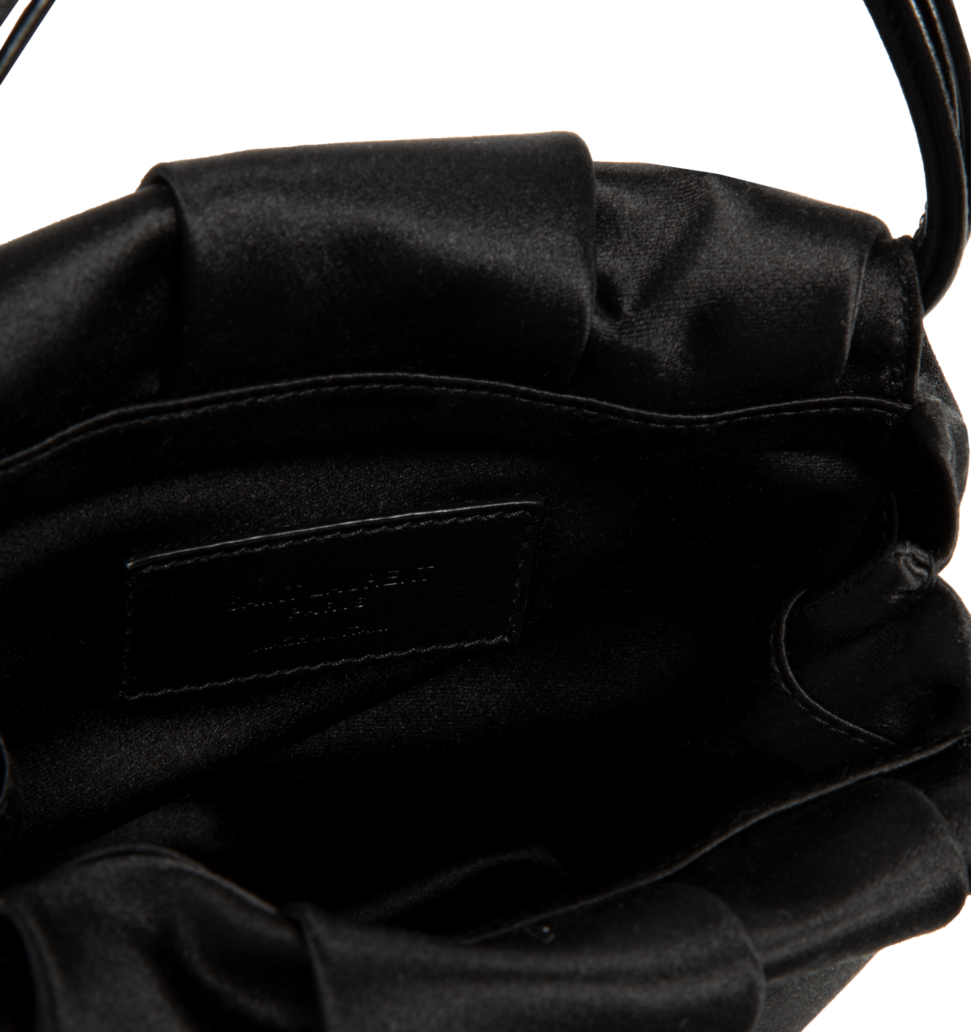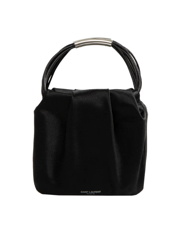 SAINT LAURENT Pochon Mini Top-Handle Bag in Satin Silk featuring strappy top handles, open top with magnetic closure, fully lined and silver-tone hardware. 5.5"H x 5.5"W x 1.2"D. Satin viscose, silk. Made in Italy.
