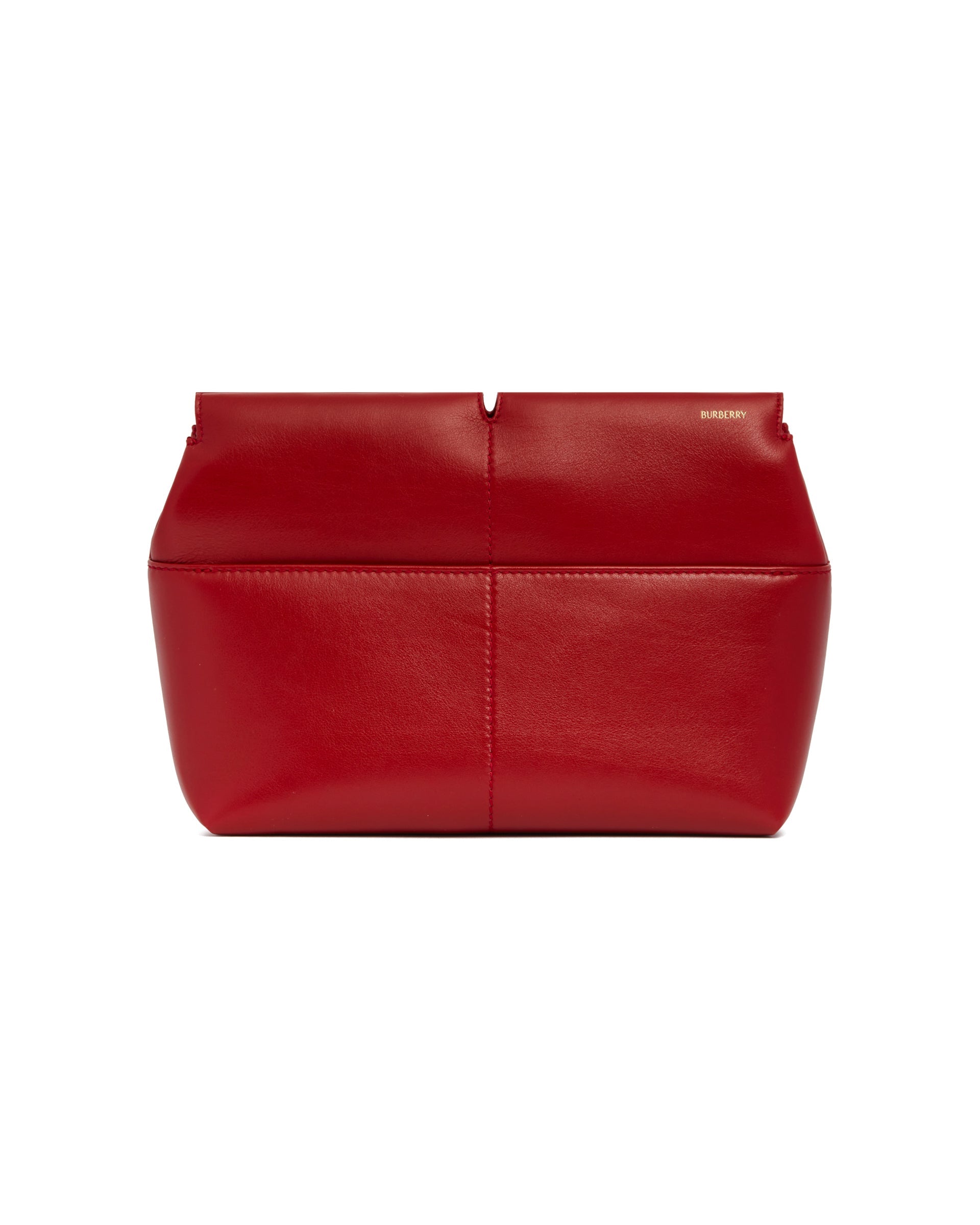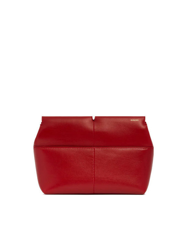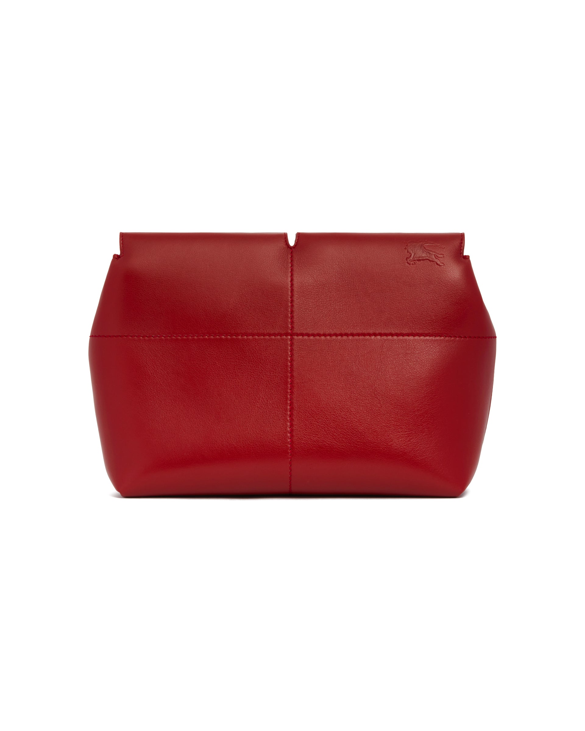 Burberry Red Snip Leather Clutch. Red leather, magnetic closure, external snap pocket with magnetic closure and internal snap pocket. Equestrian Knight Design embossed on the front with a textured leather interior. B-cut metal accents and a detachable chain strap. Size (cm): 30.5X21X10.5