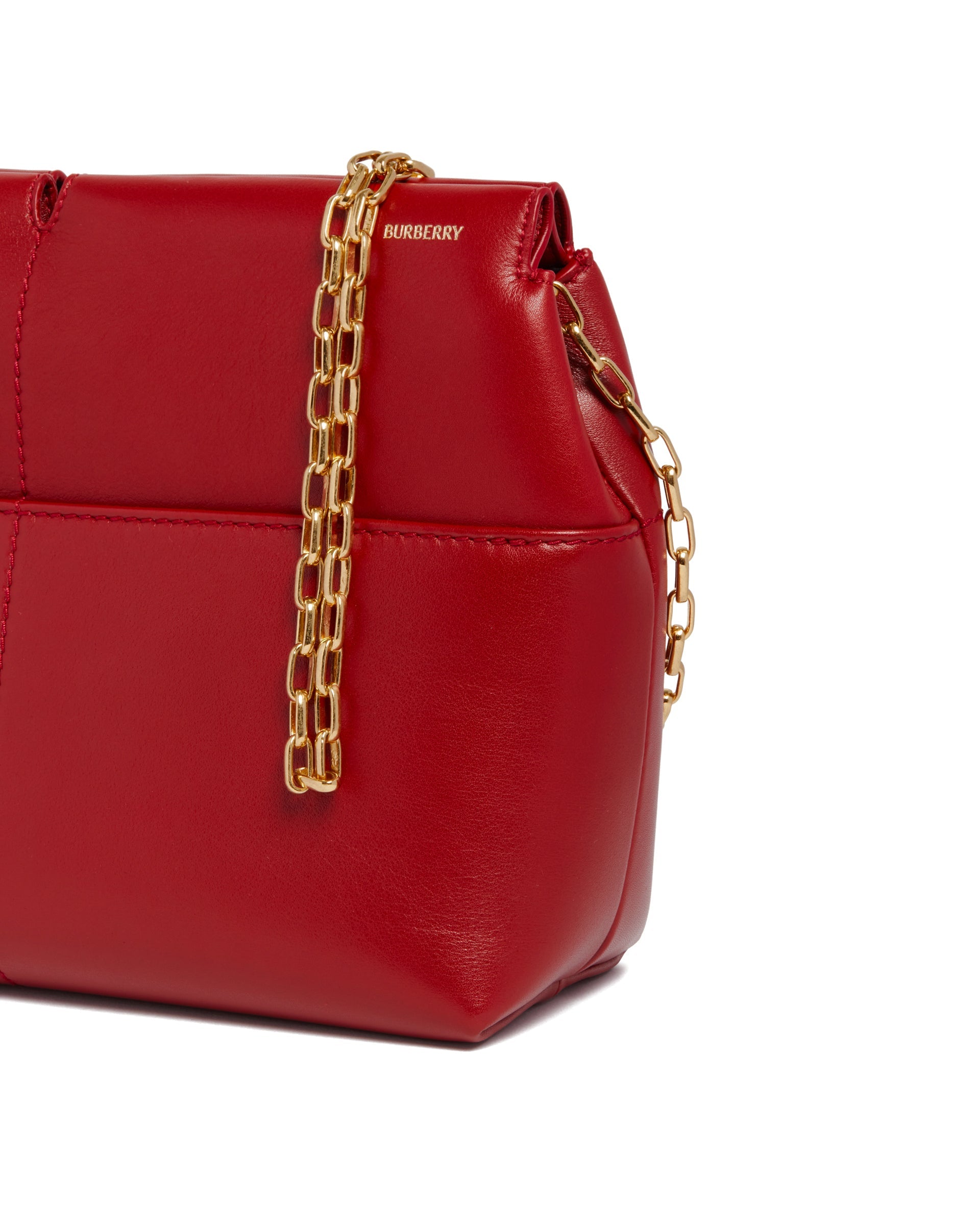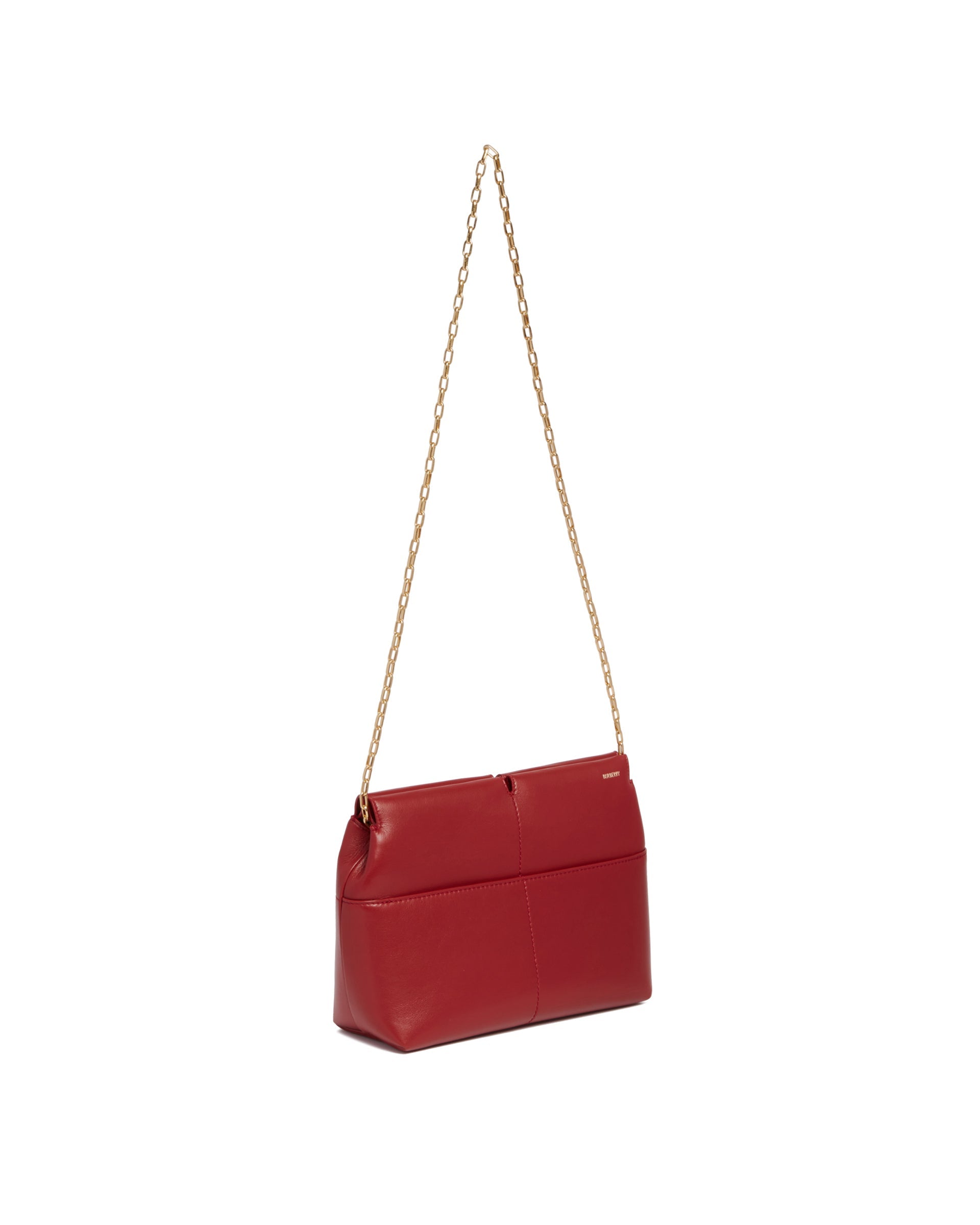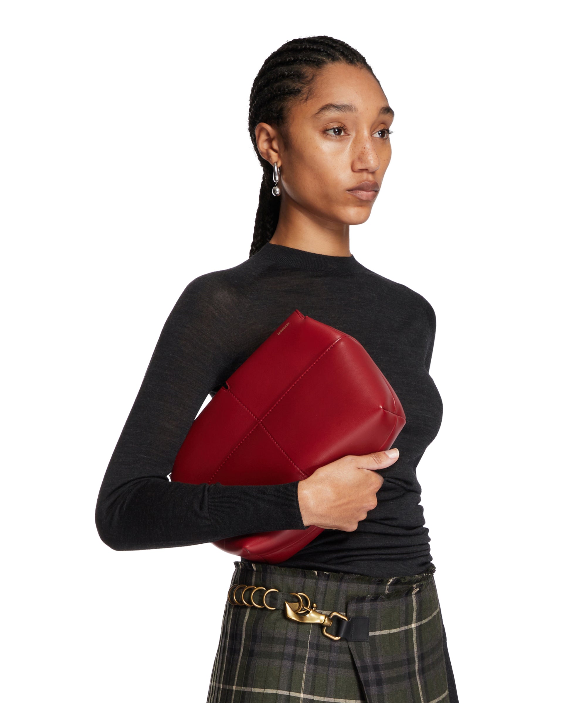 Burberry Red Snip Leather Clutch. Red leather, magnetic closure, external snap pocket with magnetic closure and internal snap pocket. Equestrian Knight Design embossed on the front with a textured leather interior. B-cut metal accents and a detachable chain strap. Size (cm): 30.5X21X10.5