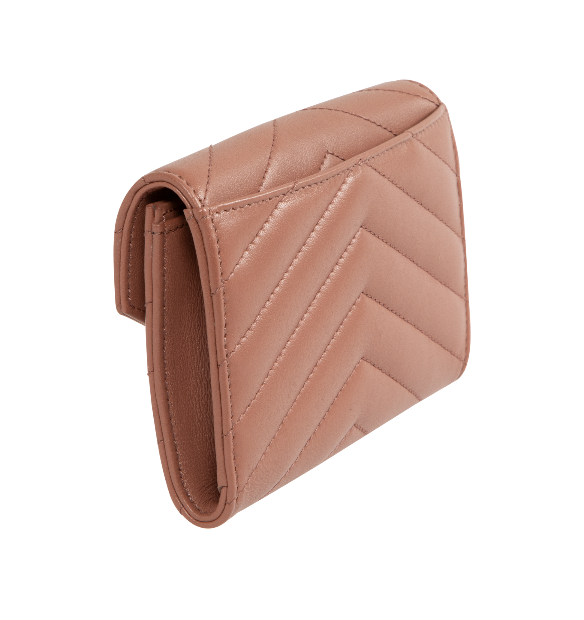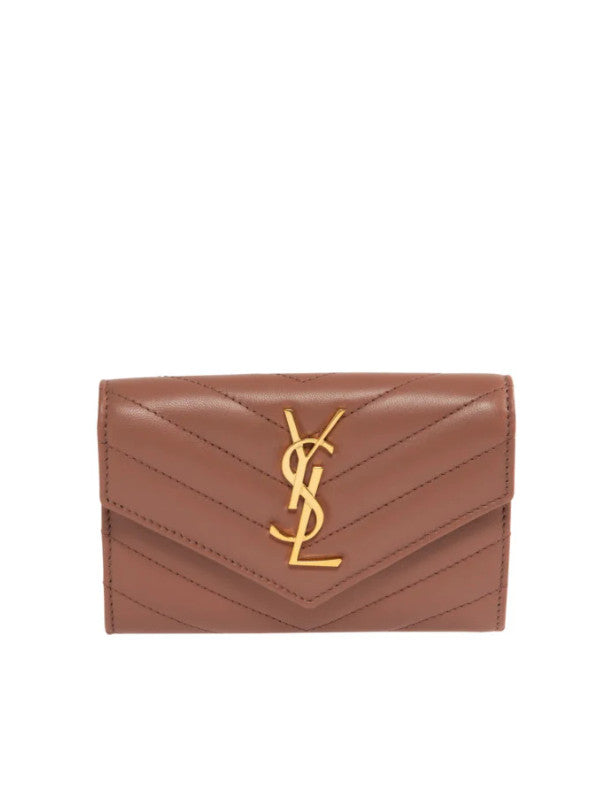 SAINT LAURENT Small Envelope Wallet featuring quilted overstitching, leather lining, snap button closure, one flat pocket at back, four card slots and one open compartment. 5.3" X 3.7" X 1.2". 100% lambskin.