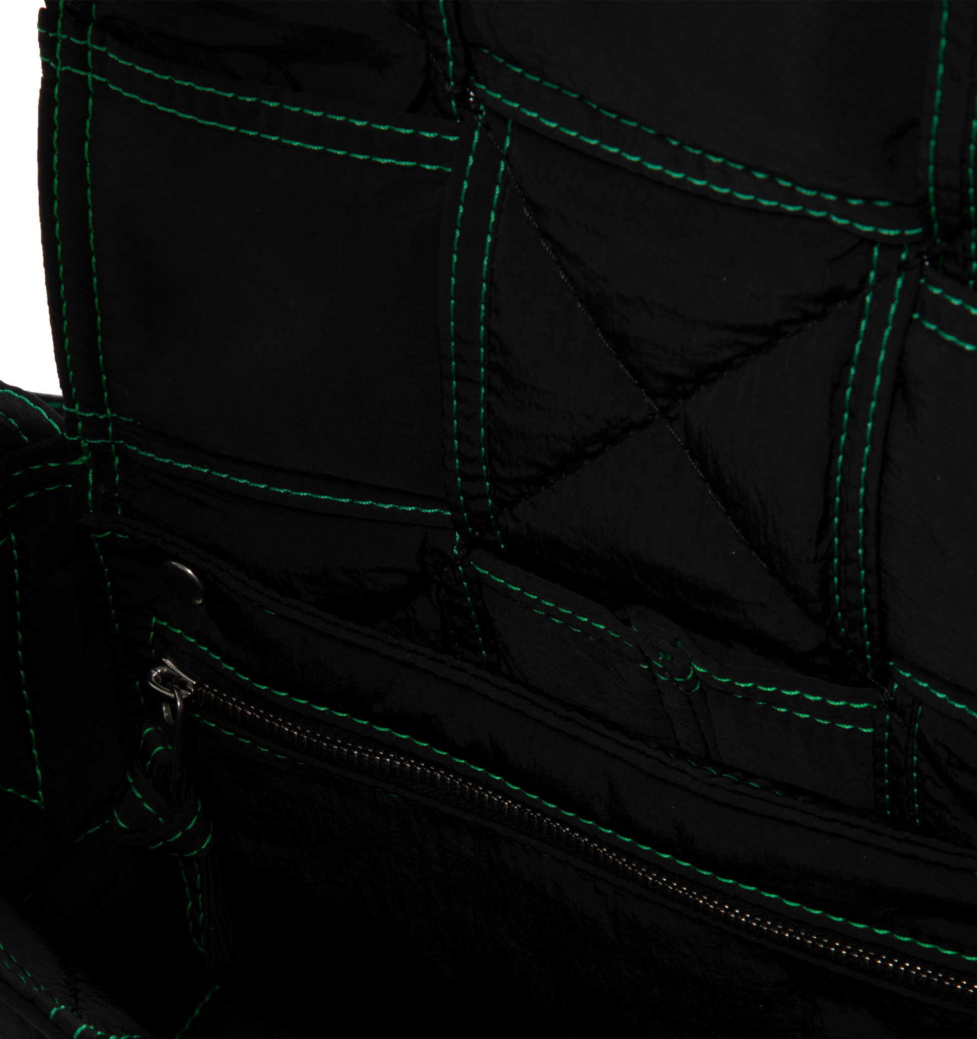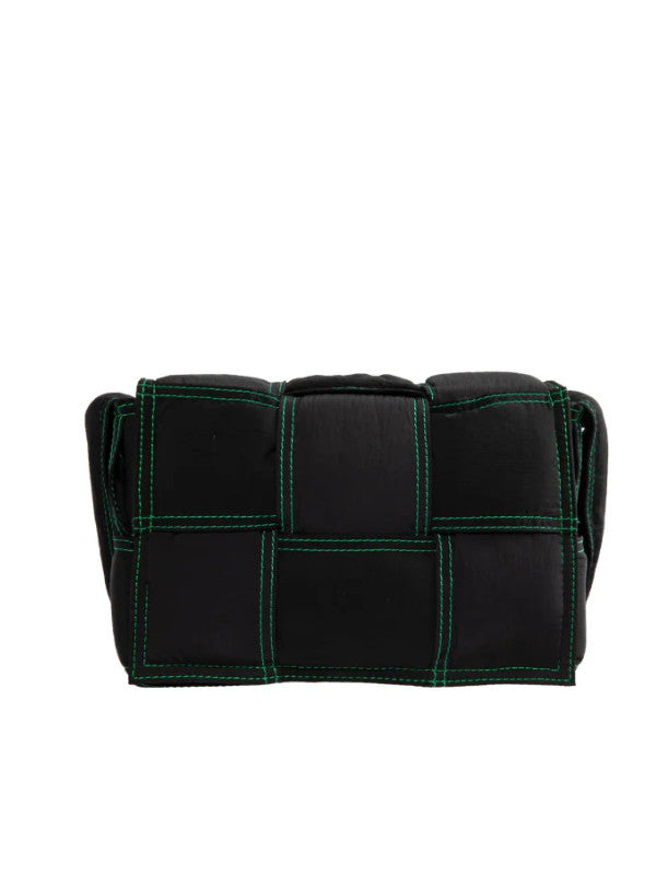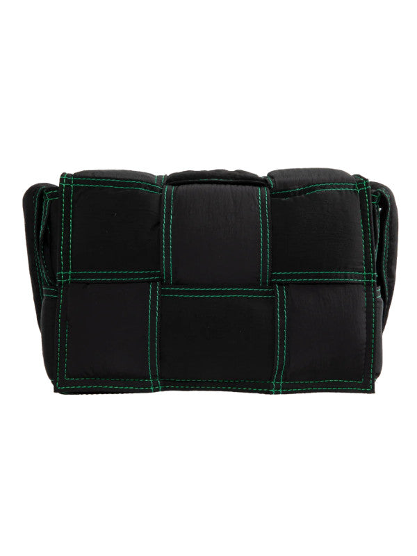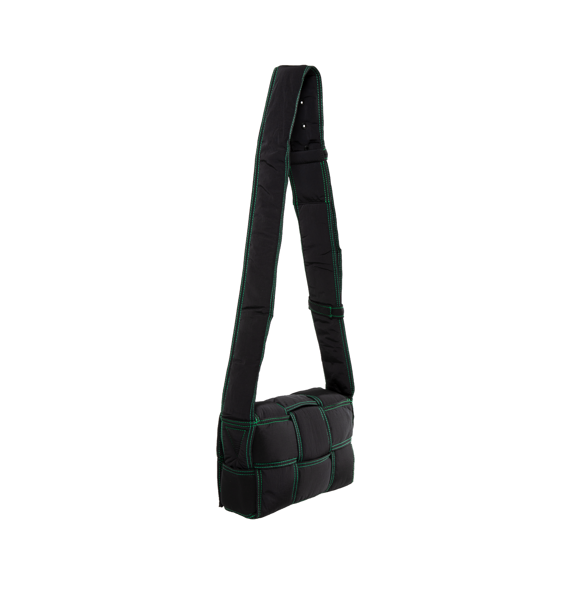 BOTTEGA VENETA Small Padded Tech Cassette Bag featuring cross-body bag in lightweight padded nylon Intreccio with edge stitching detail, single interior zipped pocket and magnetic closure. 5.5" x 9.1" x 3". Polyamide.