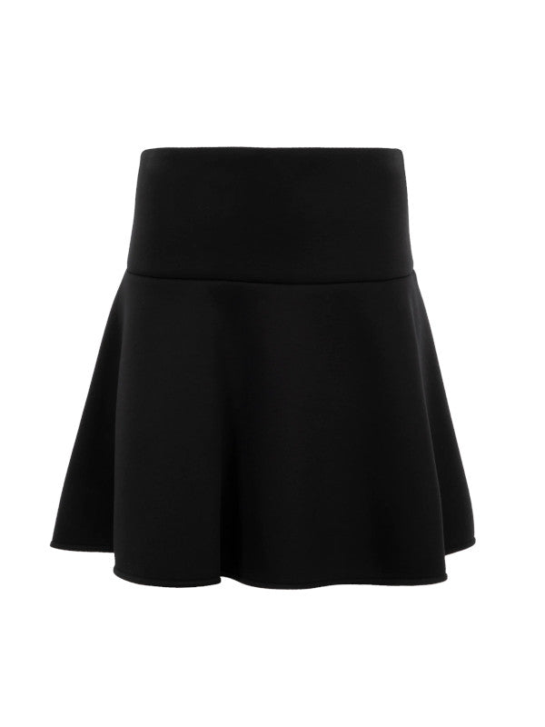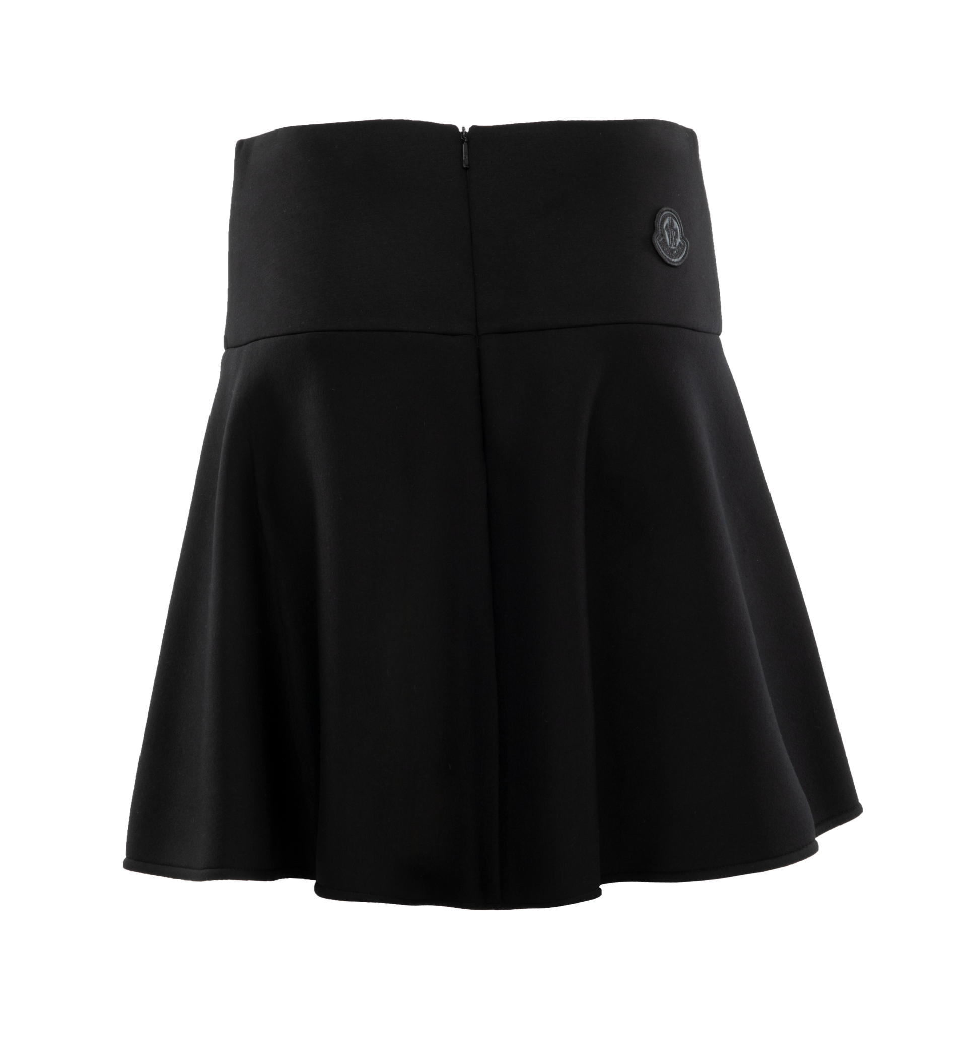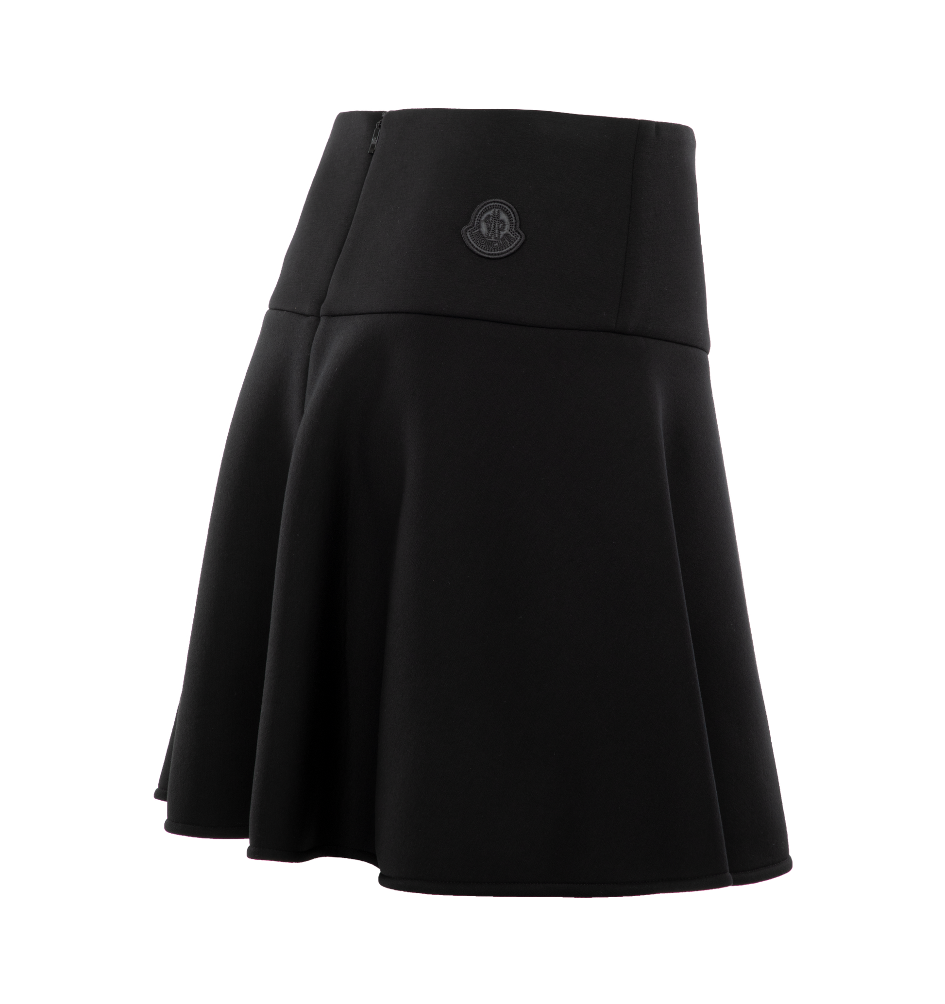 MONCLER Neoprene Lined Flared Mini Skirt featuring high-rise waistband, neoprene lined, tonal back logo patch, hem falls above the knee, circle-cut silhouette and center back zipper. 100% viscose. Made in Italy.