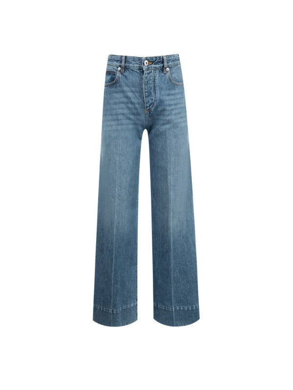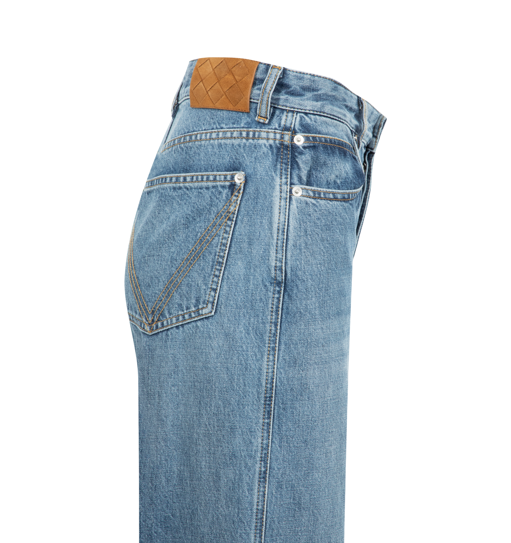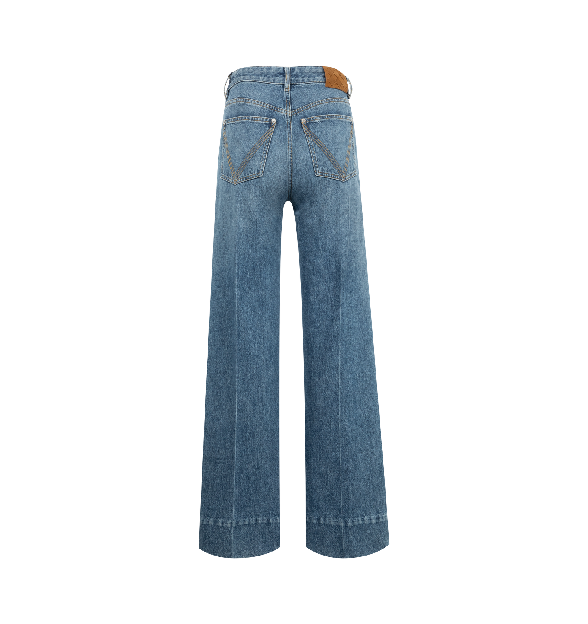 Bottega Veneta denim Palazzo Jeans featuring a mid-rise design, belt loops, a zip and button fastening, a classic five pocket design and a logo label on the back. 100% cotton. Made in Italy.