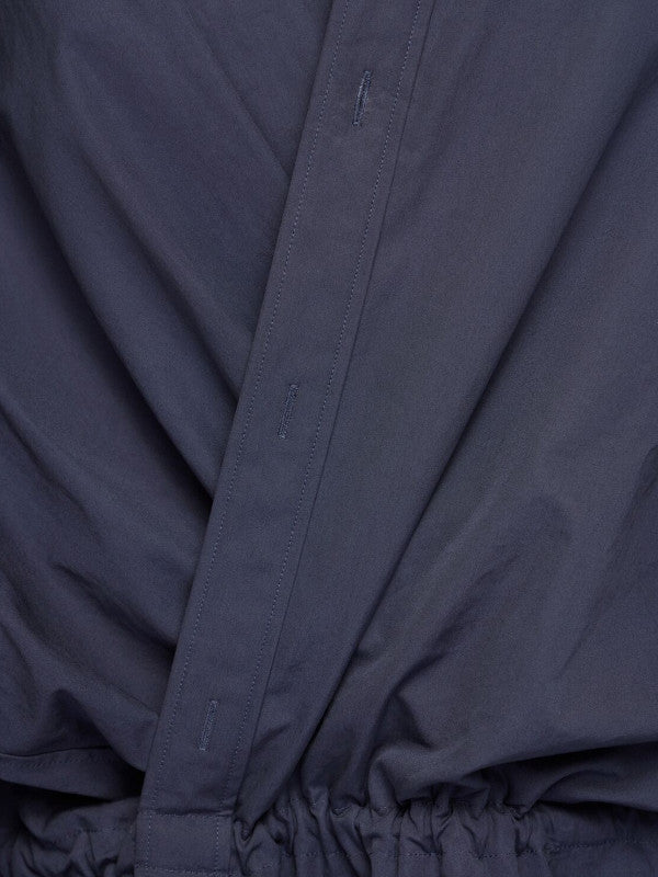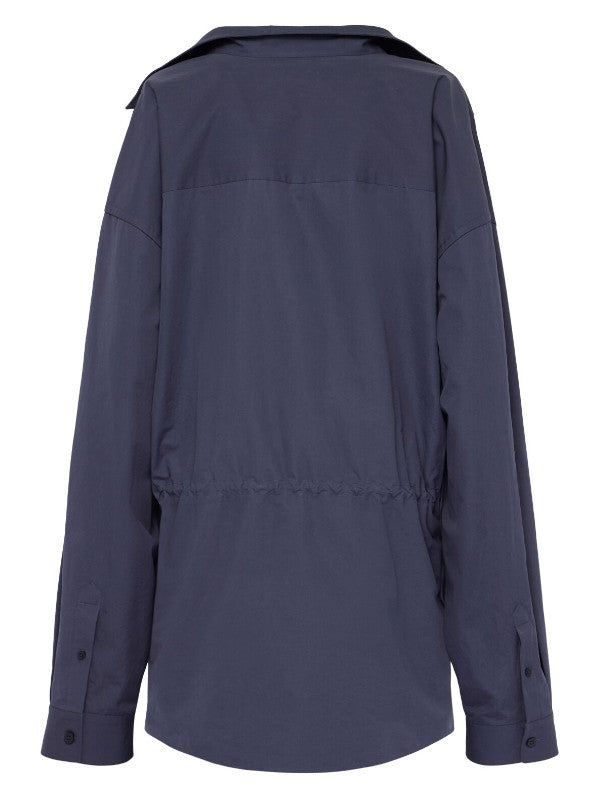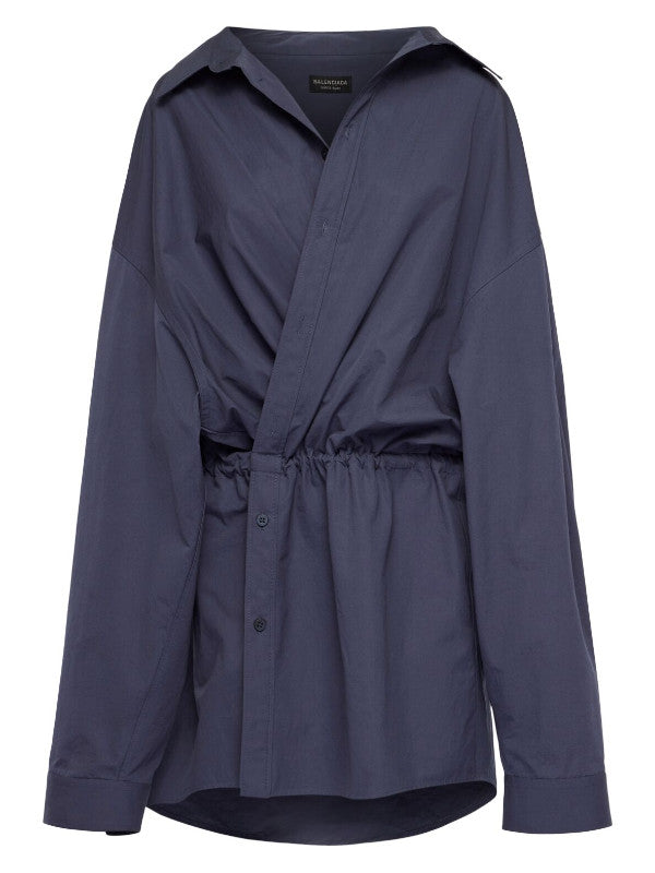 Effortlessly chic, the Balenciaga Gathered Wrap Shirt redefines classic tailoring with a modern twist. Crafted from deep navy cotton, this shirt features a wrap-effect front with an elasticated waist for a flattering silhouette. The oversized fit, dropped shoulders, and exaggerated cuffs add a touch of contemporary sophistication. Perfect for both office wear and casual outings, pair it with tailored trousers or slim-fit jeans for a polished yet relaxed look.