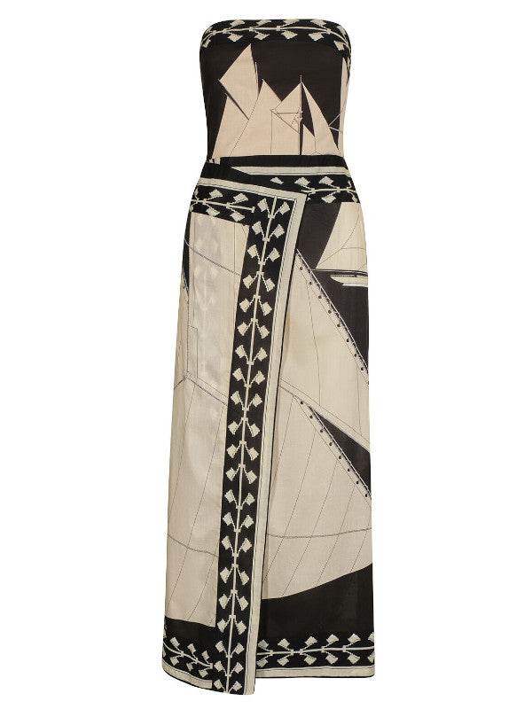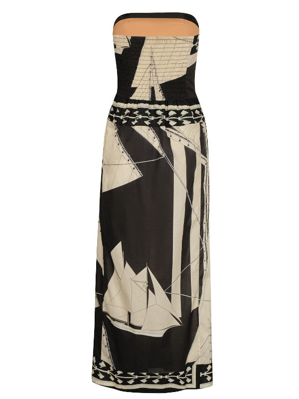 Make a statement with the Johanna Ortiz Strapless Printed Maxi Dress. Featuring an intricate black-and-beige geometric print, this flowing dress is crafted from lightweight fabric for effortless elegance. The strapless design highlights the neckline, while the floor-length silhouette adds drama and sophistication. Perfect for formal events or summer soirées, pair it with minimal jewelry and heels to complete the look.
