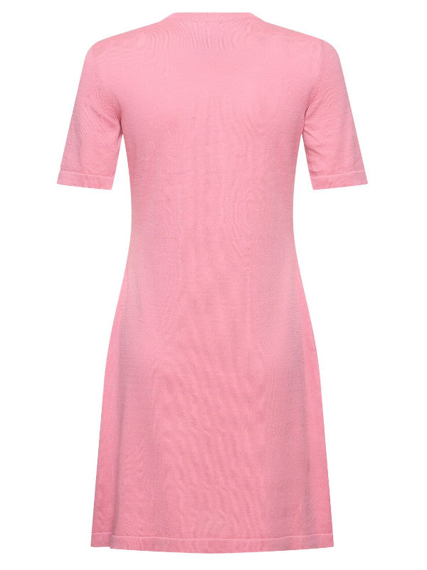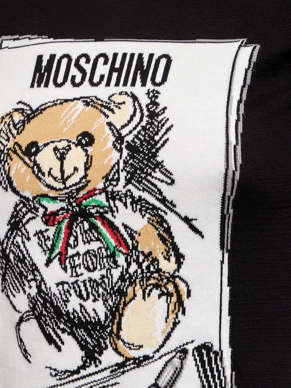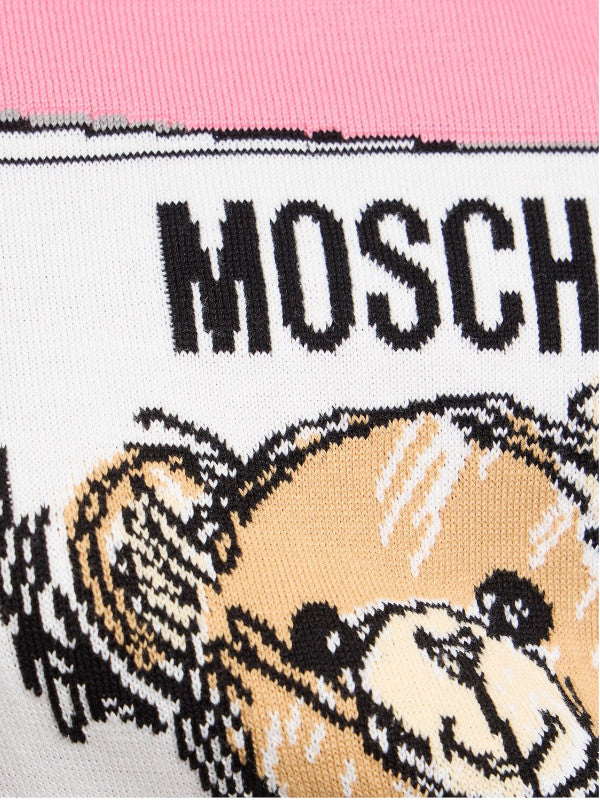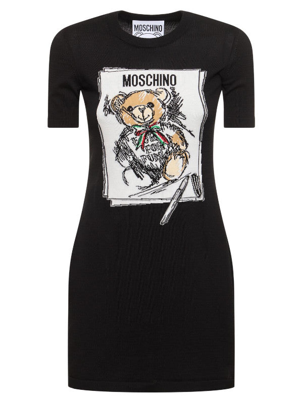 Playful yet chic, this Moschino Teddy Bear Graphic Knit Dress is crafted from soft black/pink knit fabric for a comfortable fit. It features the brand's signature teddy bear graphic on the front, accented with artistic sketch-style details and vibrant colors. The short sleeves and above-the-knee length make it a versatile option for casual outings or fun evening events. Style it with sneakers or ankle boots for a youthful, trendy vibe.