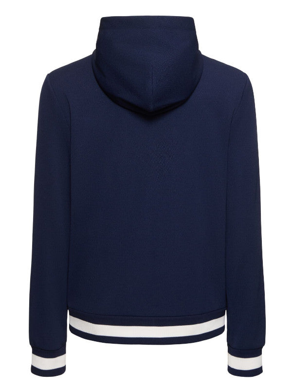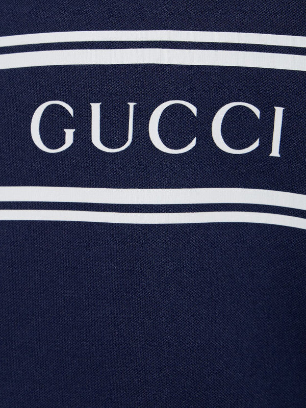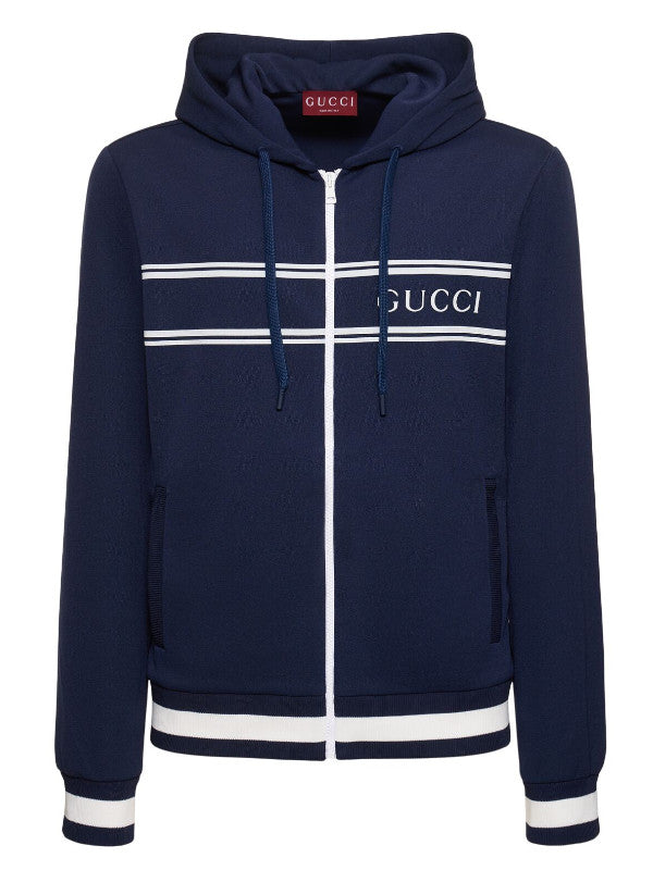 Upgrade your casual wardrobe with this Gucci Striped Logo Zip-Up Hoodie. Crafted in a rich navy hue, this hoodie features bold white stripes across the chest and sleeves, accentuating its sporty yet refined design. The iconic Gucci logo is prominently displayed on the front, while the drawstring hood and ribbed trims ensure a comfortable fit.Made from premium materials, this hoodie is perfect for layering or wearing on its own for a relaxed yet stylish look. Pair it with joggers or jeans for effortless luxury in your everyday attire.