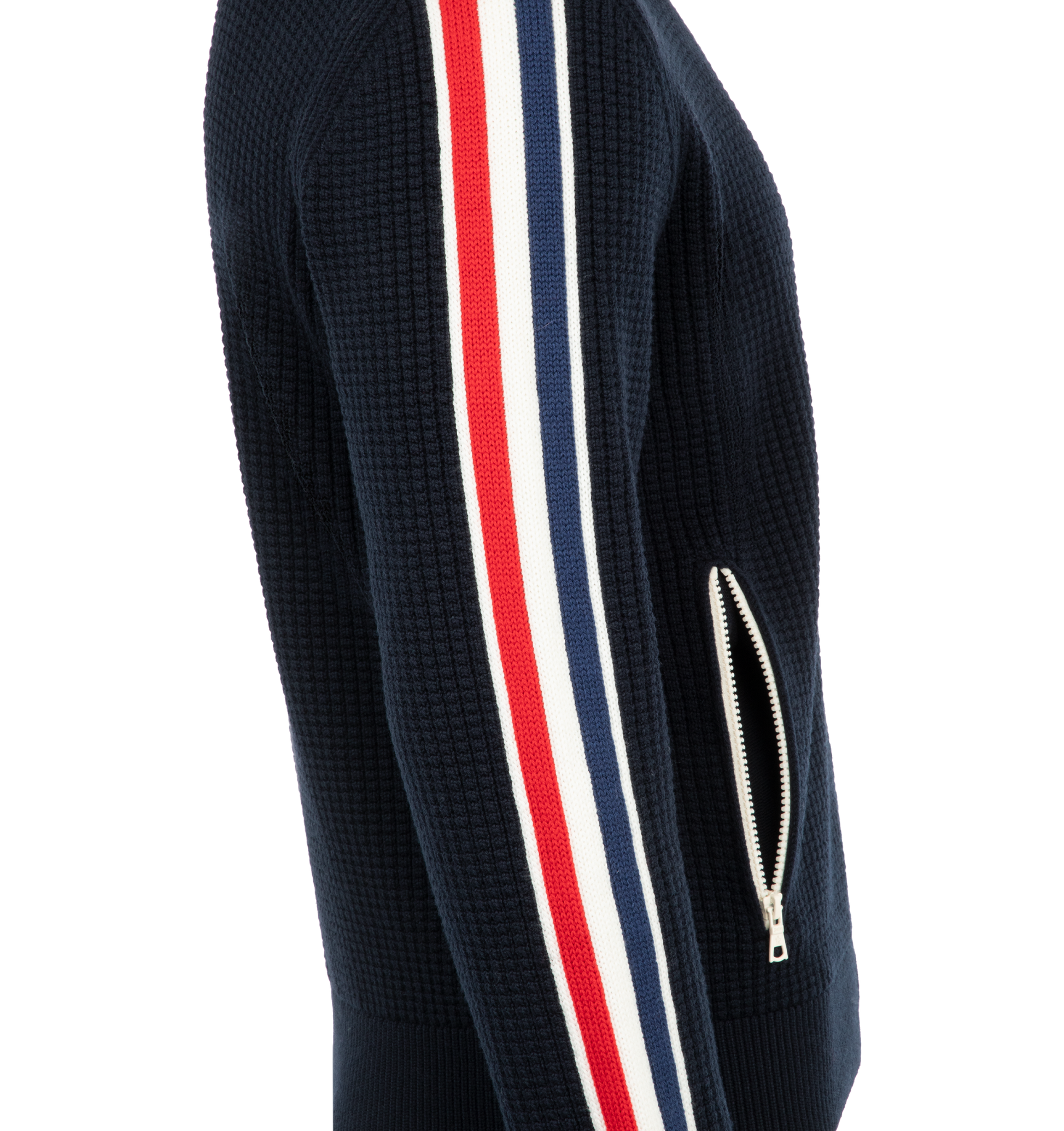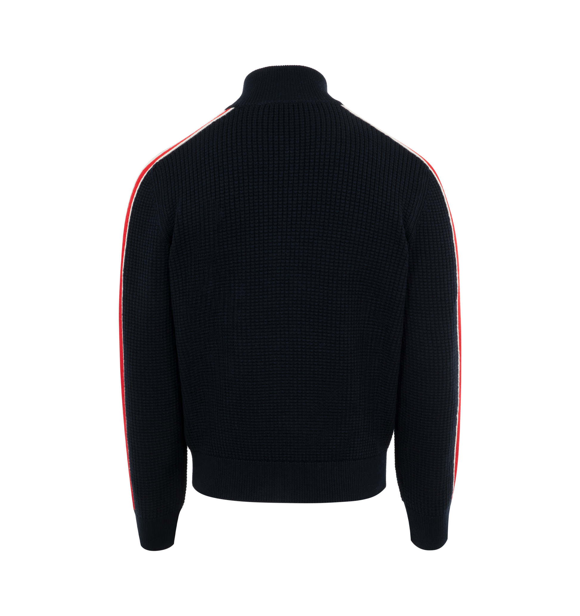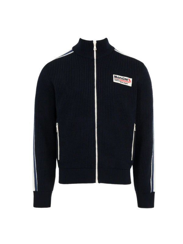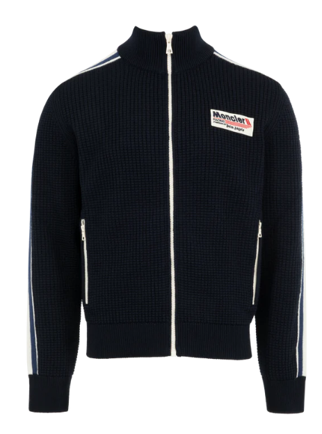 Moncler X Palm Angels Zip-Front Cardigan has a ribbed collar, hem, and cuffs, a zip front closure, a brand logo patch, and 2 front pockets. 69% polyester, 31% cotton.