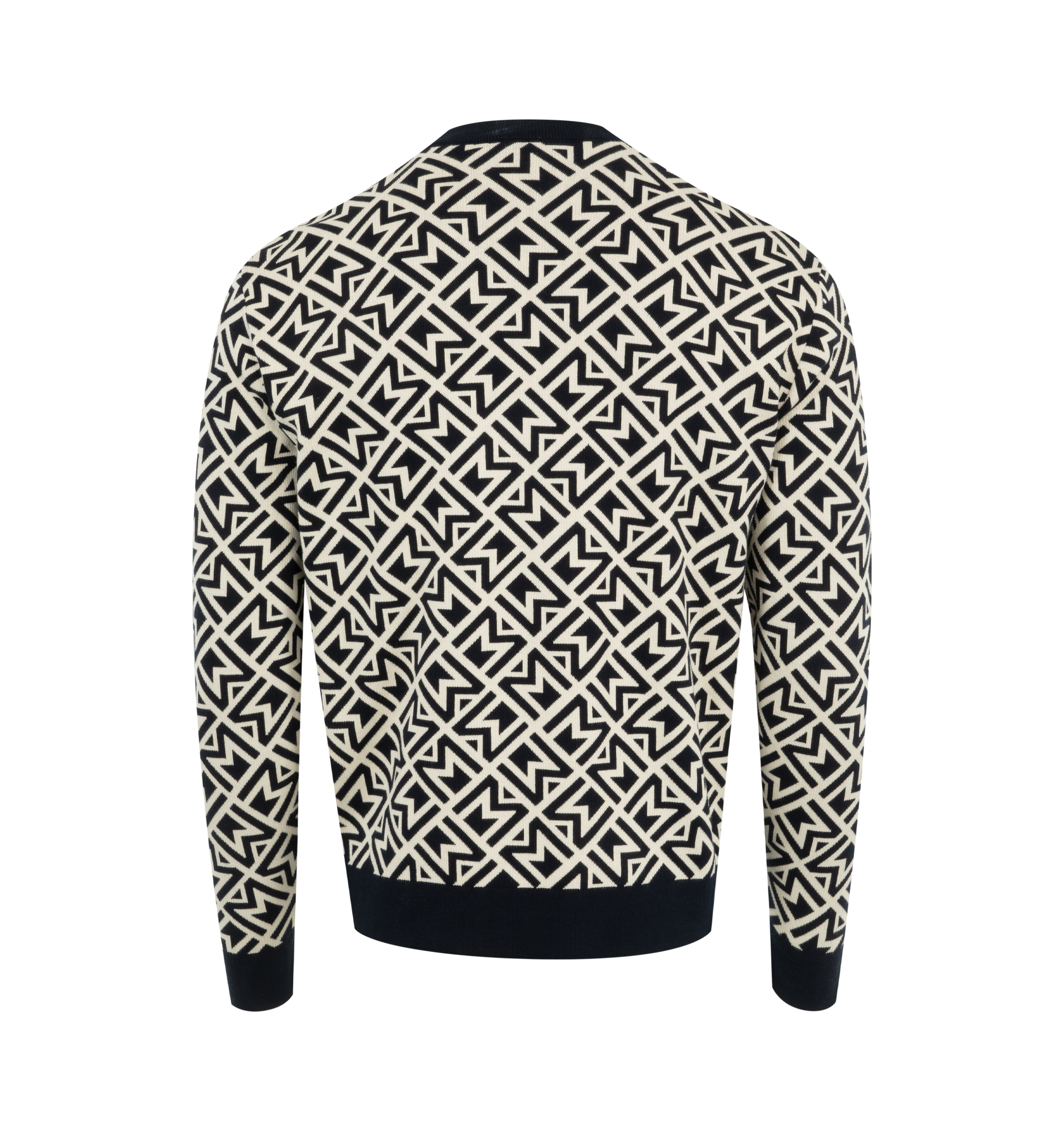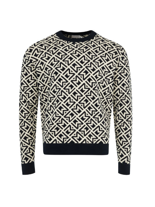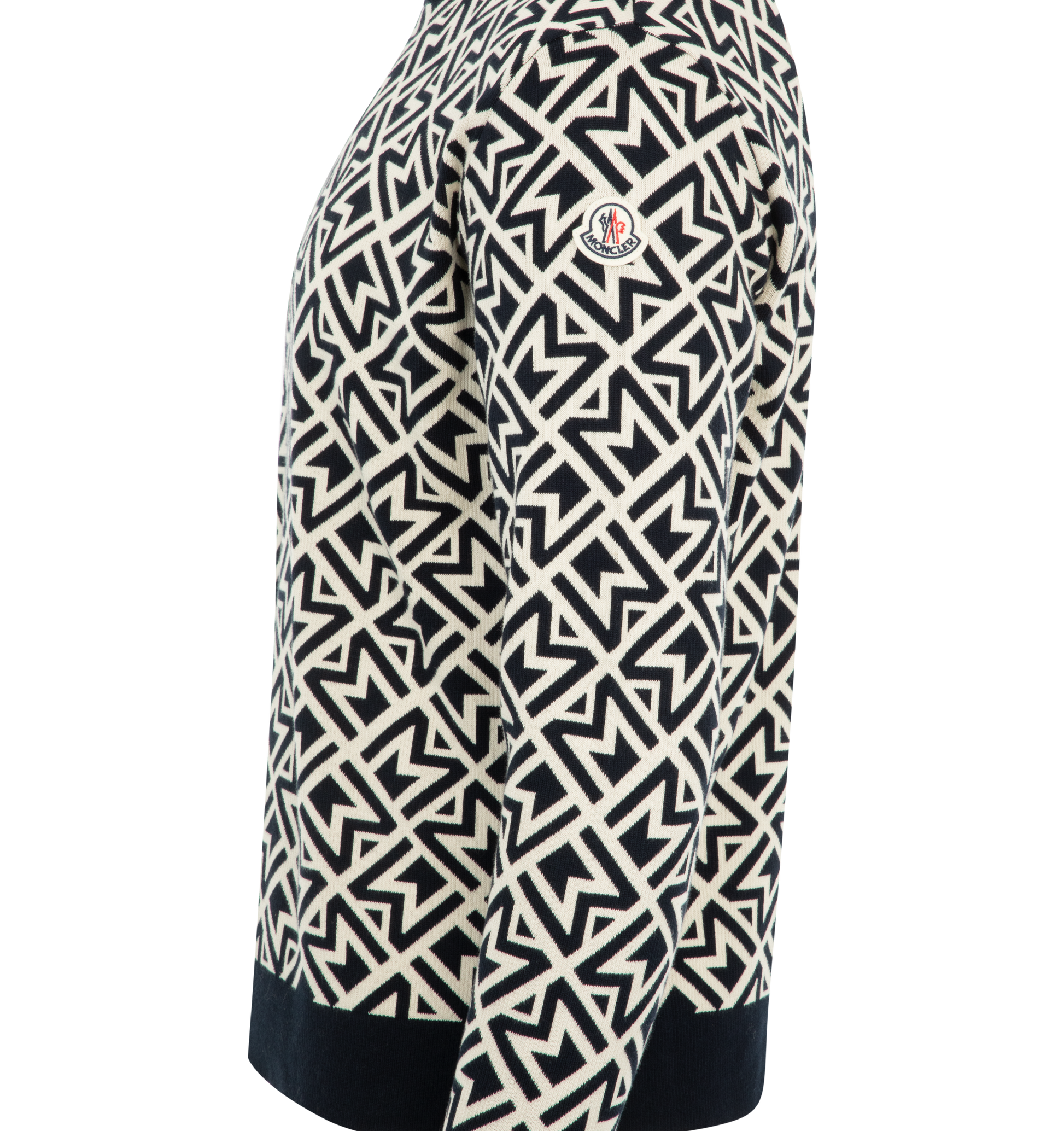 Moncler Monogram Jacquard Sweater has a crew neck, a geometric jacquard knit design, and a boxy waistline. 100% cotton.