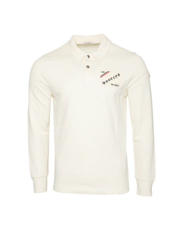 MONCLER Long-Sleeve Polo Sweatshirt featuring a spread collar, two-button placket, brand's logo patch sits at the left chest and rib-knit cuffs. 100% cotton.