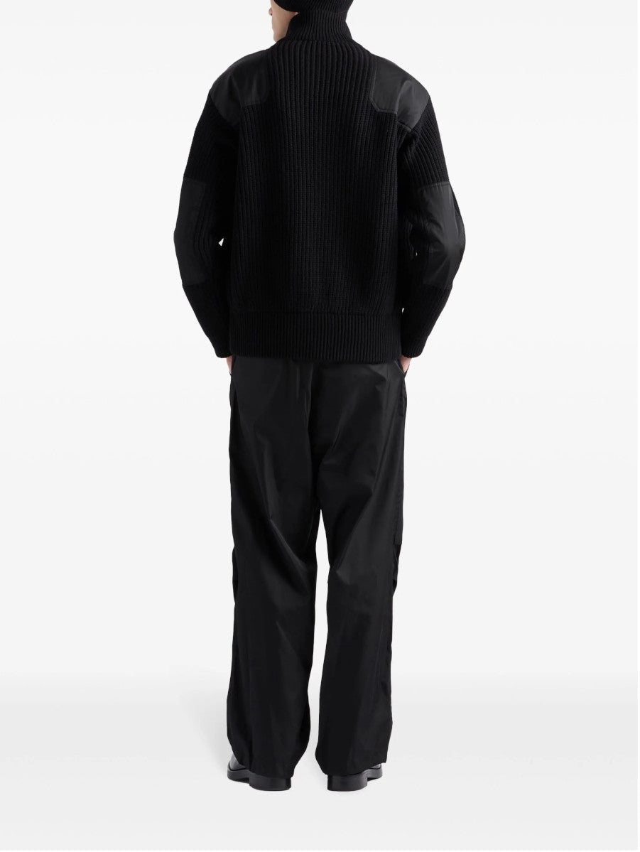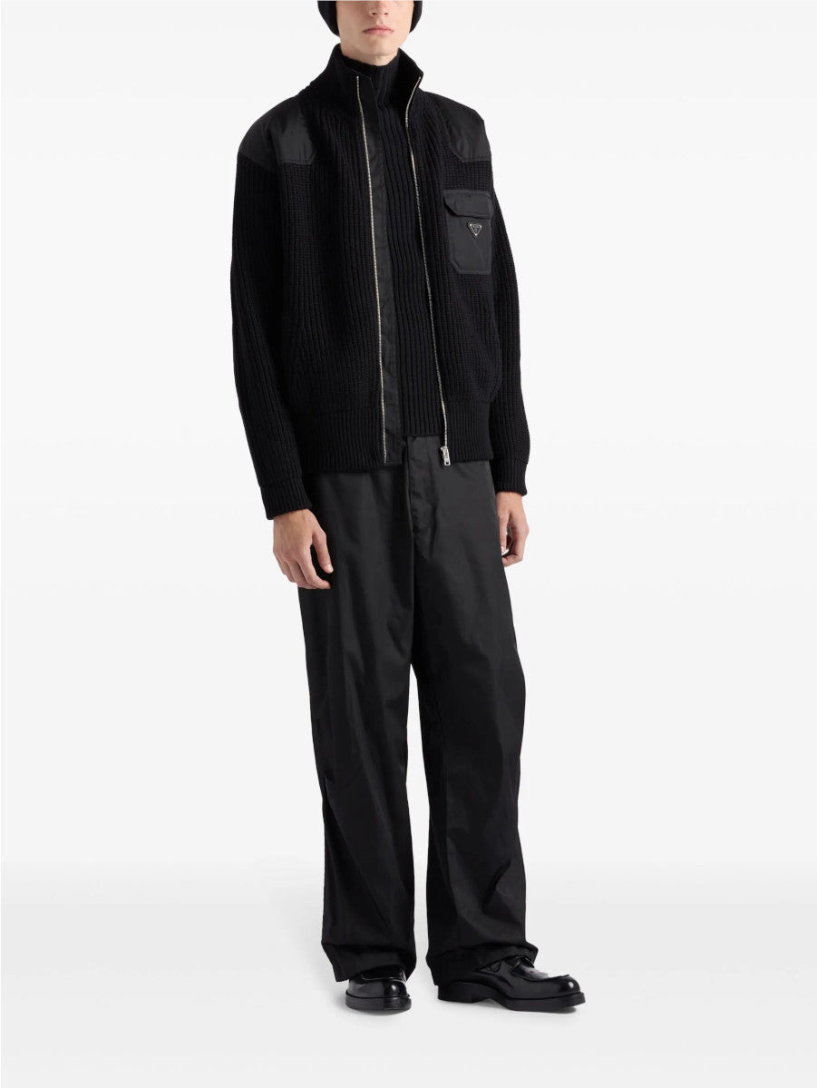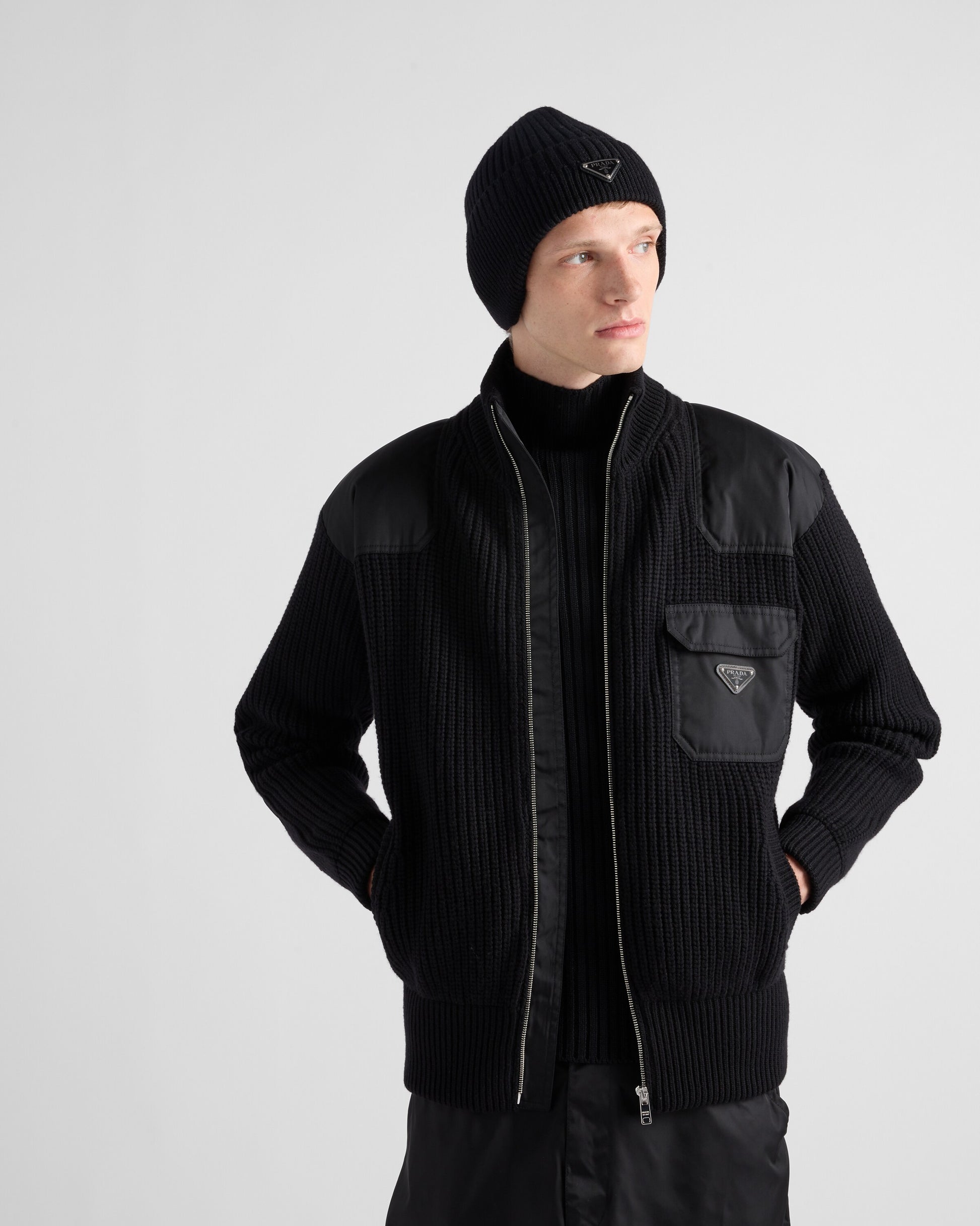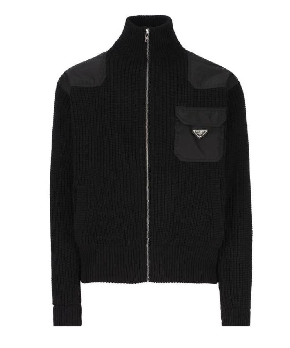 Elevate your cold-weather wardrobe with this refined Prada knit jacket, seamlessly blending luxury and utility. Crafted from premium technical wool, this zip-up piece features contrast nylon inserts at the shoulders and chest for a modern, utilitarian edge. The signature Prada enameled triangle logo on the flap chest pocket adds unmistakable brand identity, while the ribbed trims ensure warmth and structure.