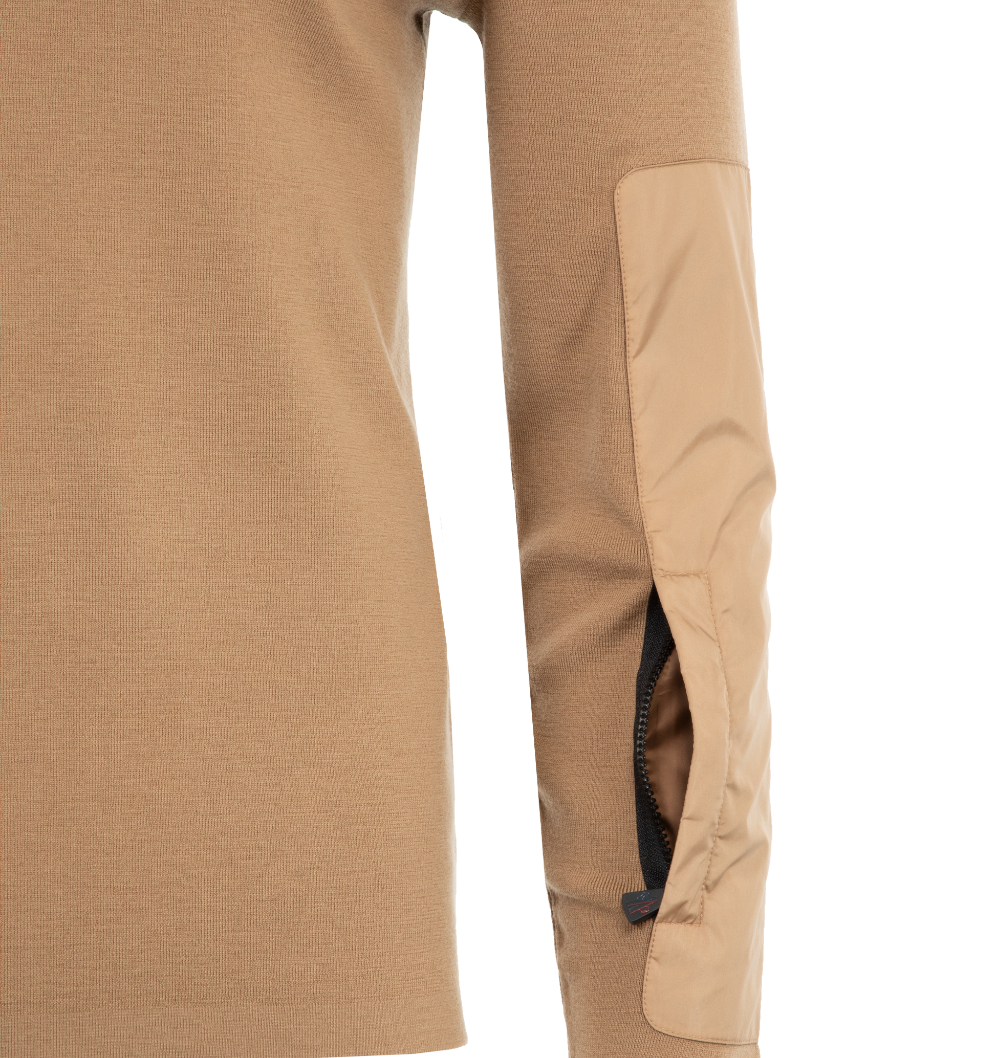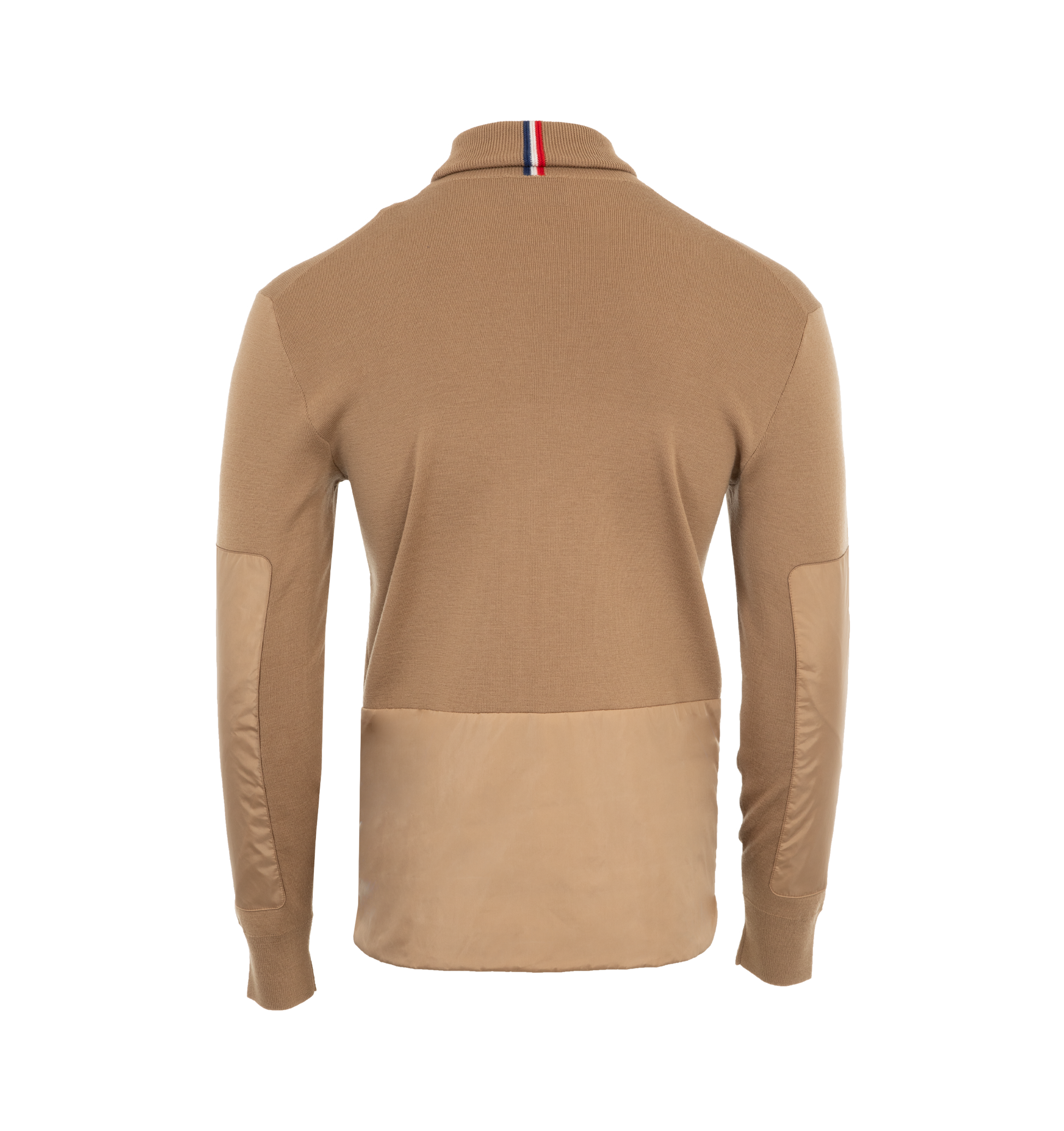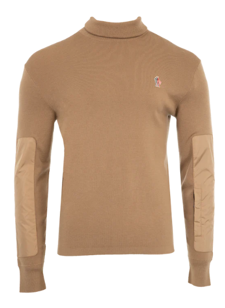 MONCLER Wool Turtleneck Sweater has a turtleneck, rainwear patches, signature logo, zipper ski pass pocket, and wrist gaiters. Polyester and nylon.