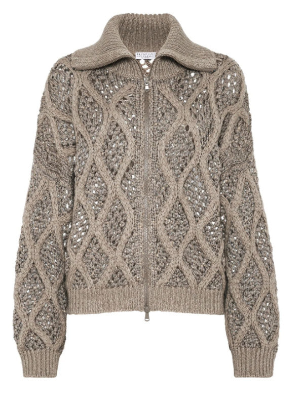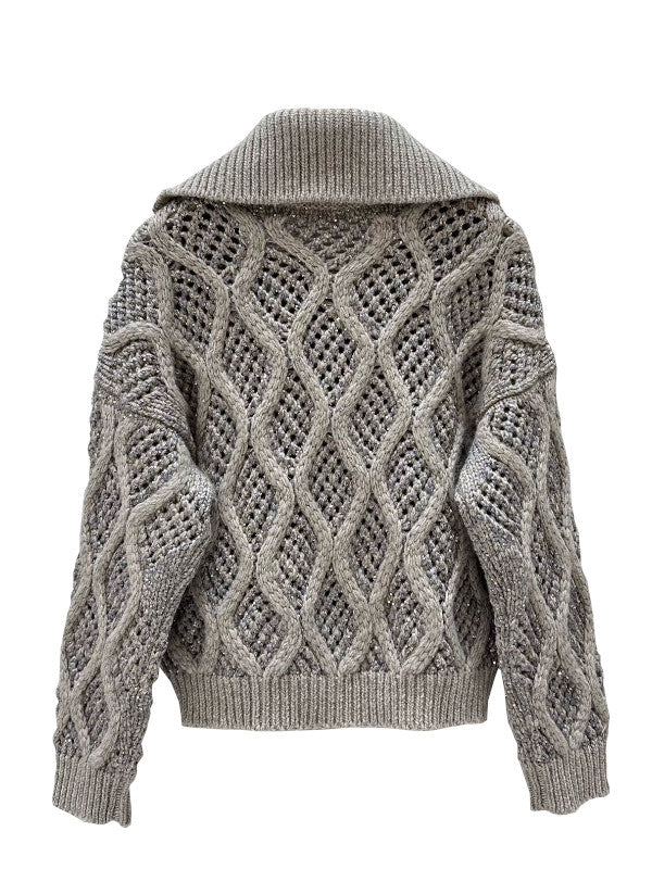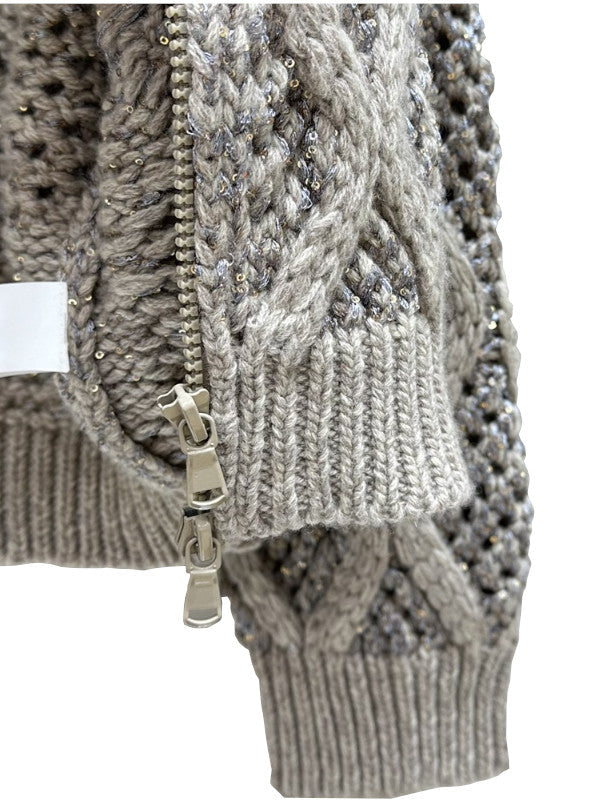 Add a cozy, stylish layer to your wardrobe with this chunky knit zip-up cardigan. Perfect for cooler weather, this piece combines warmth with a chic, textured design.