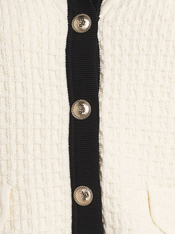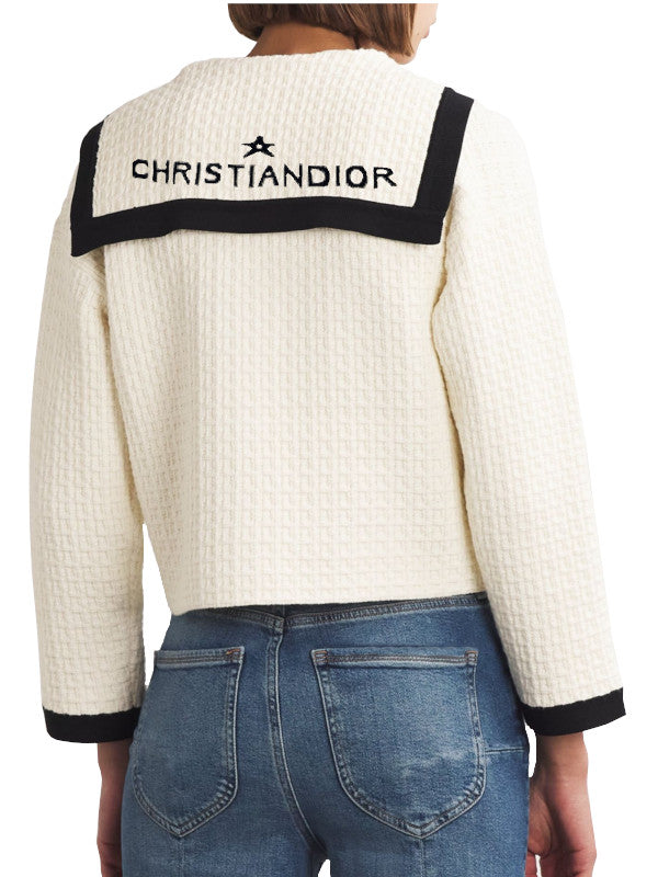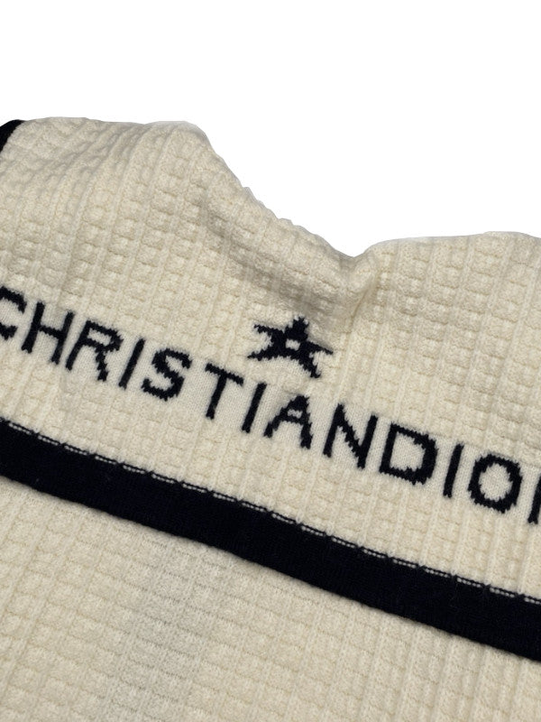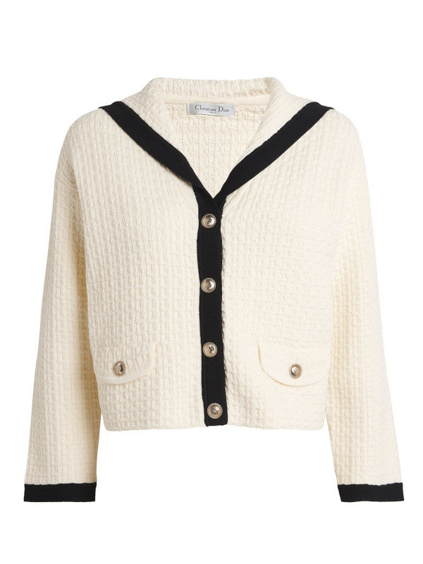 Introducing the Christian Dior Cream Knit Cardigan—an exquisite blend of elegance and casual sophistication. This cardigan is crafted from luxurious knit fabric in a soft cream color, making it a perfect layering piece for any wardrobe. The standout feature is its contrast black trim along the collar, button placket, and cuffs, creating a chic and timeless look.