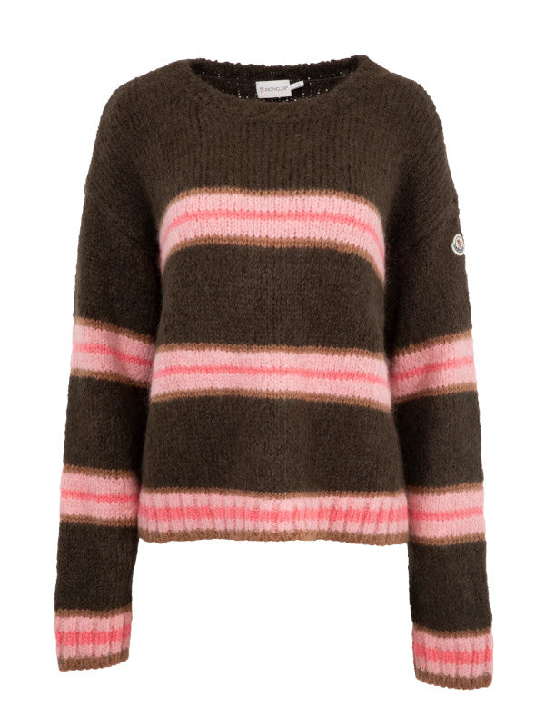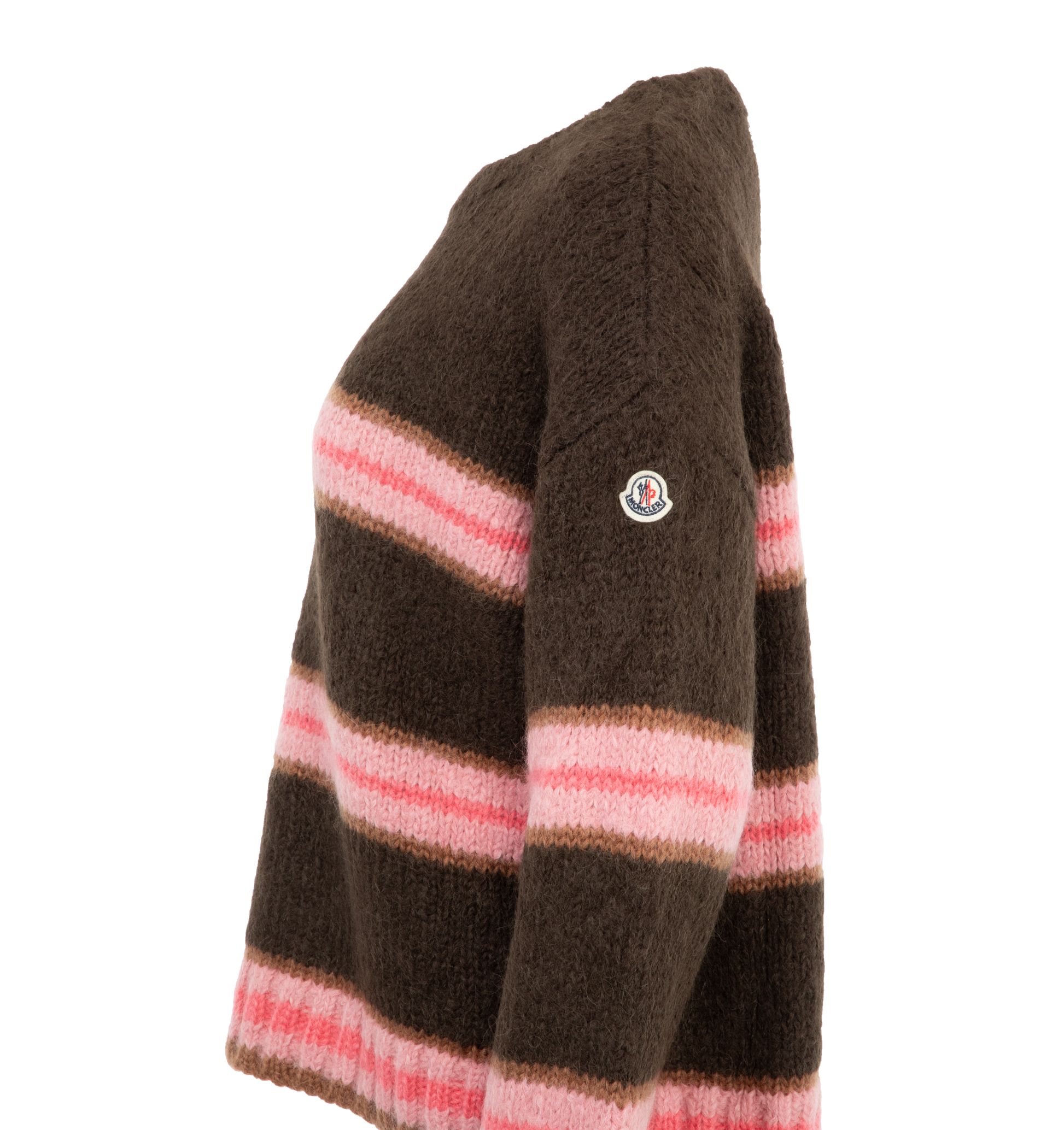 MONCLER Striped Alpaca Blend Sweater featuring stockinette stitch, gauge 3, crew neck and striped motif. 78% alpaca, 14% polyamide/nylon, 8% wool. 50% mohair, 32% polyamide/nylon, 18% wool.