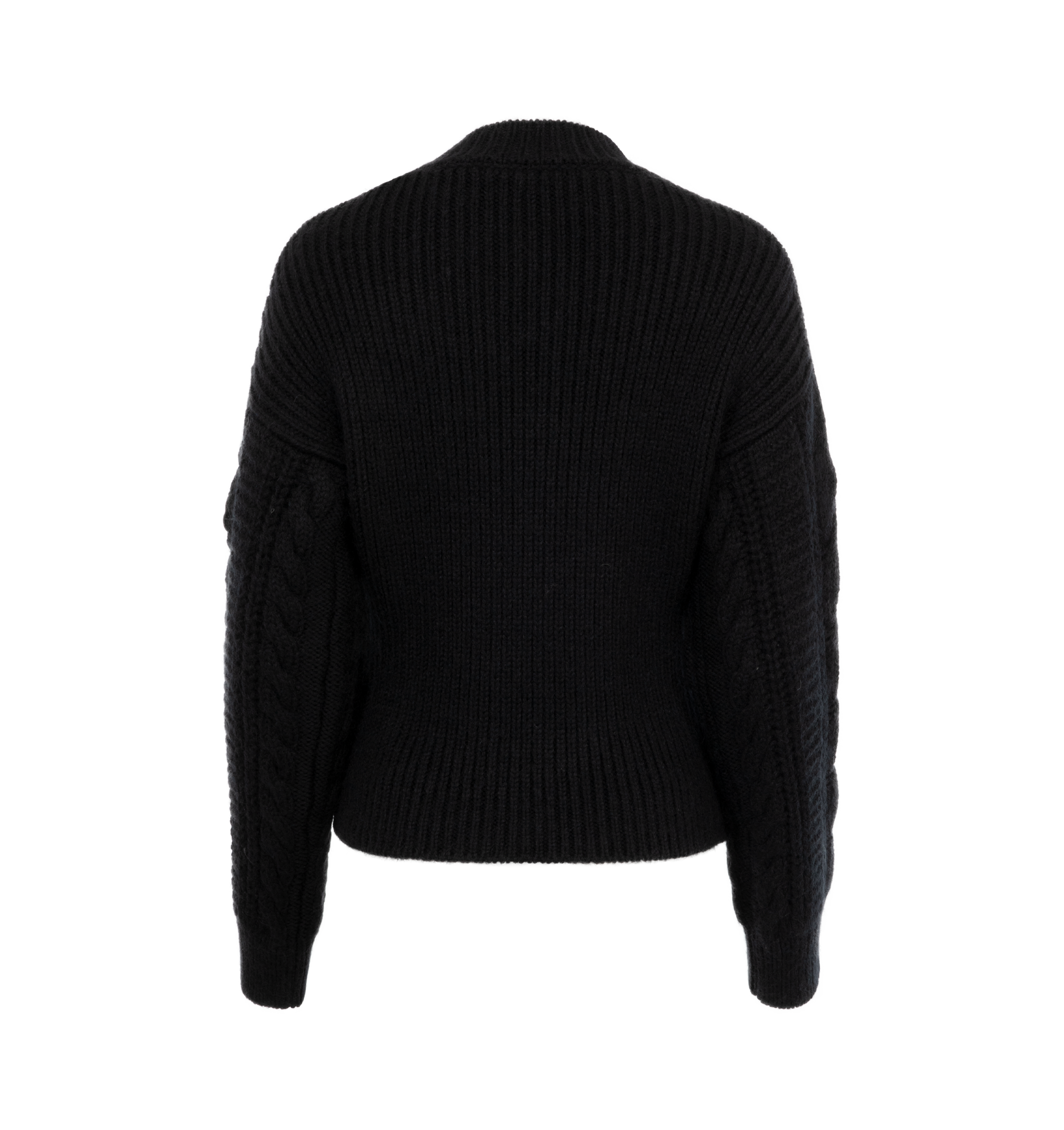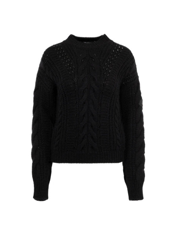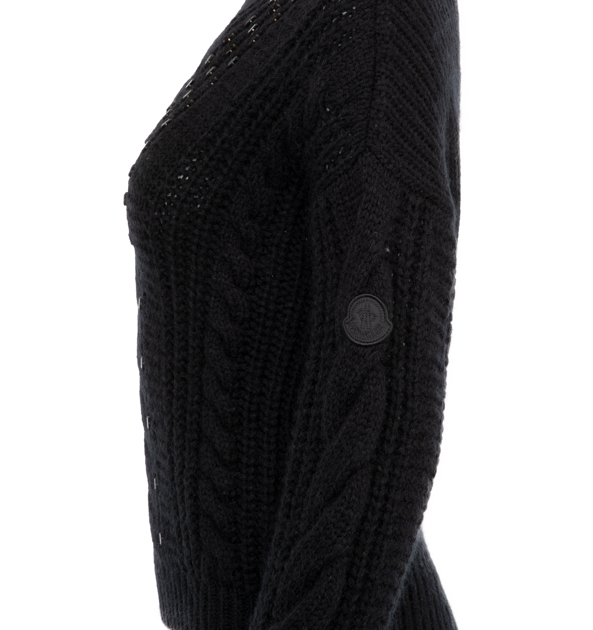 MONCLER Embroidered Mohair & Wool Sweater featuring a mohair and wool blend, cable rib knit, gauge 3, turtleneck, fully-fashioned brioche stitch back and hand-embroidered crystals. 89% wool, 6% mohair, 5% polyamide/nylon.