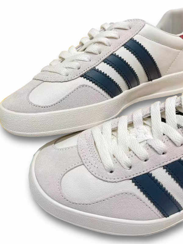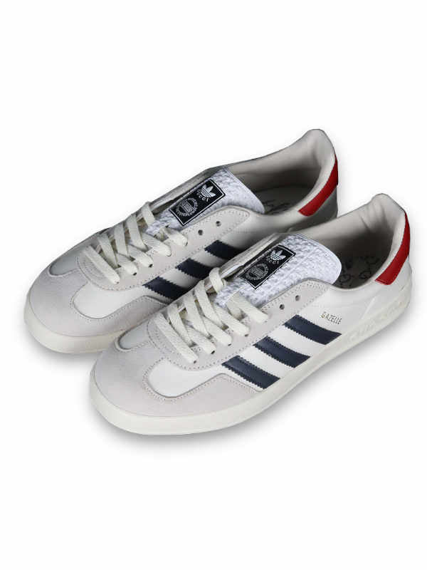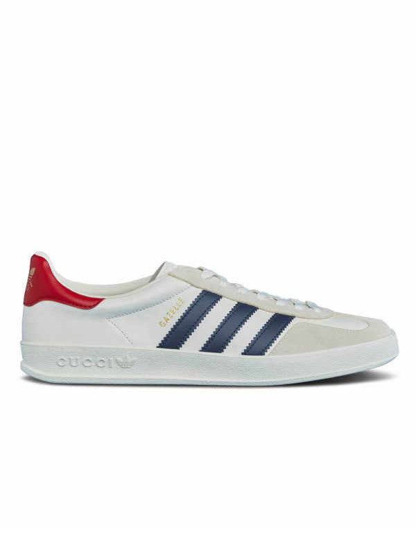 Experience the seamless fusion of high-end luxury and streetwear flair with the adidas Gazelle x Gucci White Collegiate Royal. Meticulously crafted using premium materials, this sneaker pays homage to '90s aesthetics, evident in its leather and suede upper adorned with co-branding and tonal topstitching. Designed for both style and comfort, the rubber sole features cushioning for a plush feel, while the textured tread underneath ensures reliable grip. Take charge of your fit with the classic lace closure. Elevate your sneaker collection with the adidas Gazelle x Gucci White Collegiate Royal, a stylish stride that effortlessly bridges the worlds of sophistication and urban chic.