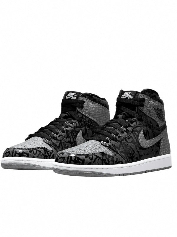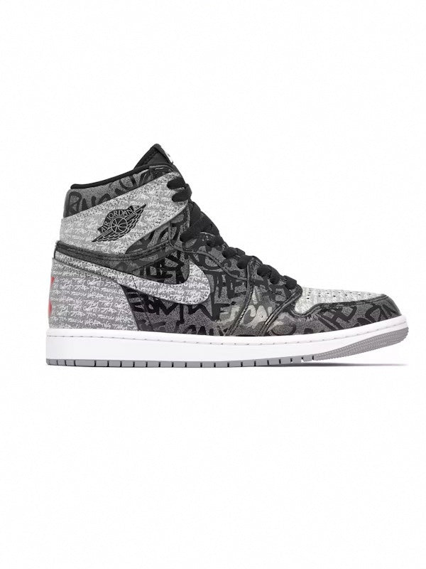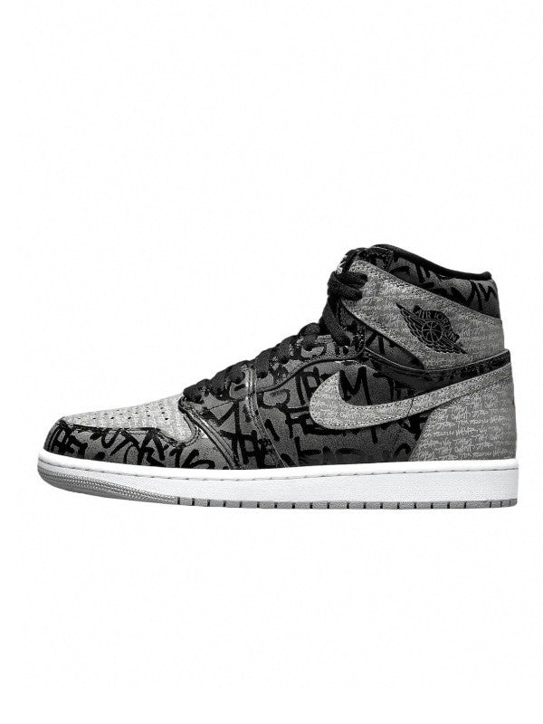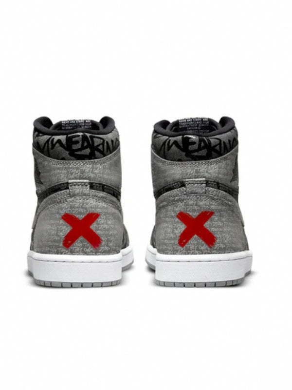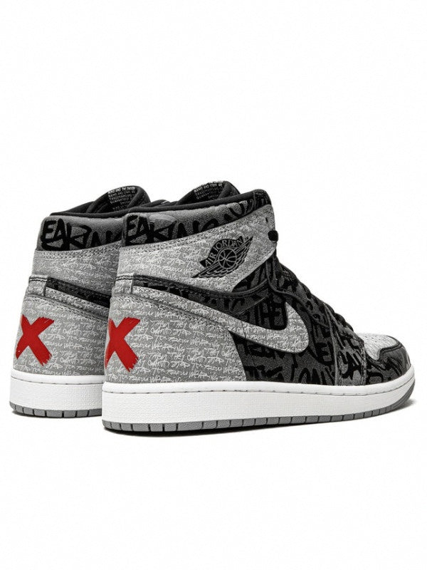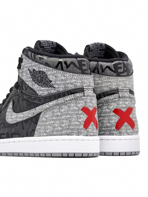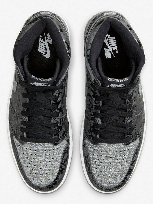 All-over print spells out ‘They Can’t Stop You From Wearing Them,’ referencing the 1985 Air Jordan 1 TV commercial.
