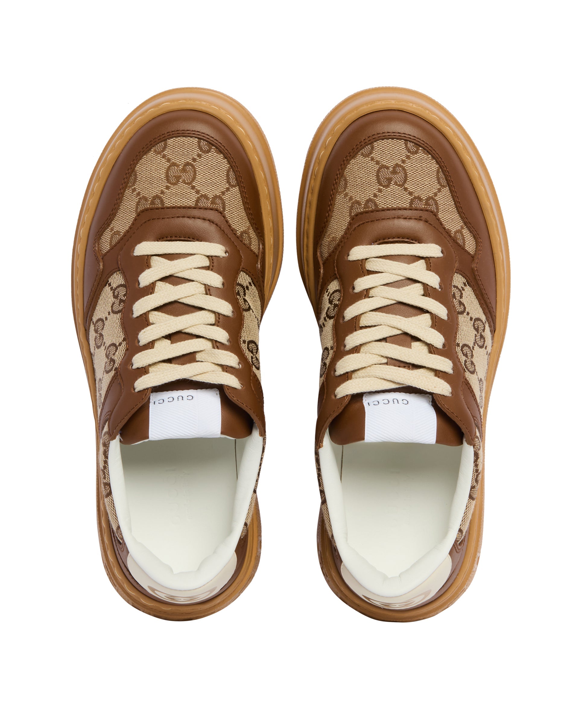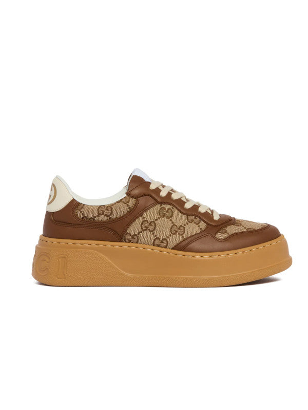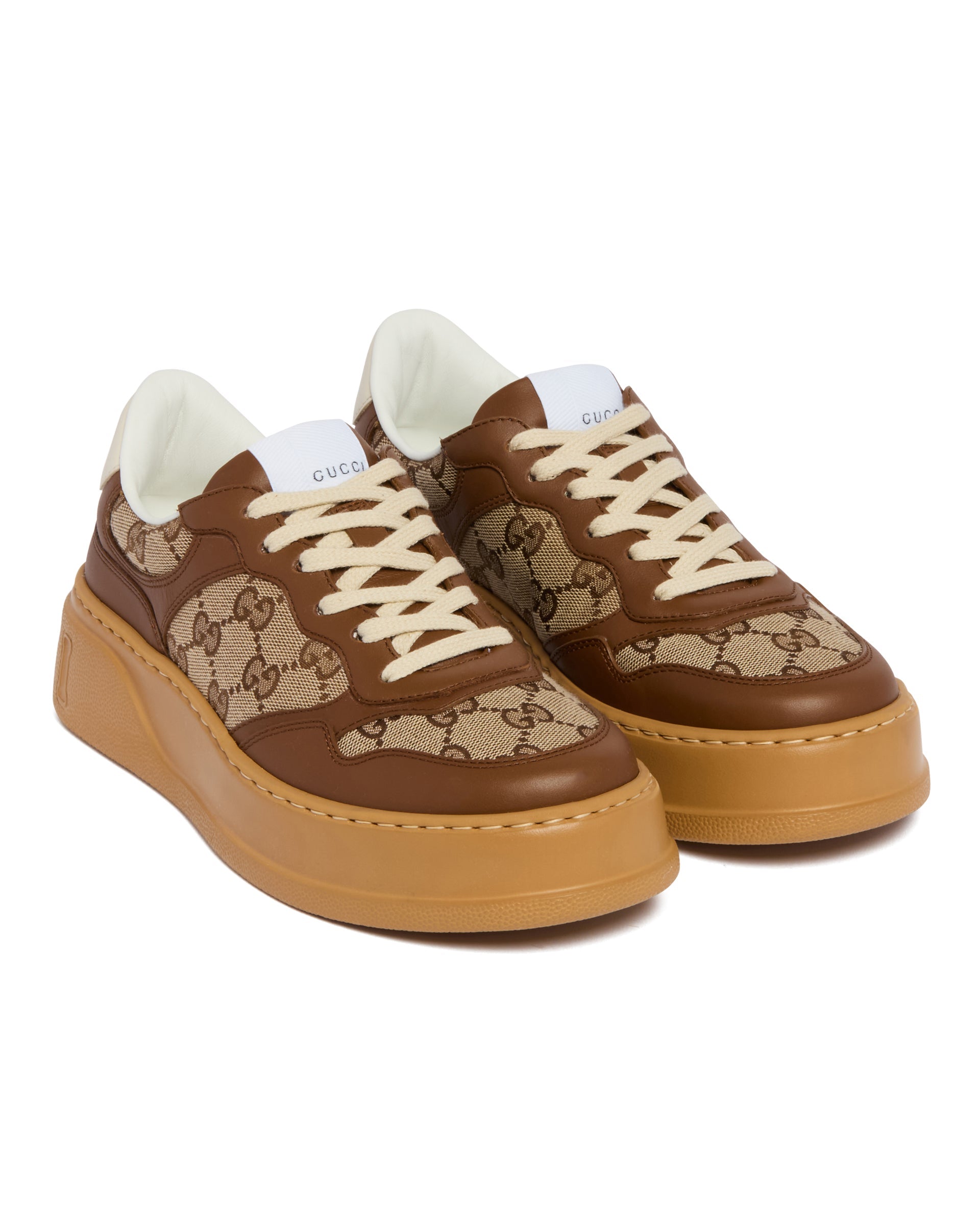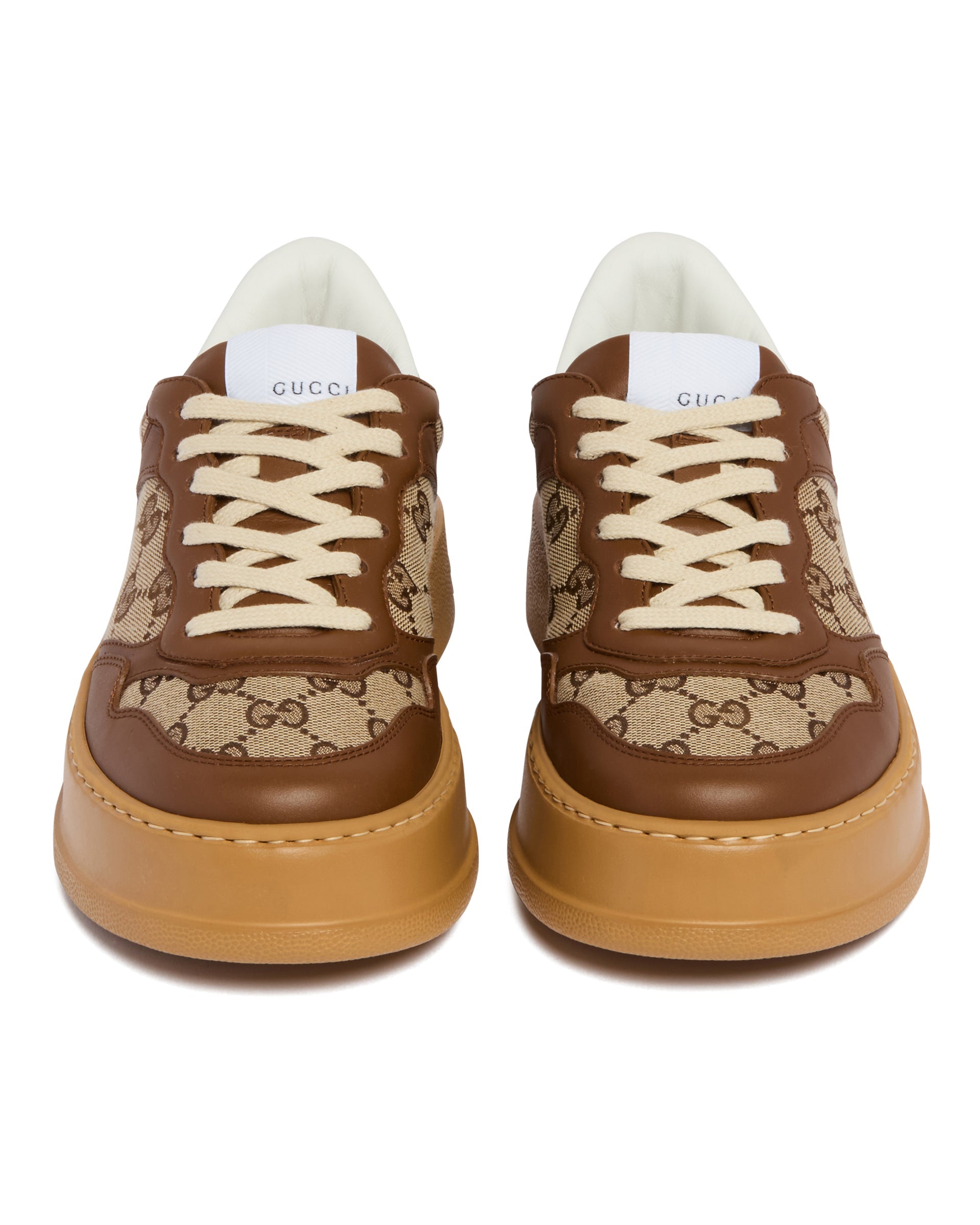 Gucci Beige GG Sneakers. Upper crafted in beige Original GG canvas with brown leather details. Round toe, front lace-up fastening, logoed details, printed Interlocking G logo on the heel, rubber logoed outsole.
