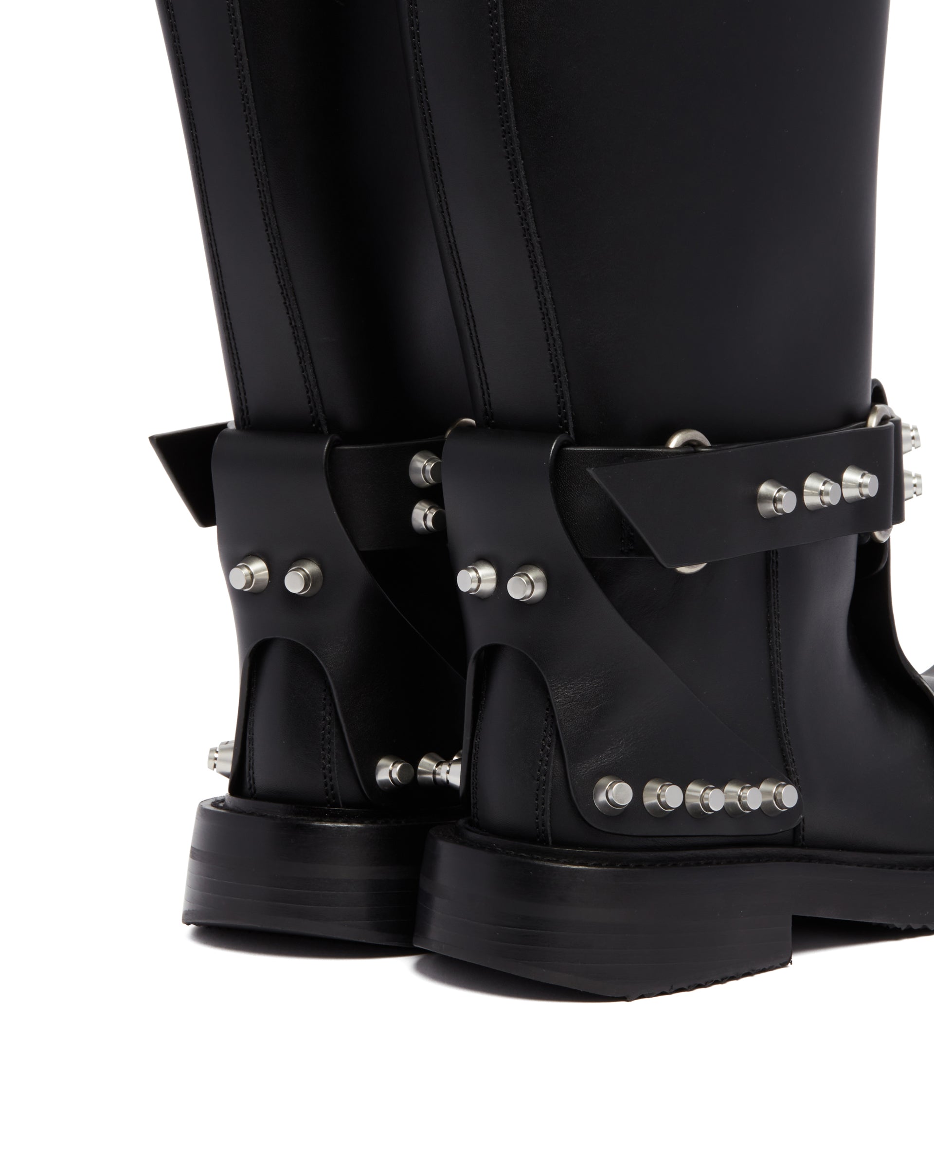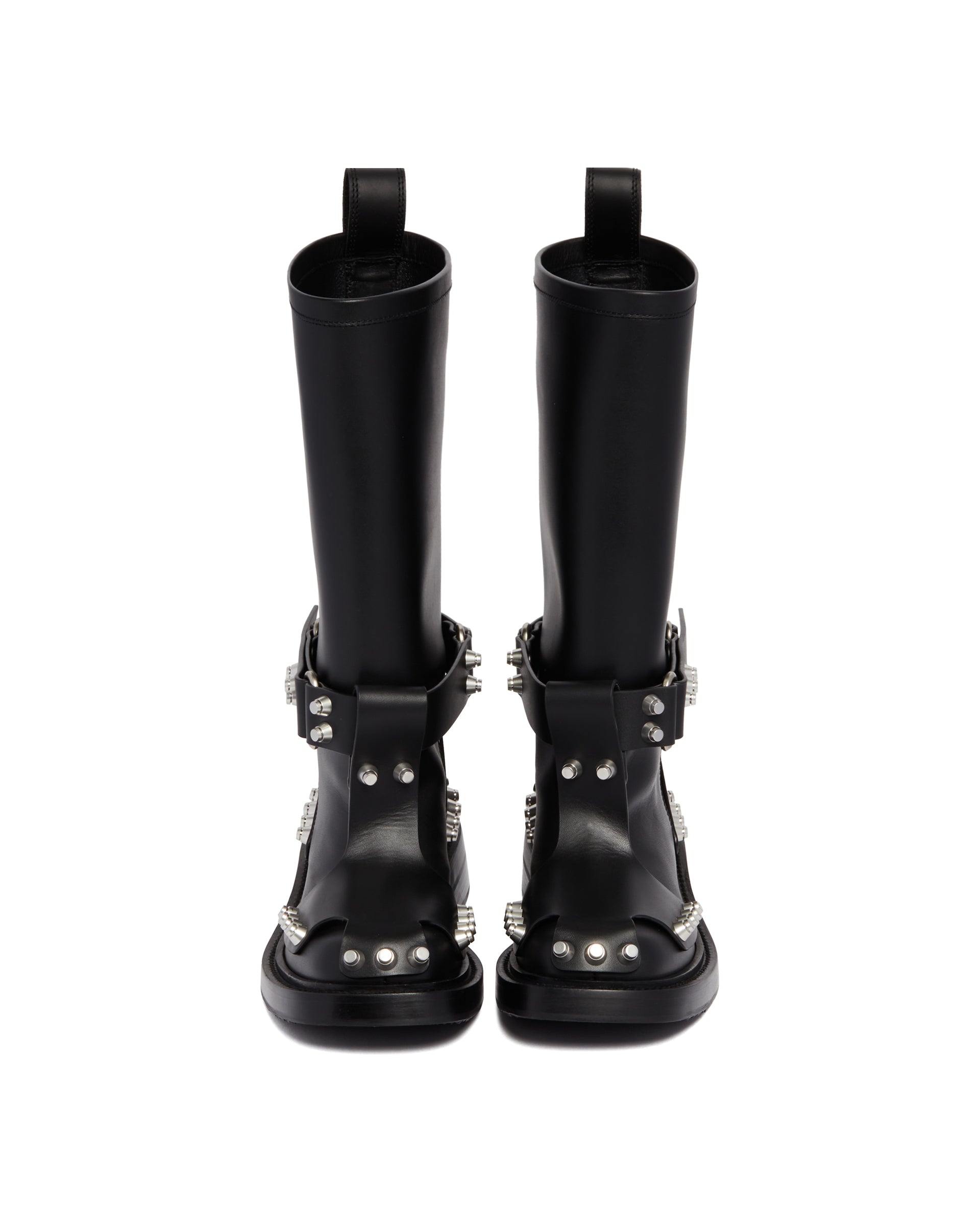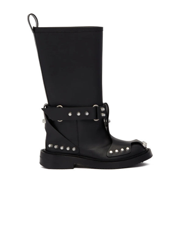 Alexander Wang Black dixon buckle boot in leather. Black leather upper, strap detailing, silver-tone studs embellishment. Round toeline, pull tab, slip-on style, stacked heels.