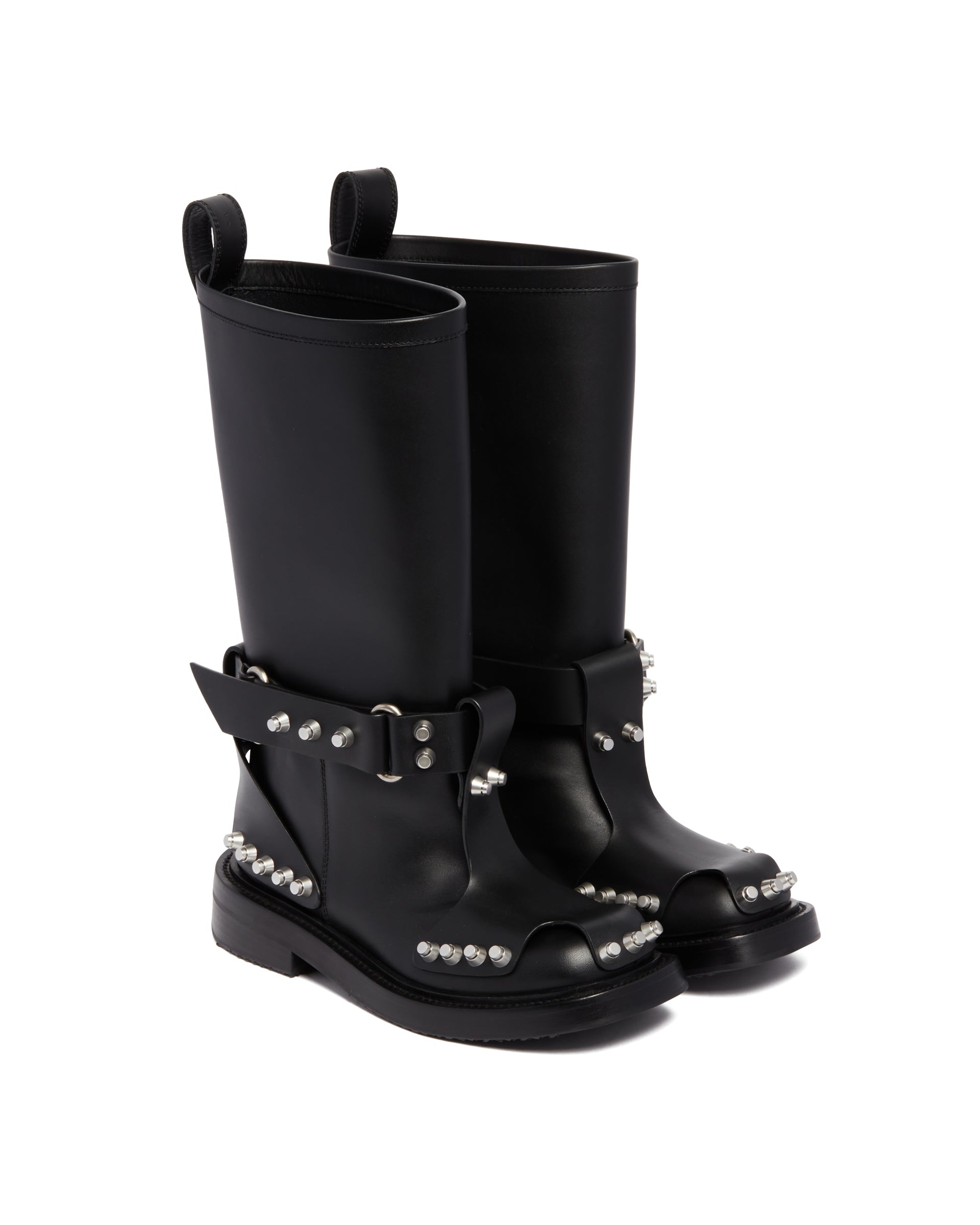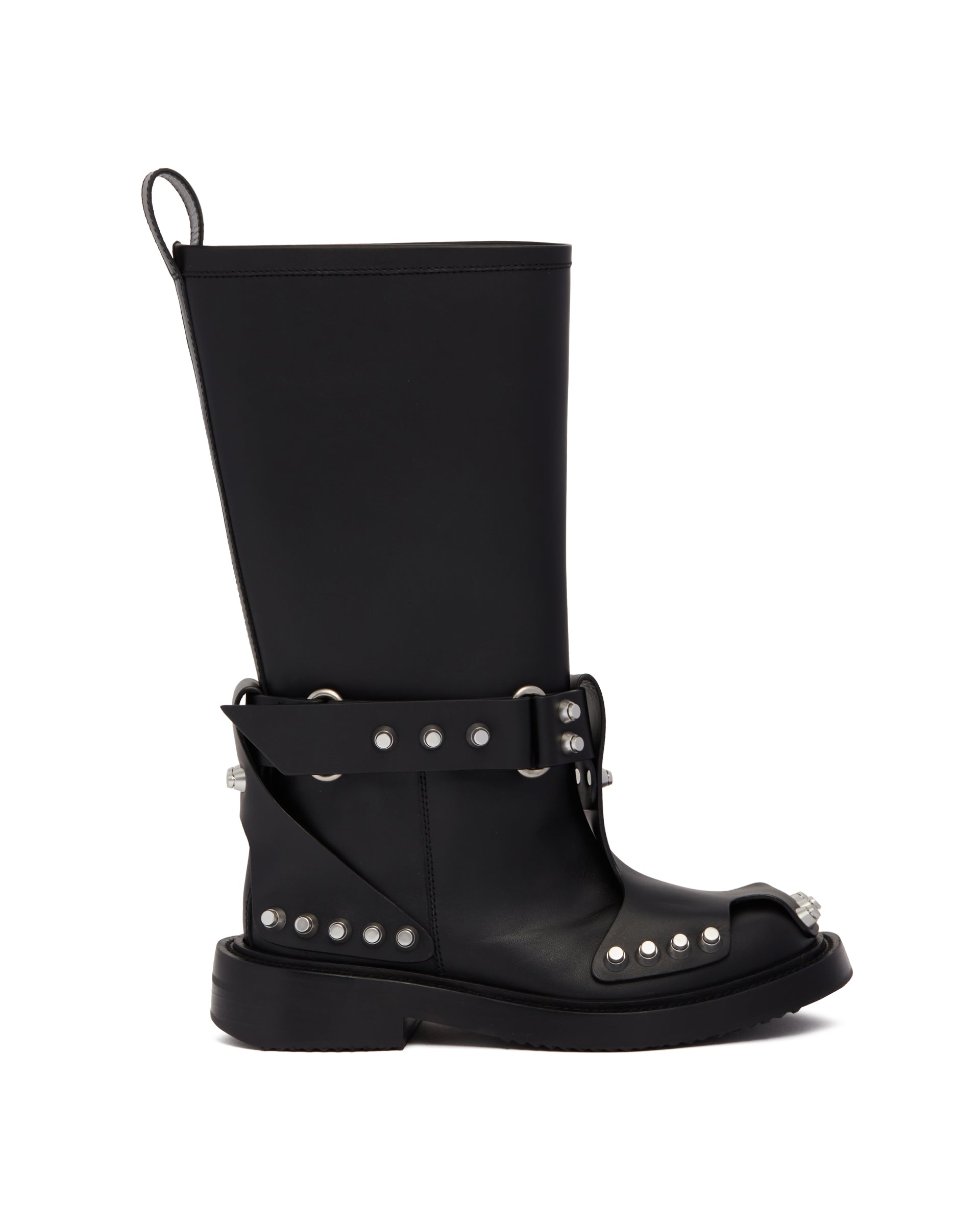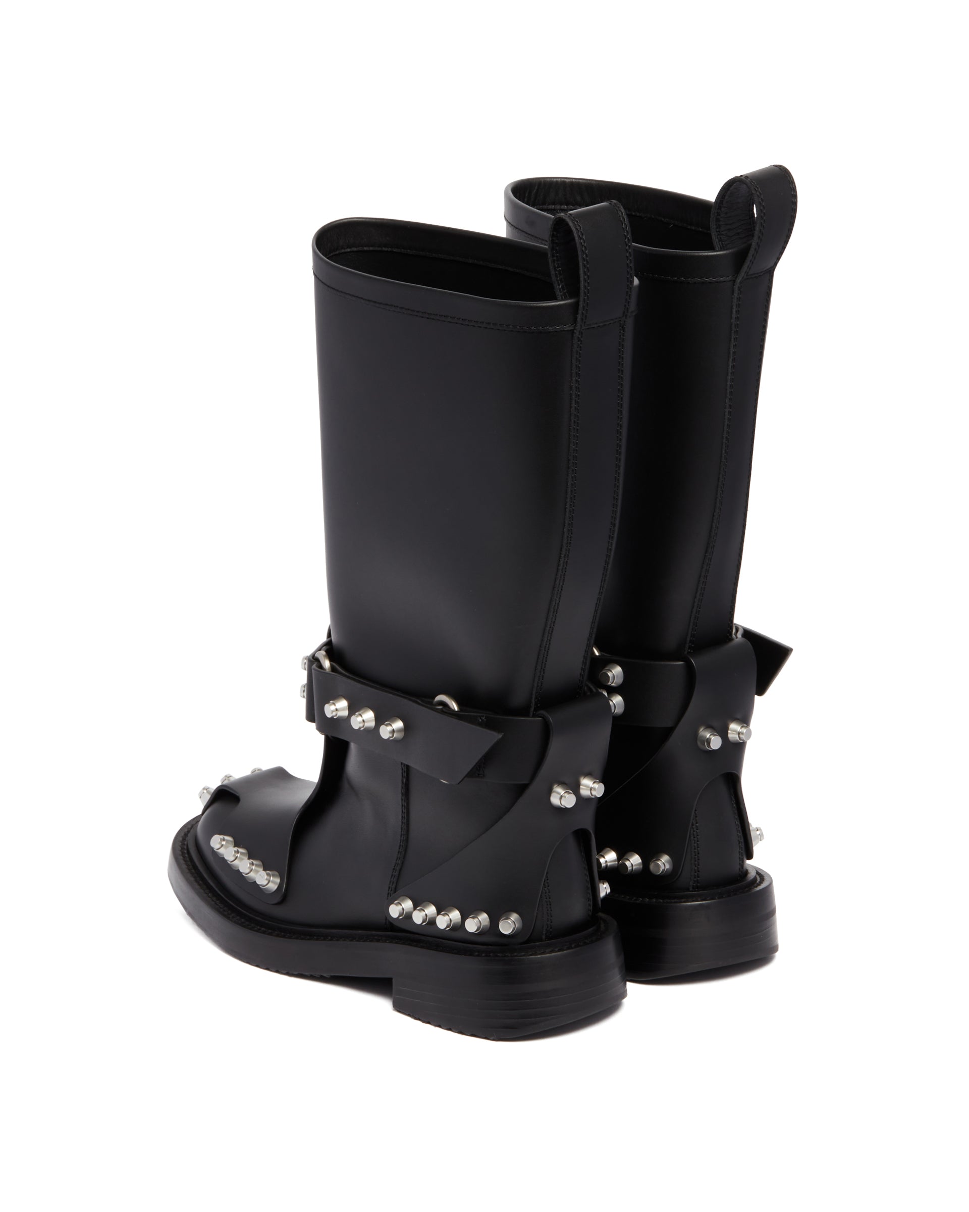Alexander Wang Black dixon buckle boot in leather. Black leather upper, strap detailing, silver-tone studs embellishment. Round toeline, pull tab, slip-on style, stacked heels.