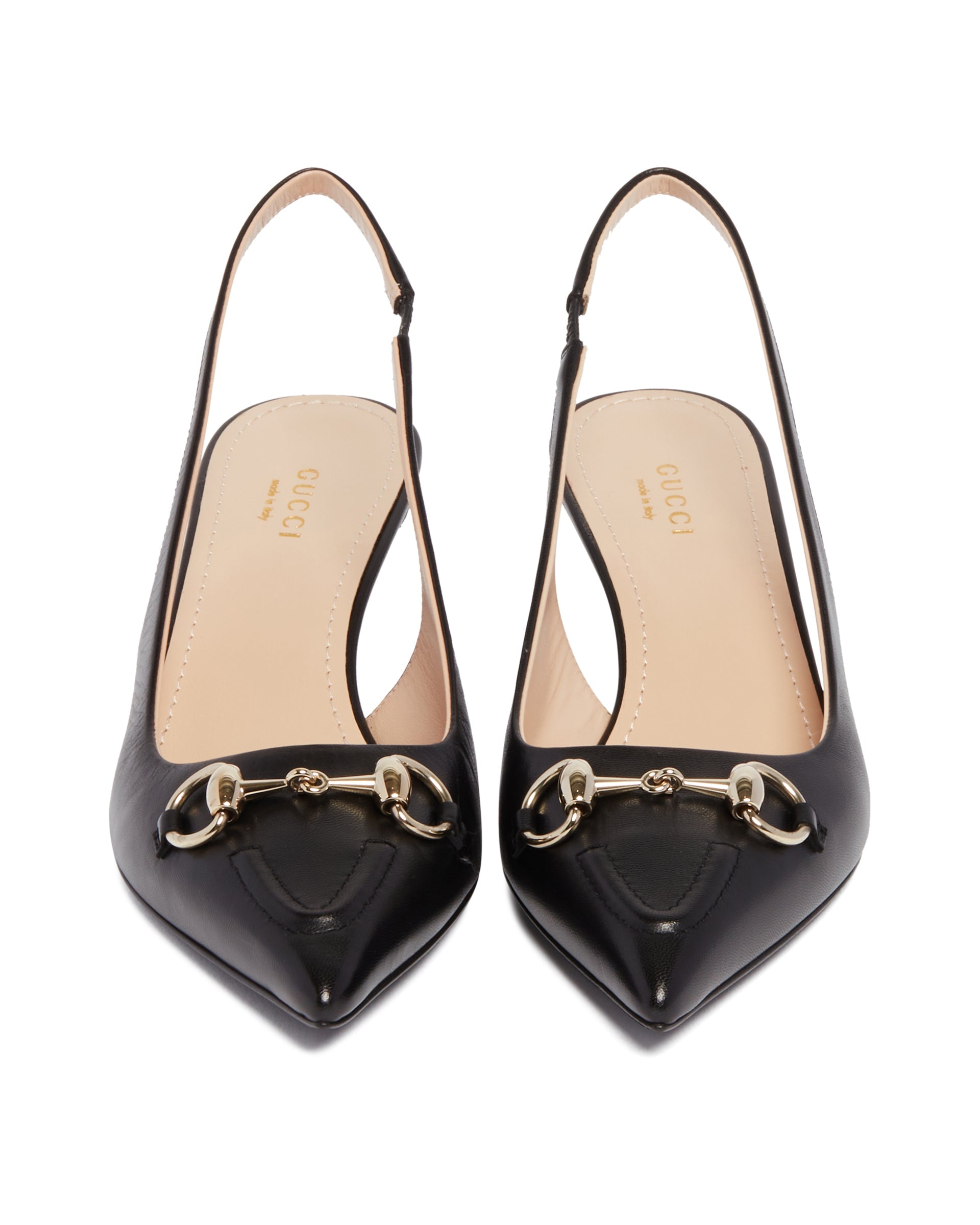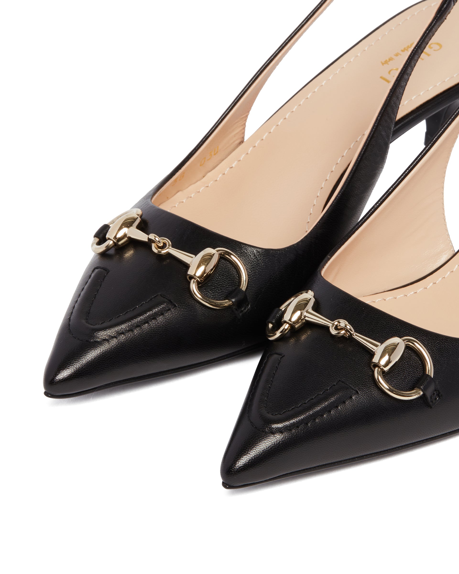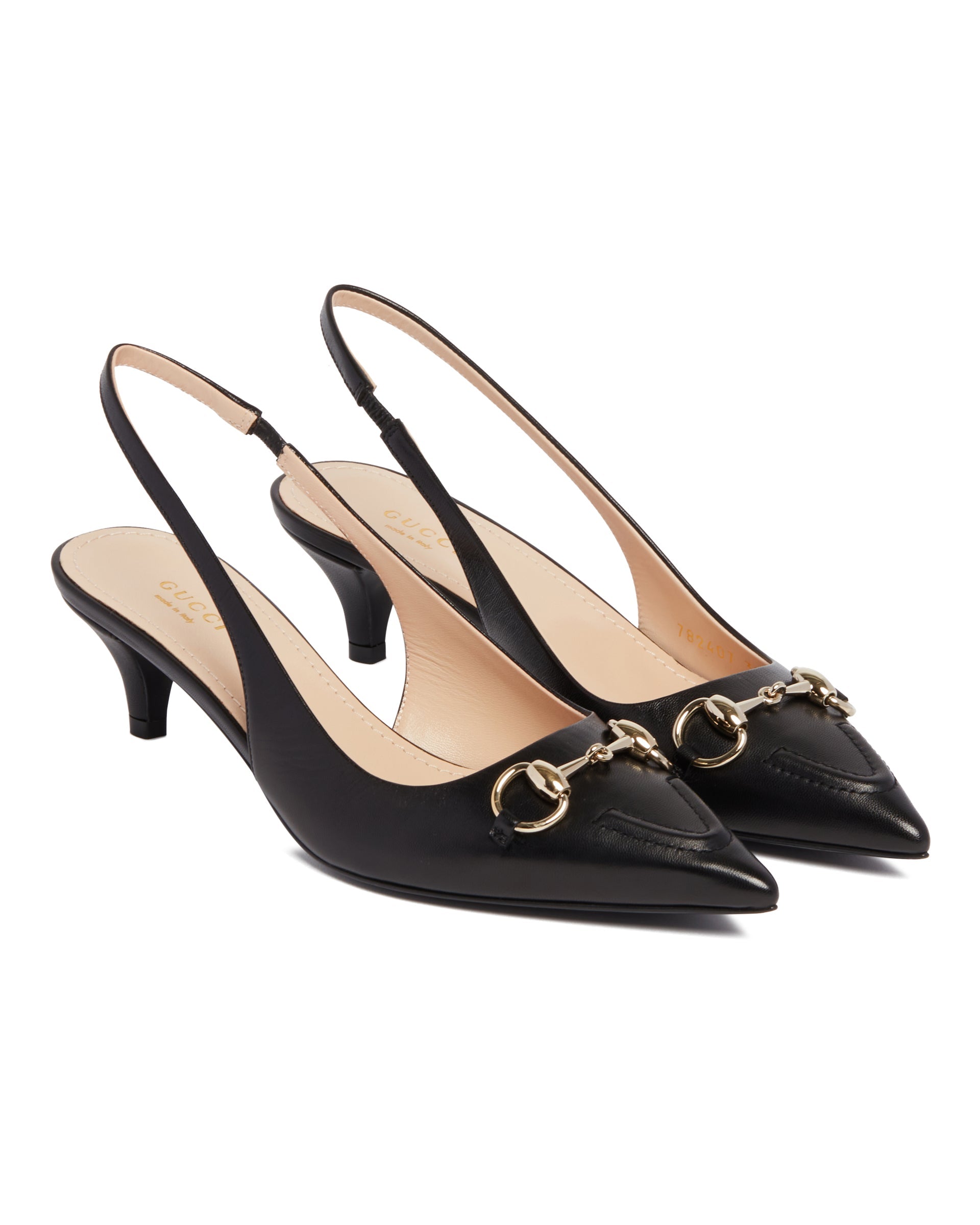 Gucci Black Pumps with Horsebit Detail. Black leather upper, pointed toe, gold-tone Horsebit detail. Back strap with elastic, tone-on-tone kitten heel, leather lining, leather sole.