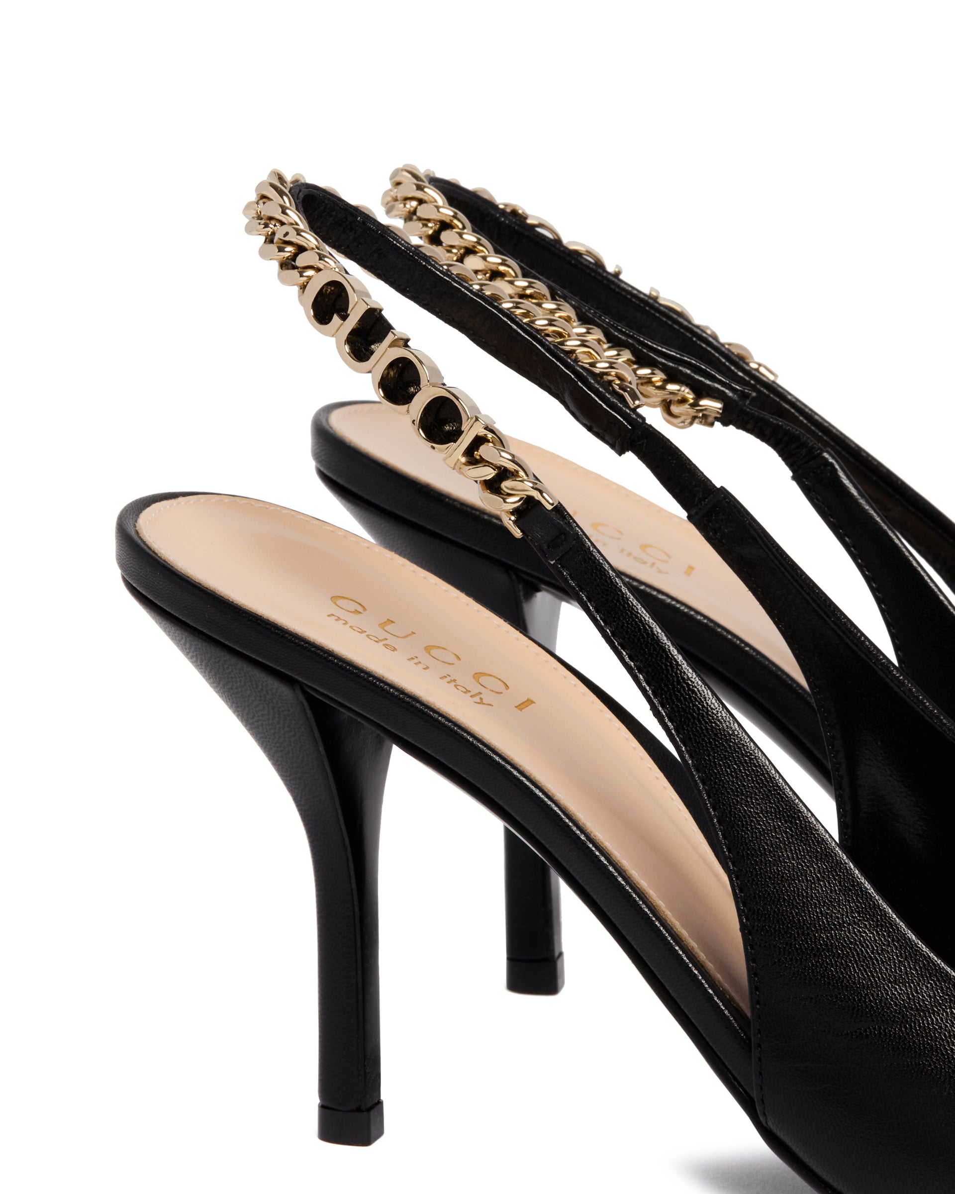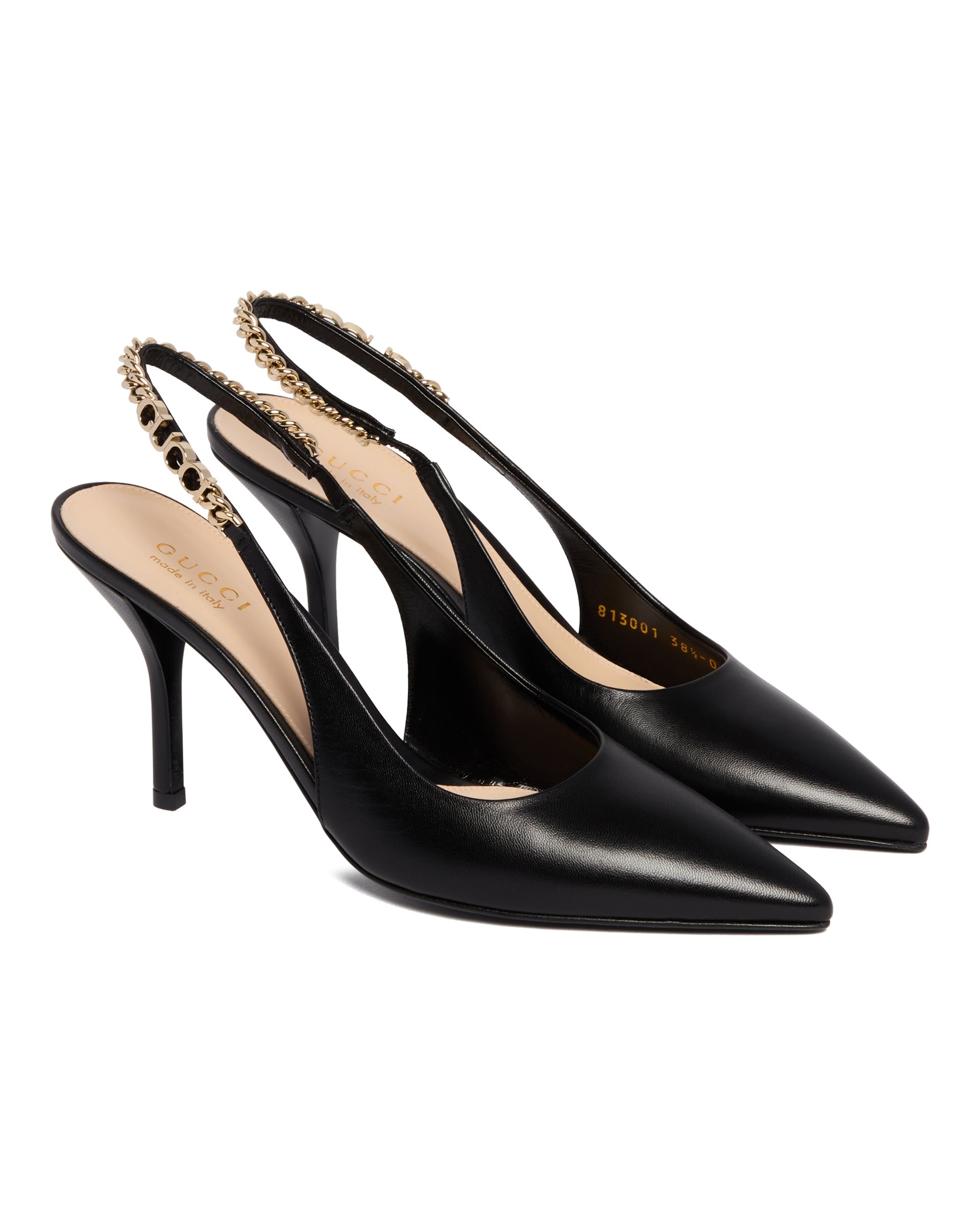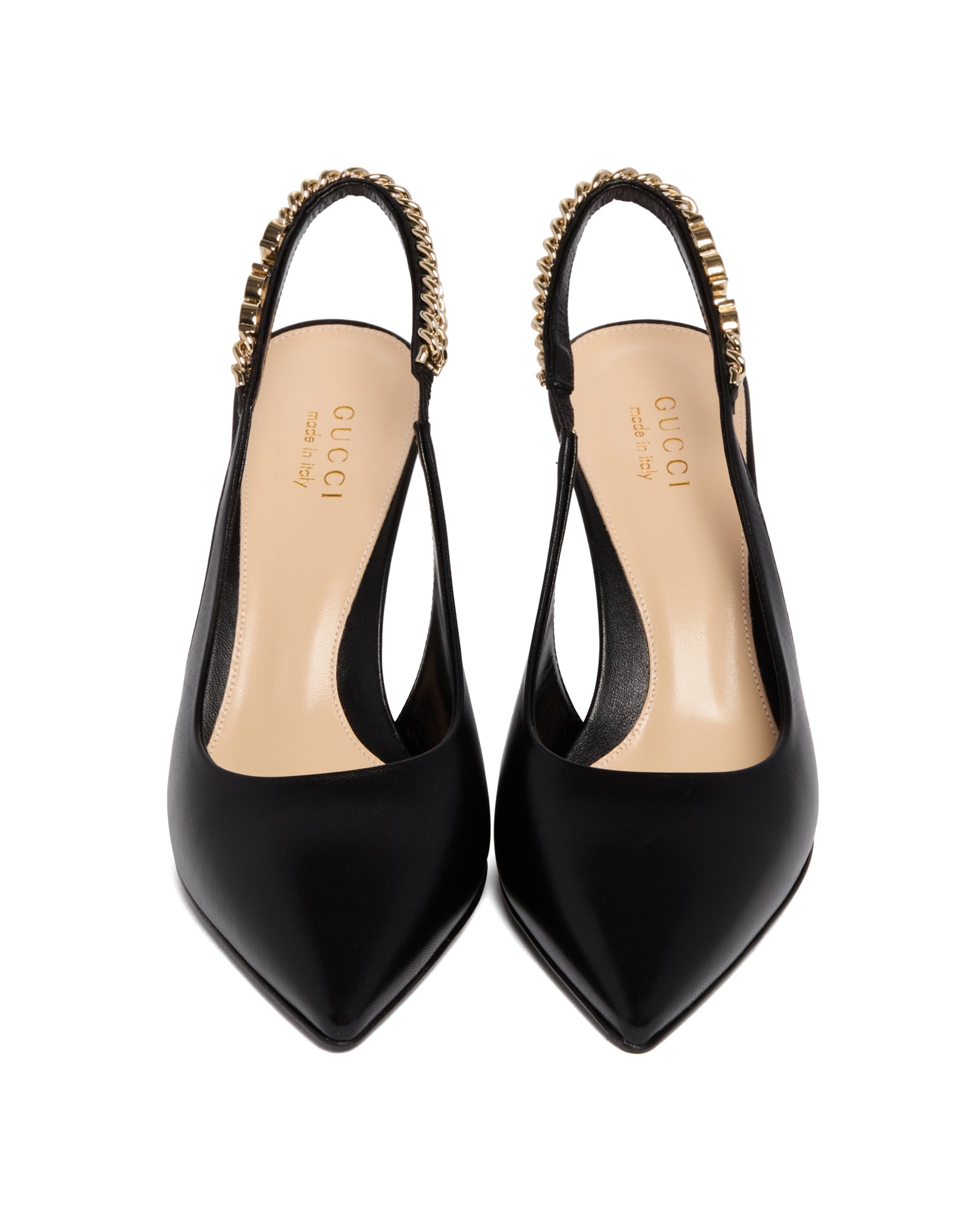 Gucci Black Signoria Leather Pumps. Black leather, pointed toe, closure with elasticized back strap featuring hand-stitched Gucci chain. Leather sole, high heel, gold-tone hardware. Heel Height: 10 cm