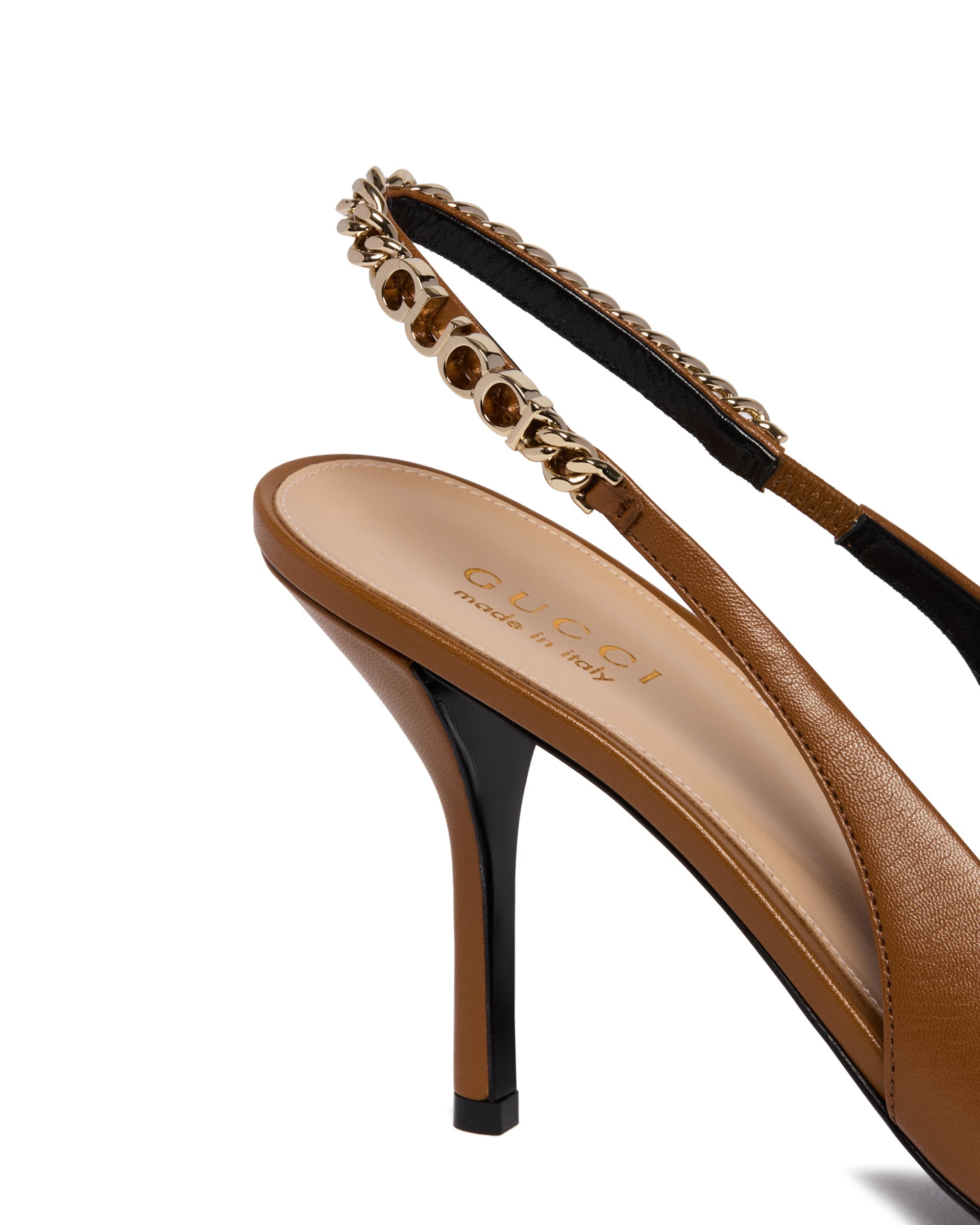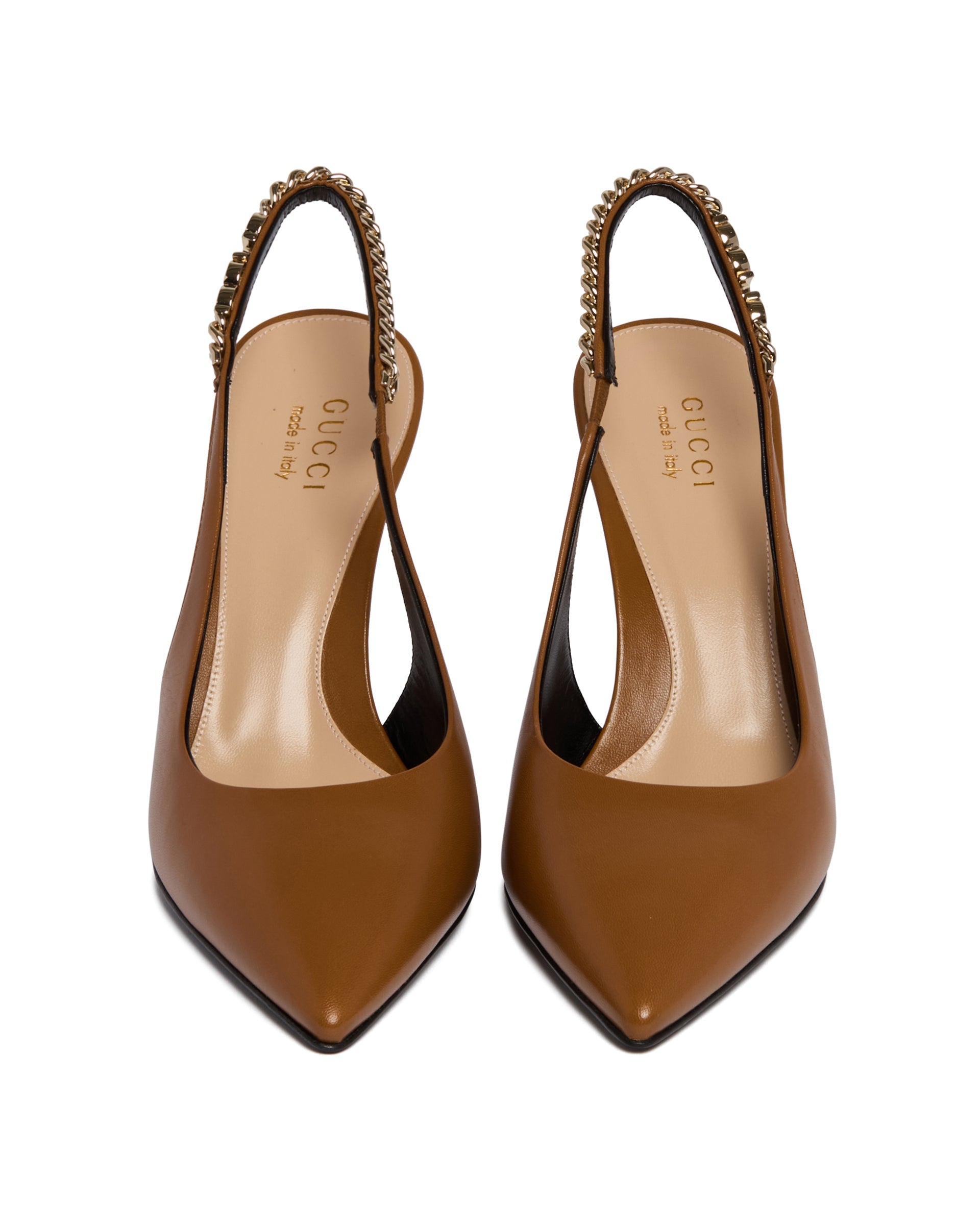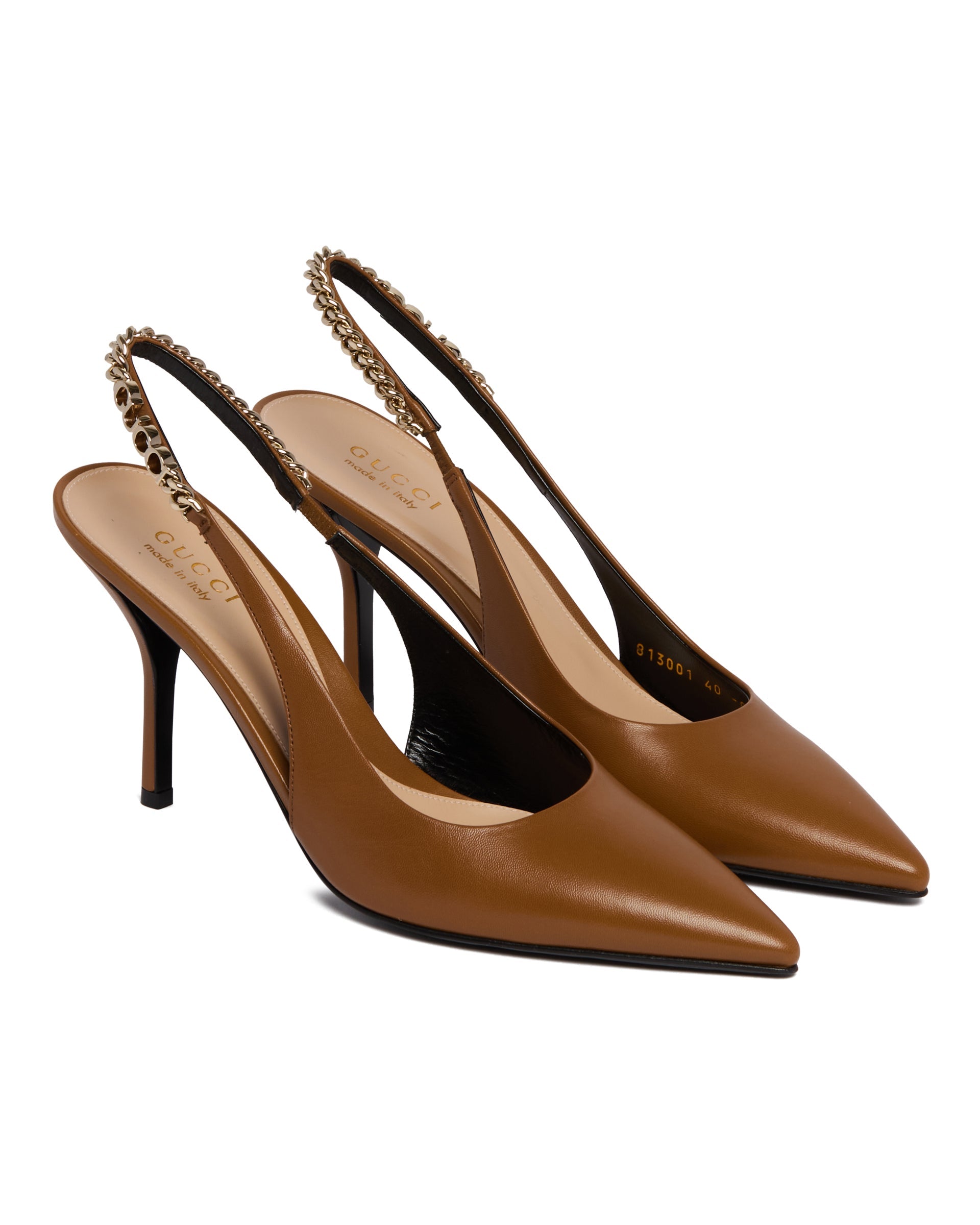 Gucci Brown Signoria Leather Pumps. Brown leather upper, pointed toe, closure with elasticized back strap featuring hand-stitched Gucci chain, leather sole, high heel. Heel Height: 10.5 cm