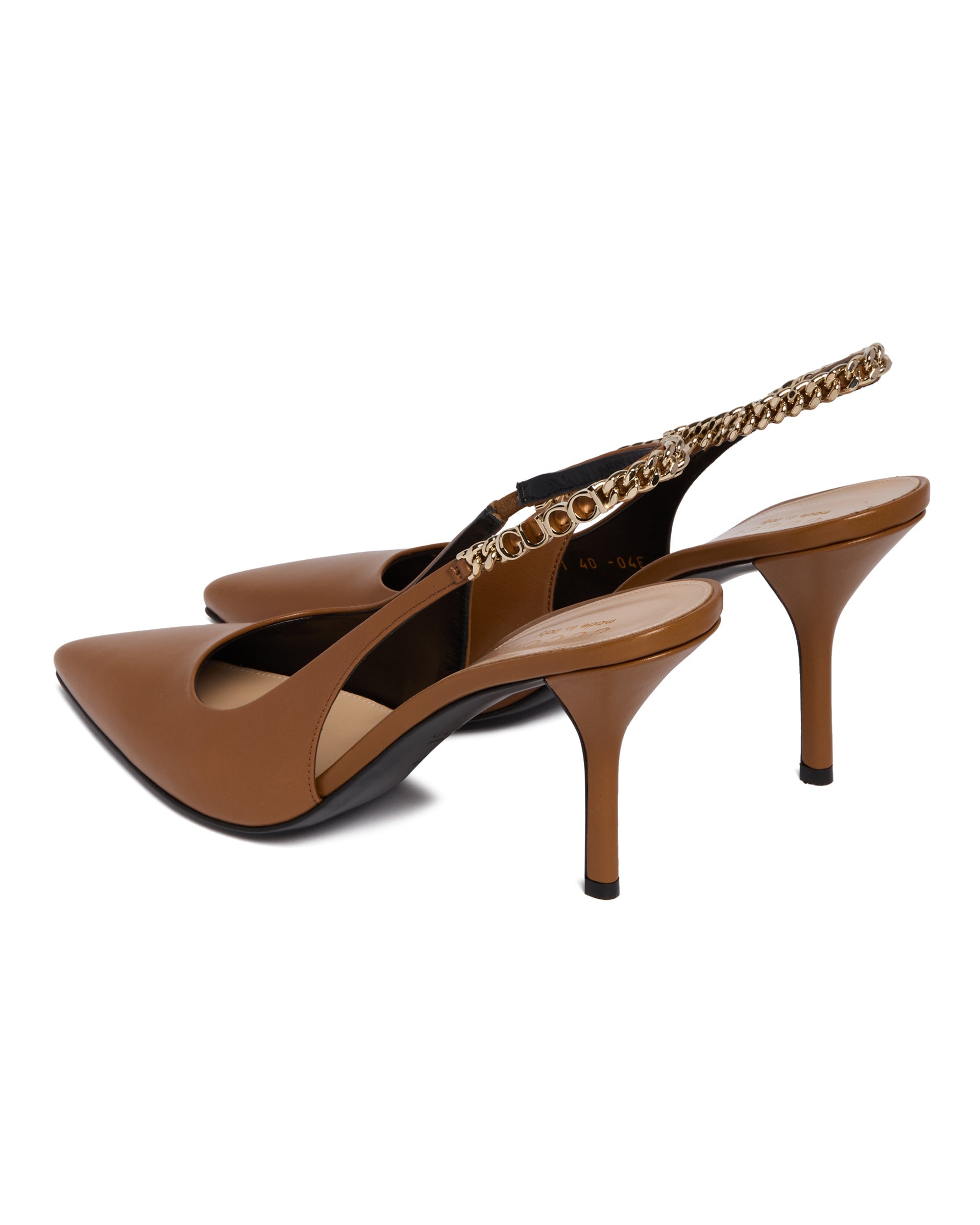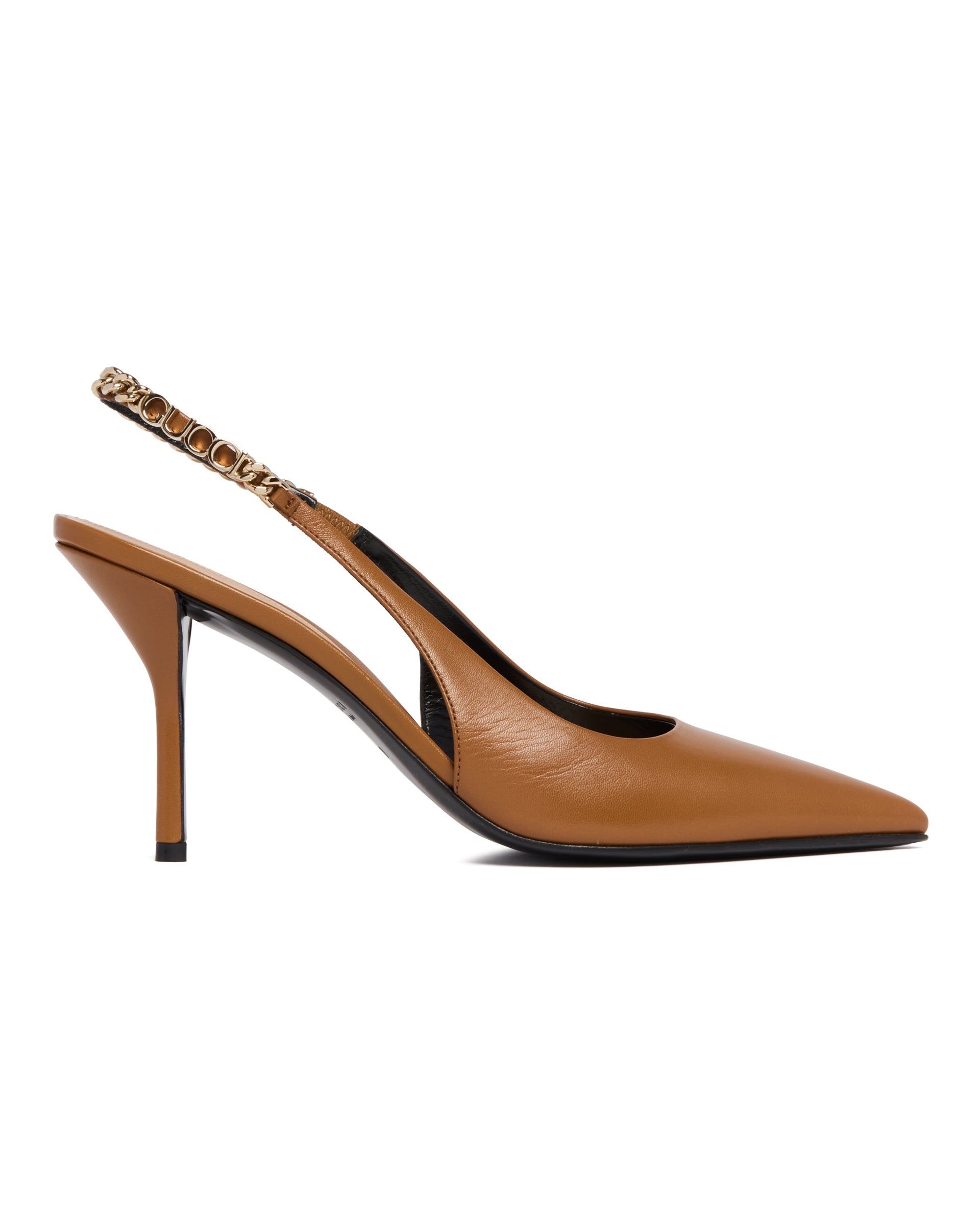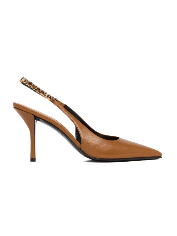 Gucci Brown Signoria Leather Pumps. Brown leather upper, pointed toe, closure with elasticized back strap featuring hand-stitched Gucci chain, leather sole, high heel. Heel Height: 10.5 cm