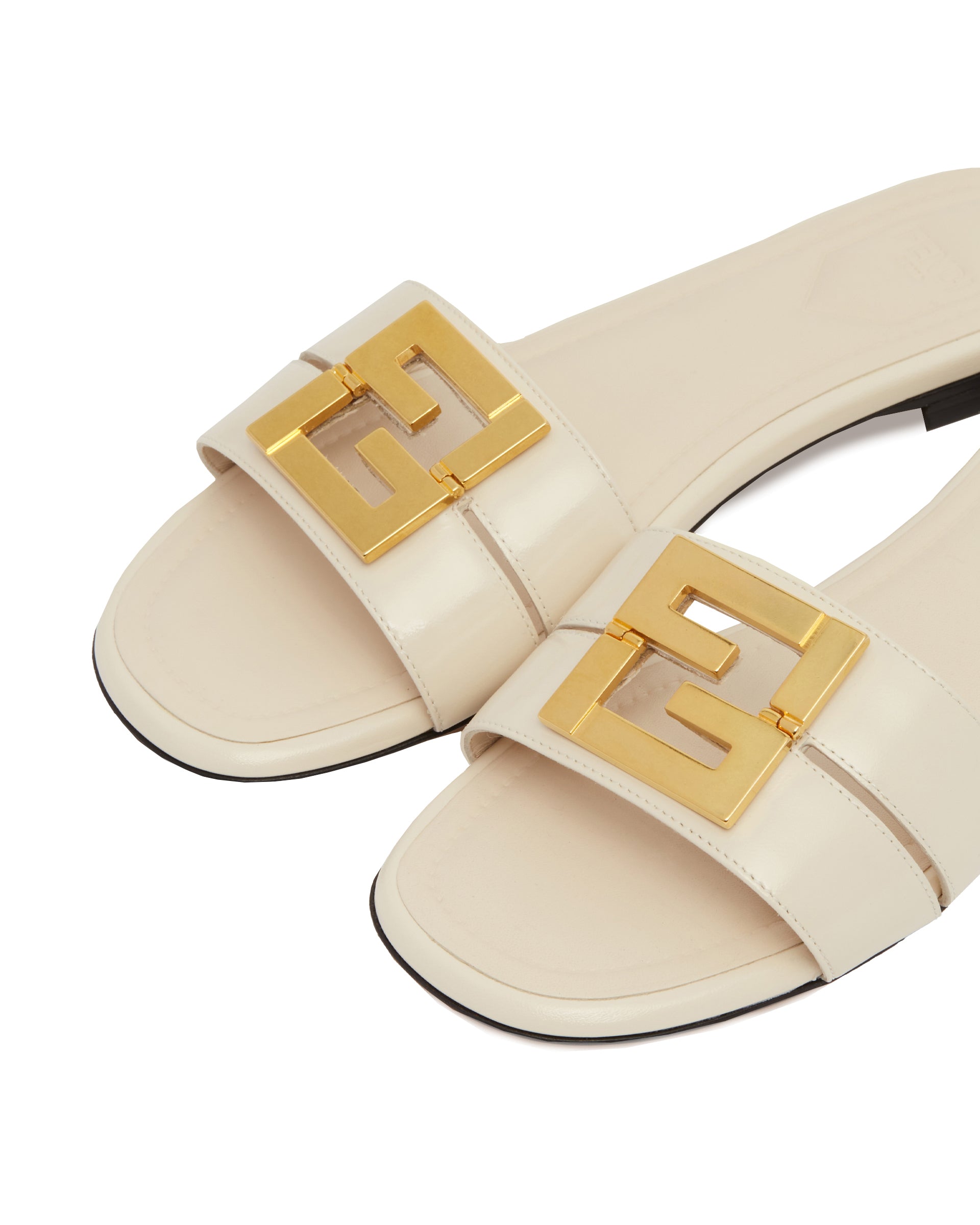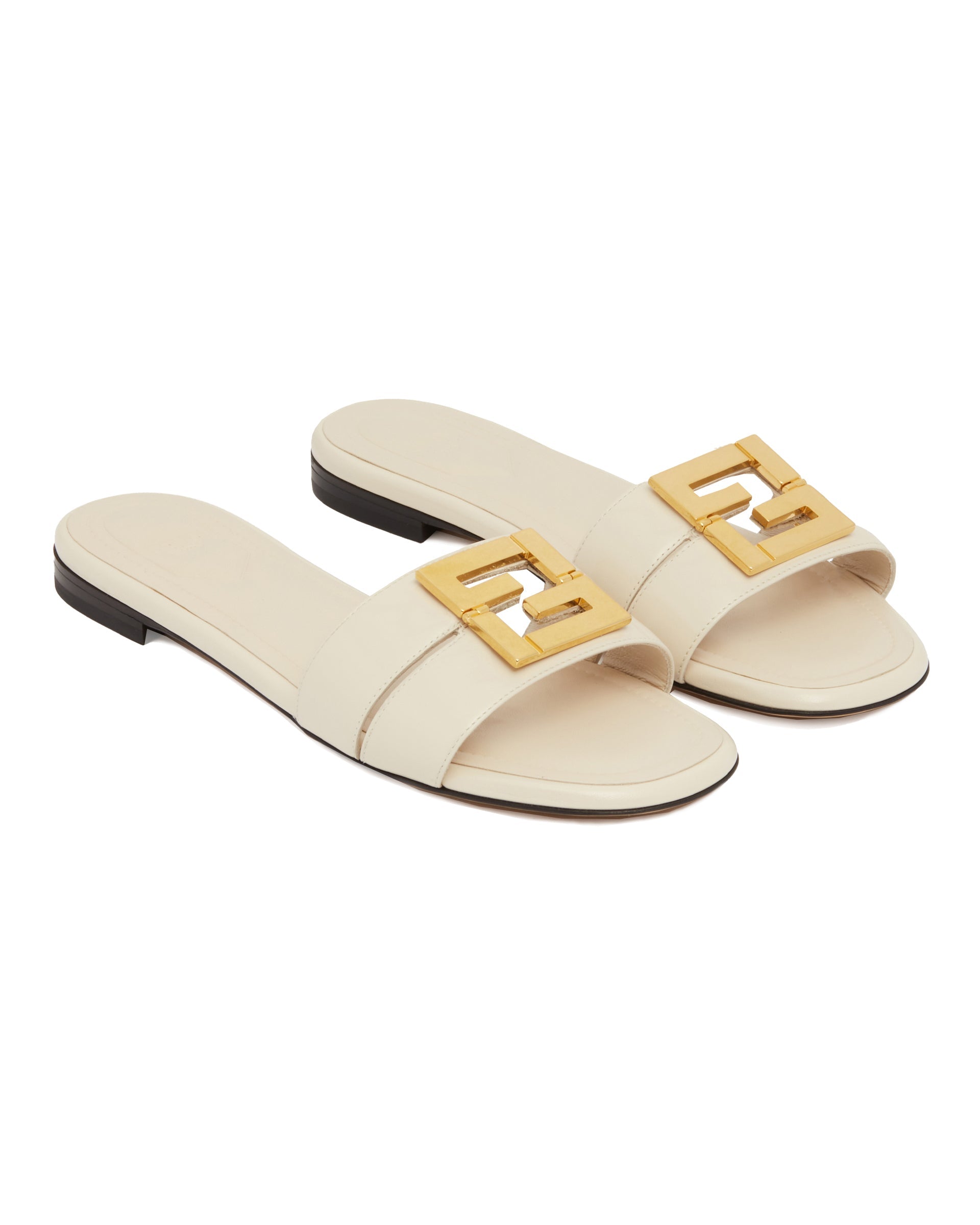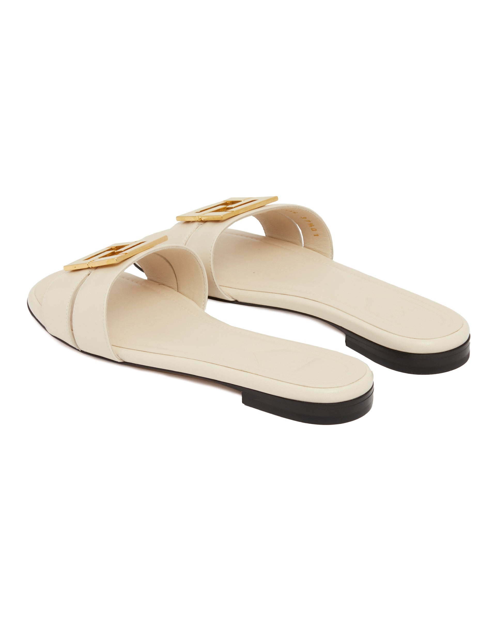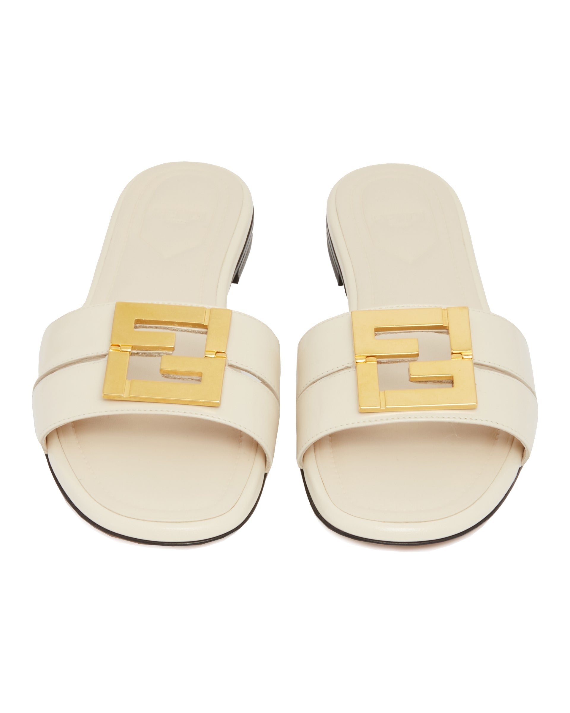 Fendi FFold White leather sandals. White leather upper, wrap-around bands and golden-tone metallic FF motif. Flat sole.