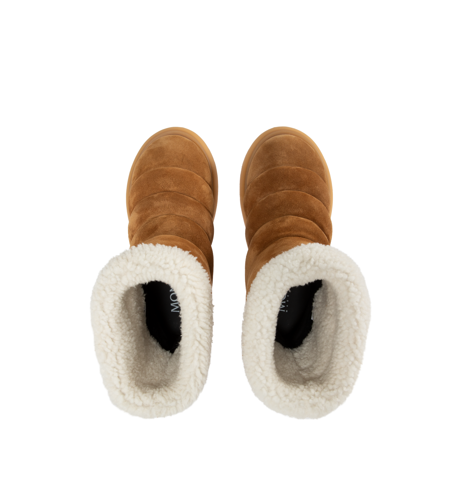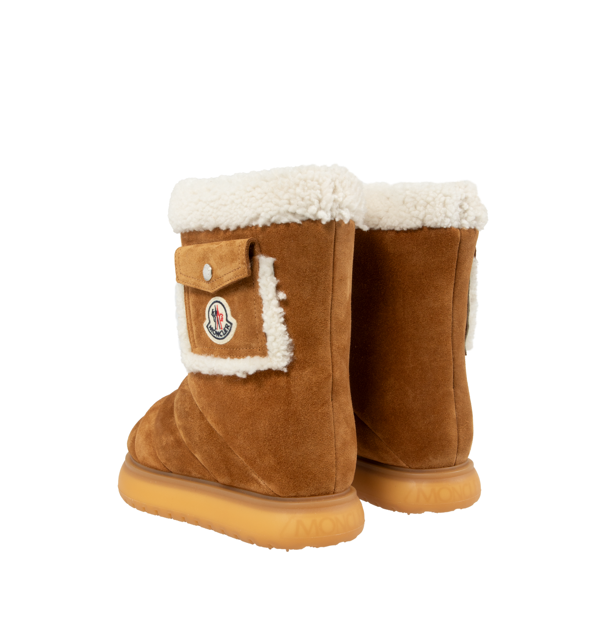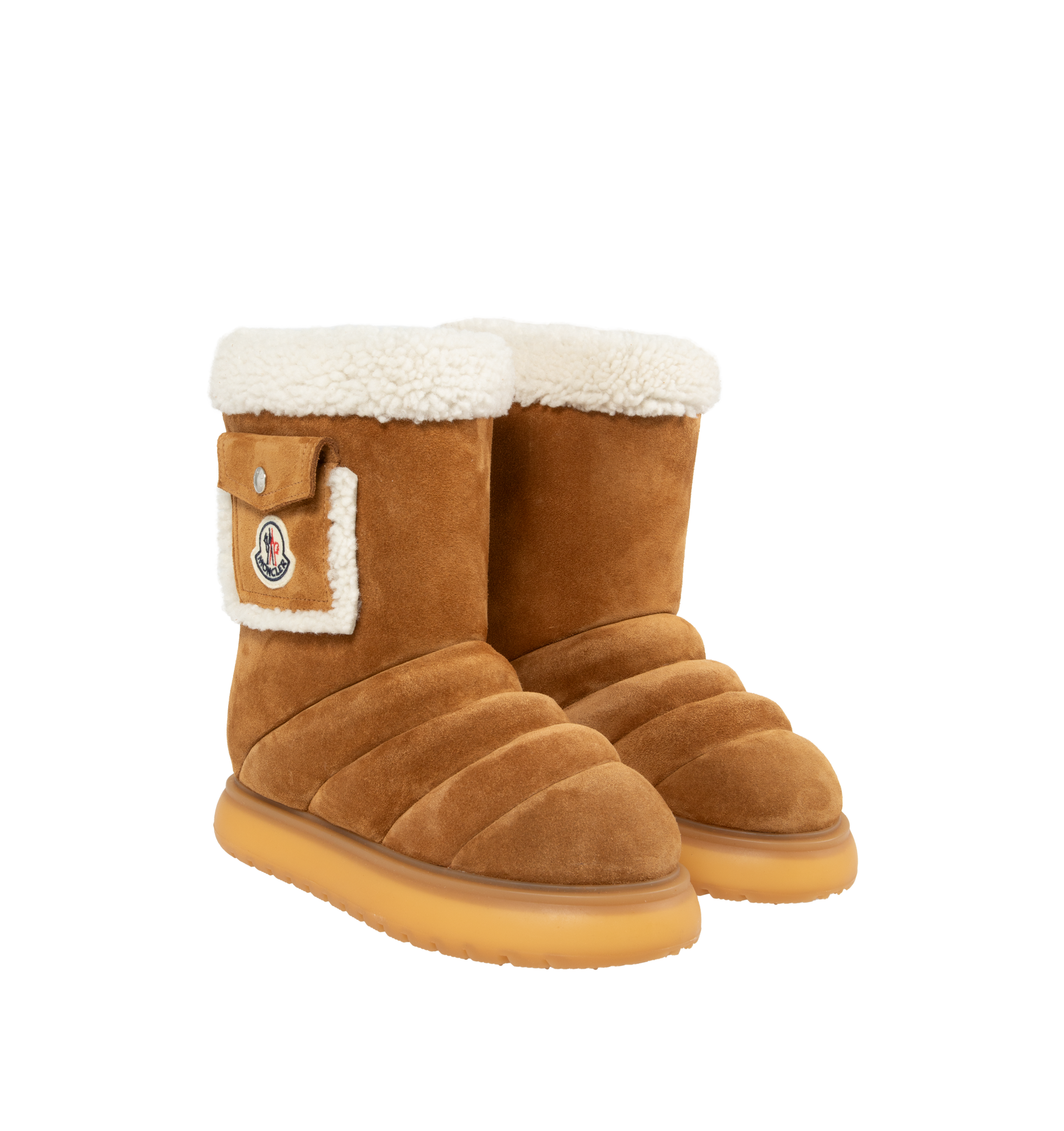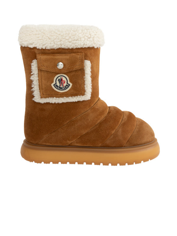 MONCLER Gaia Pocket-Detailed Suede Ankle Boots featuring channel-quilted upper and plush faux-shearling lining, logo-patched shaft pocket, pull-on style, leather upper and rubber sole.