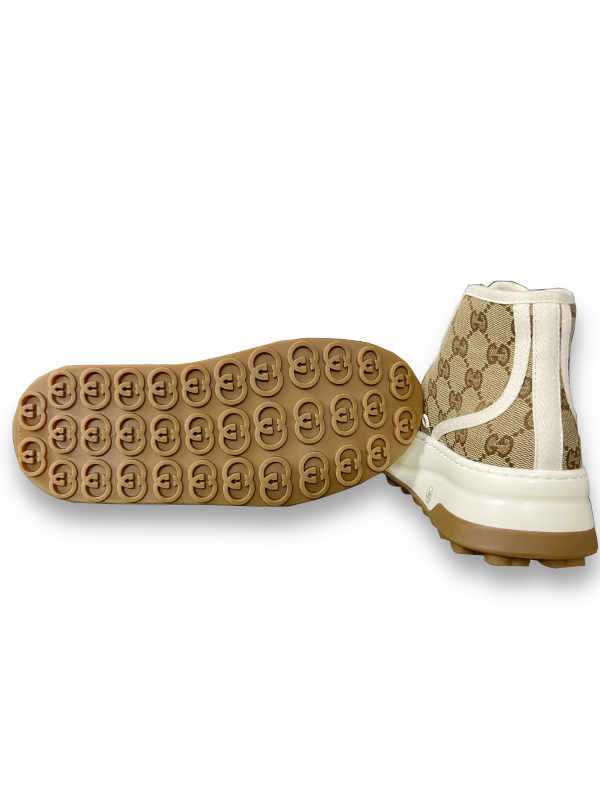 Step into the world of sports-inspired luxury with these Gucci sneakers, showcasing a distinctive silhouette that draws inspiration from the dynamic tennis courts. Crafted from black GG canvas, this high-top model not only exudes an athletic vibe but also boasts a chunky sole, adding a modern and bold dimension to the design. The contrasting fabric trim further elevates the aesthetic, making these sneakers a statement piece that seamlessly combines classic elements with contemporary flair. Embrace the intersection of sporty elegance and urban style with these Gucci high-top sneakers.
