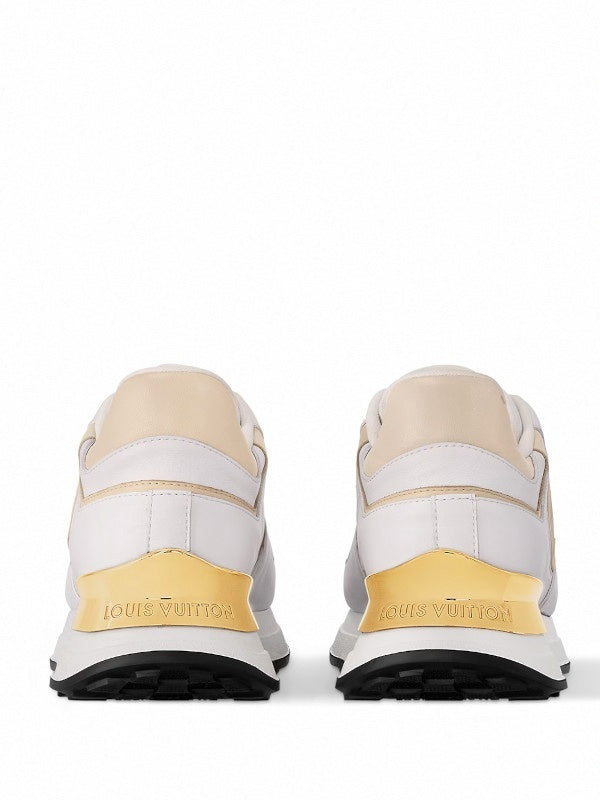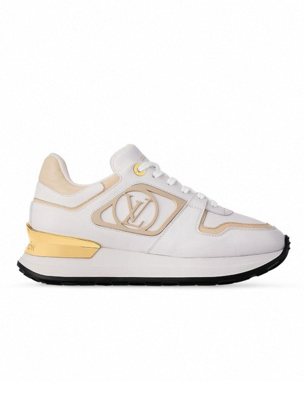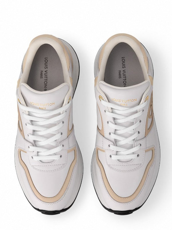 Key Features: Made from durable calfskin leather for a luxurious feel. Inspired by the legendary Louis Vuitton Run Away sneakers. Includes LV initials and a contrasting stabilizer with Louis Vuitton engraving. Features gold accents, white laces, and rubber soles for a contemporary aesthetic. Perfect for running and casual outings, offering both comfort and style.