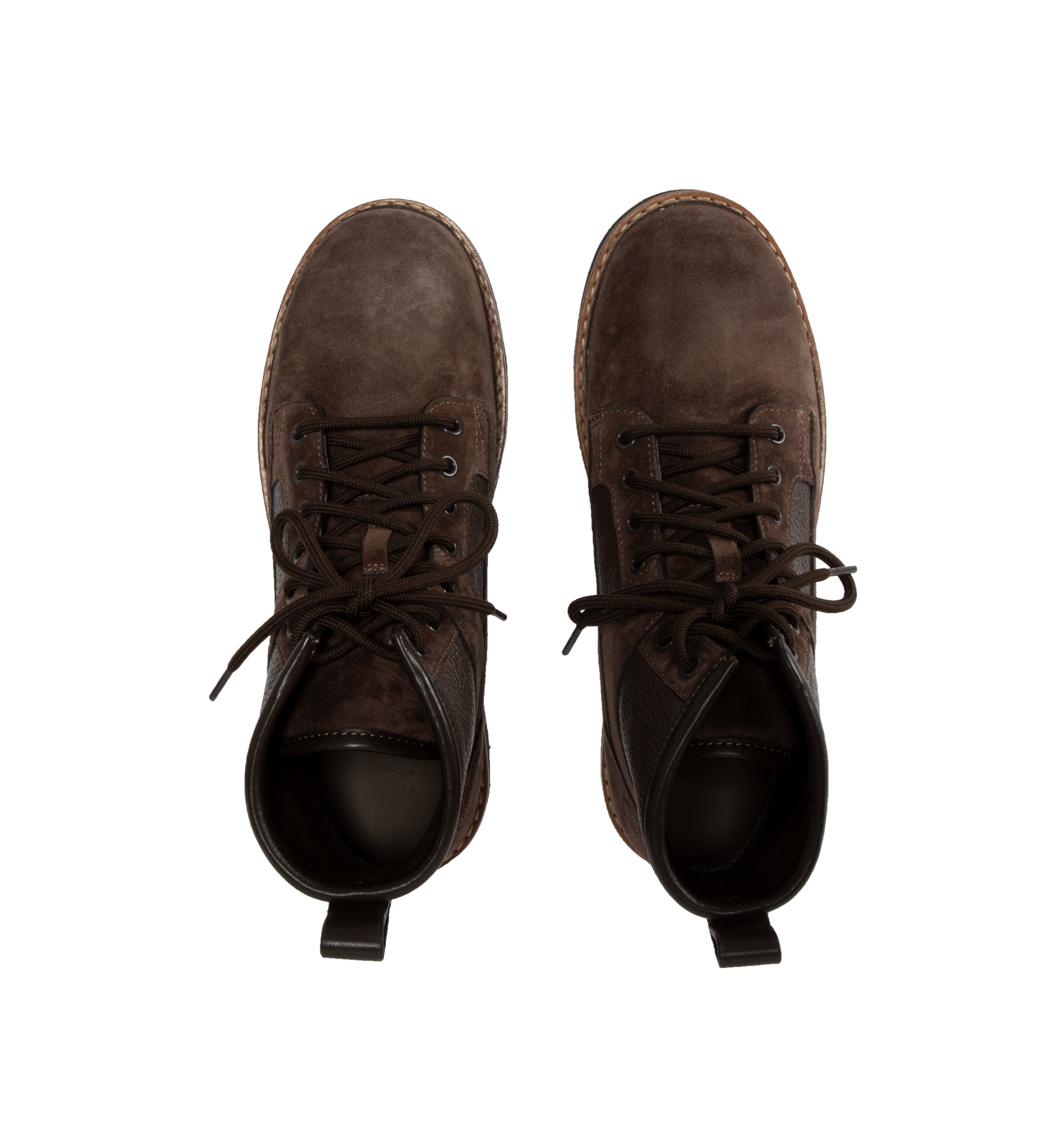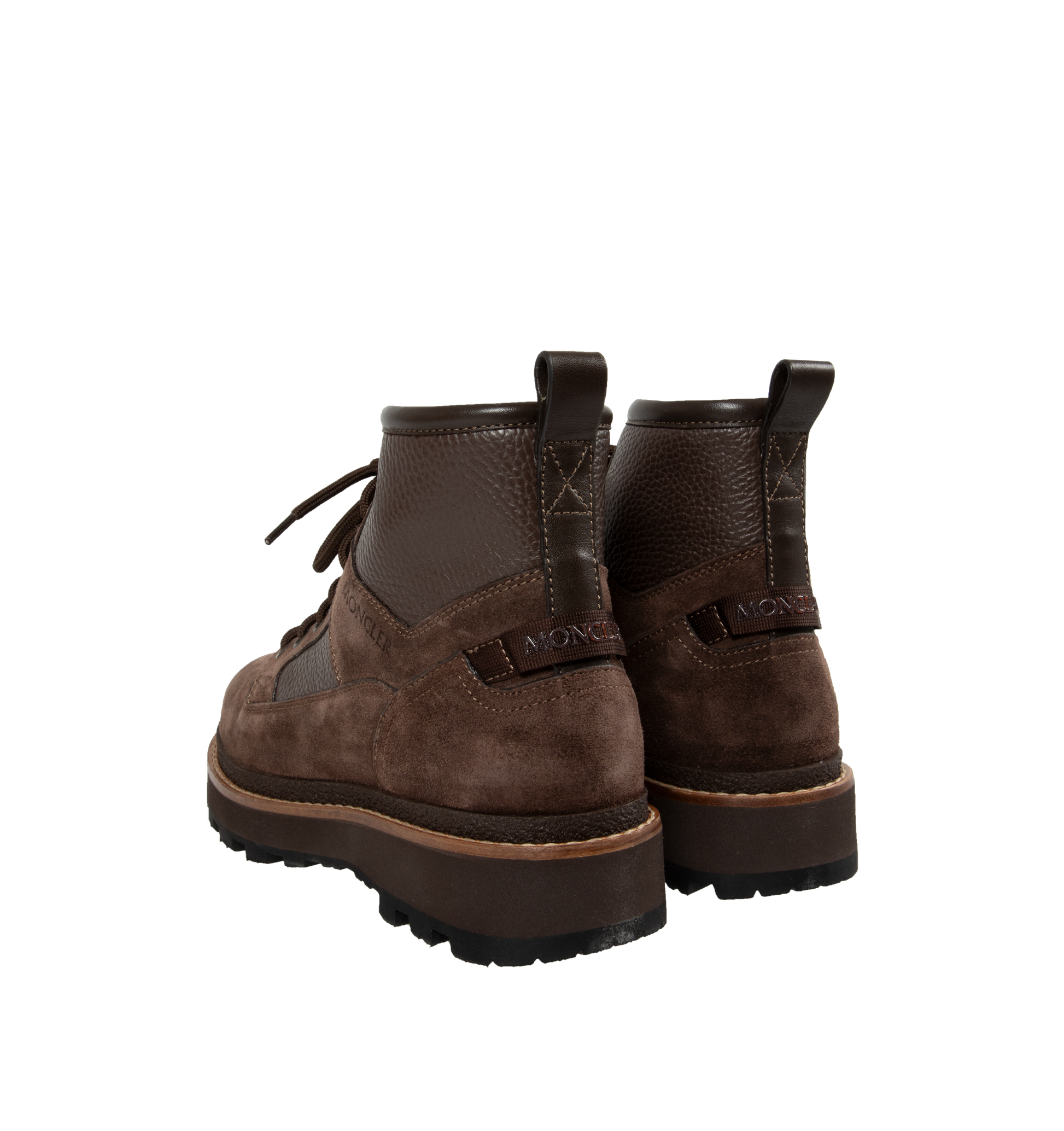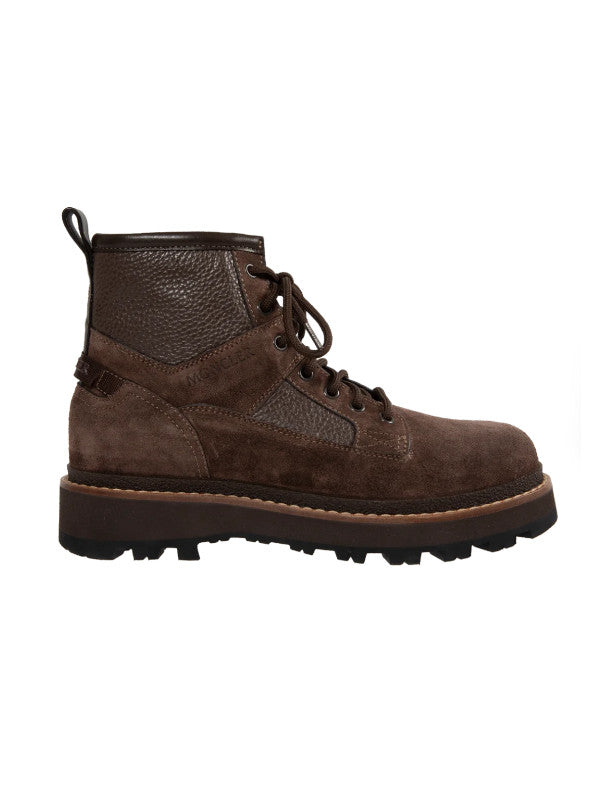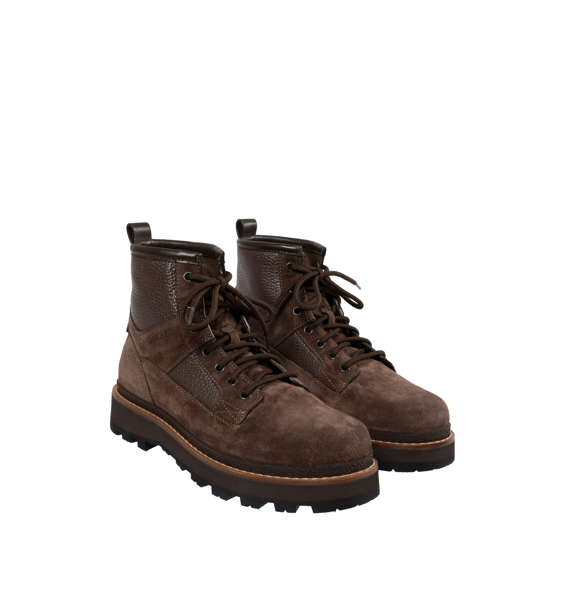 MONCLER Peka Camp Suede & Leather Lace-Up Boots featuring suede and leather upper, leather lining insole, lace-up closure, leather welt, micro rubber midsole and vibram rubber tread. Calf length 14 cm. Sole height 4.5 cm. Leather. Sole: 100% elastodiene.