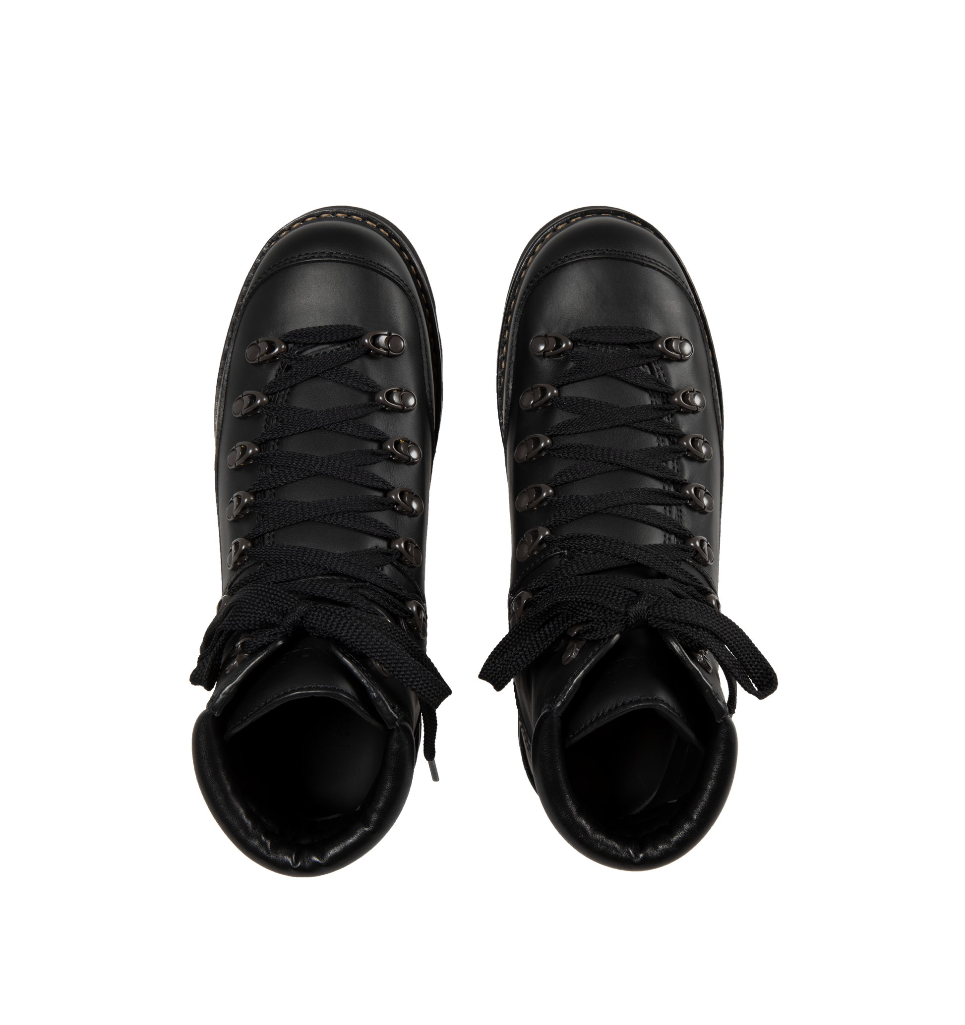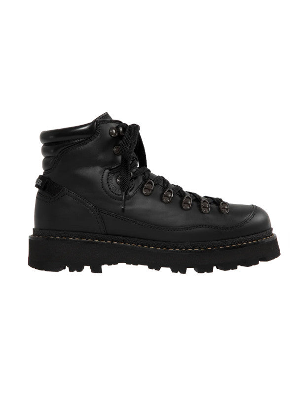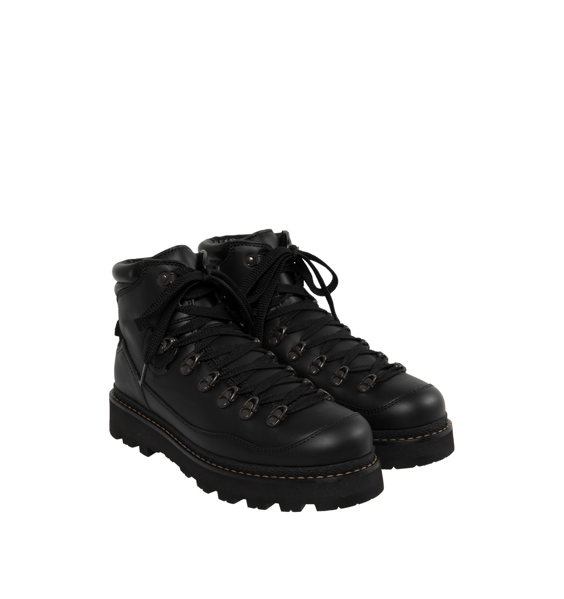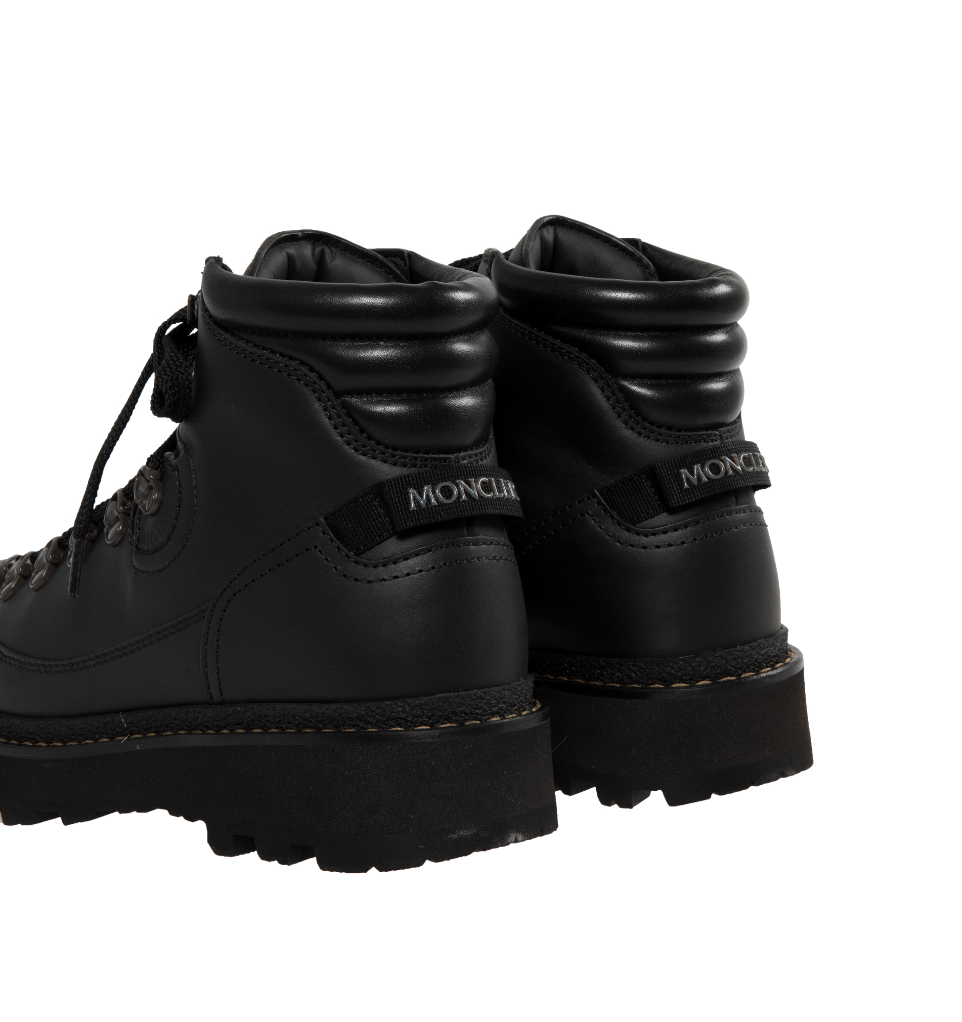 MONCLER Peka Excursion Boots featuring suede and nylon upper, leather lining insole, lace closure, leather welt, micro rubber midsole, and Vibram rubber tread. Sole height 5.5 cm. 100% polyamide/nylon. Lining: cow. Sole: 100% elastodiene.