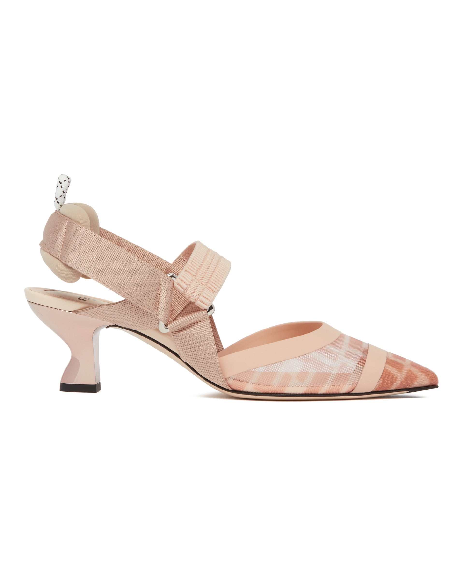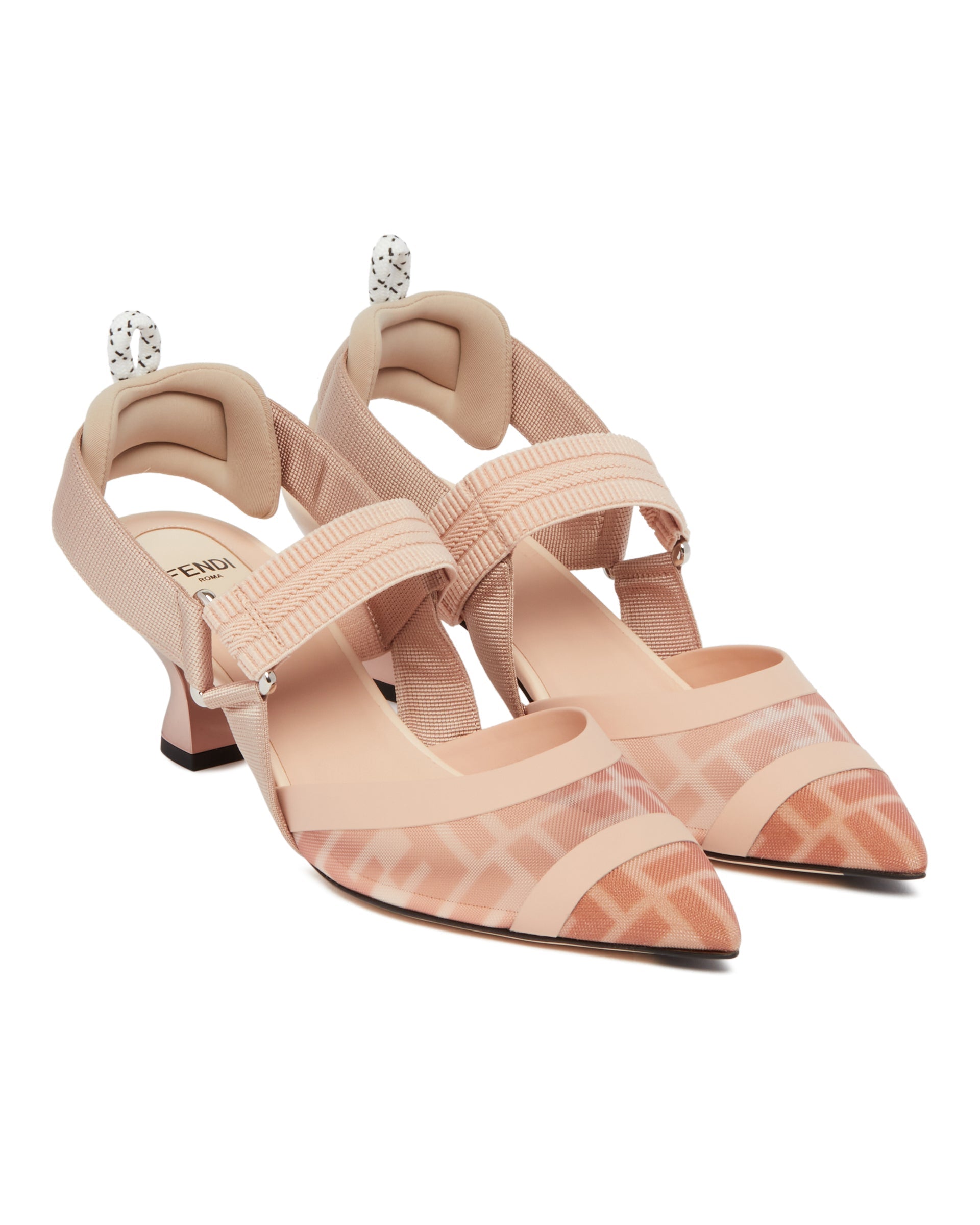 Fendi Pink Colibri Slingbacks. Upper crafted in pink tech fabric with a FF motif panel. Pointed toe, elasticated bands, padded cushion, trekking tab, gold-toned galvanised medium heel, leather outsole with rubber inserts.