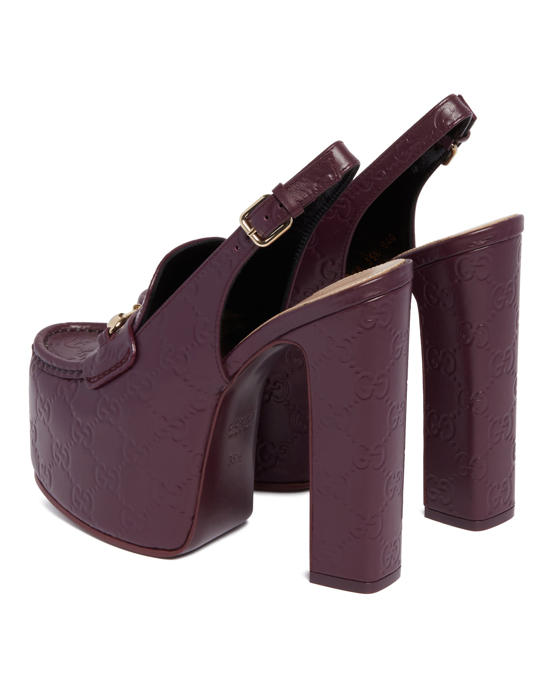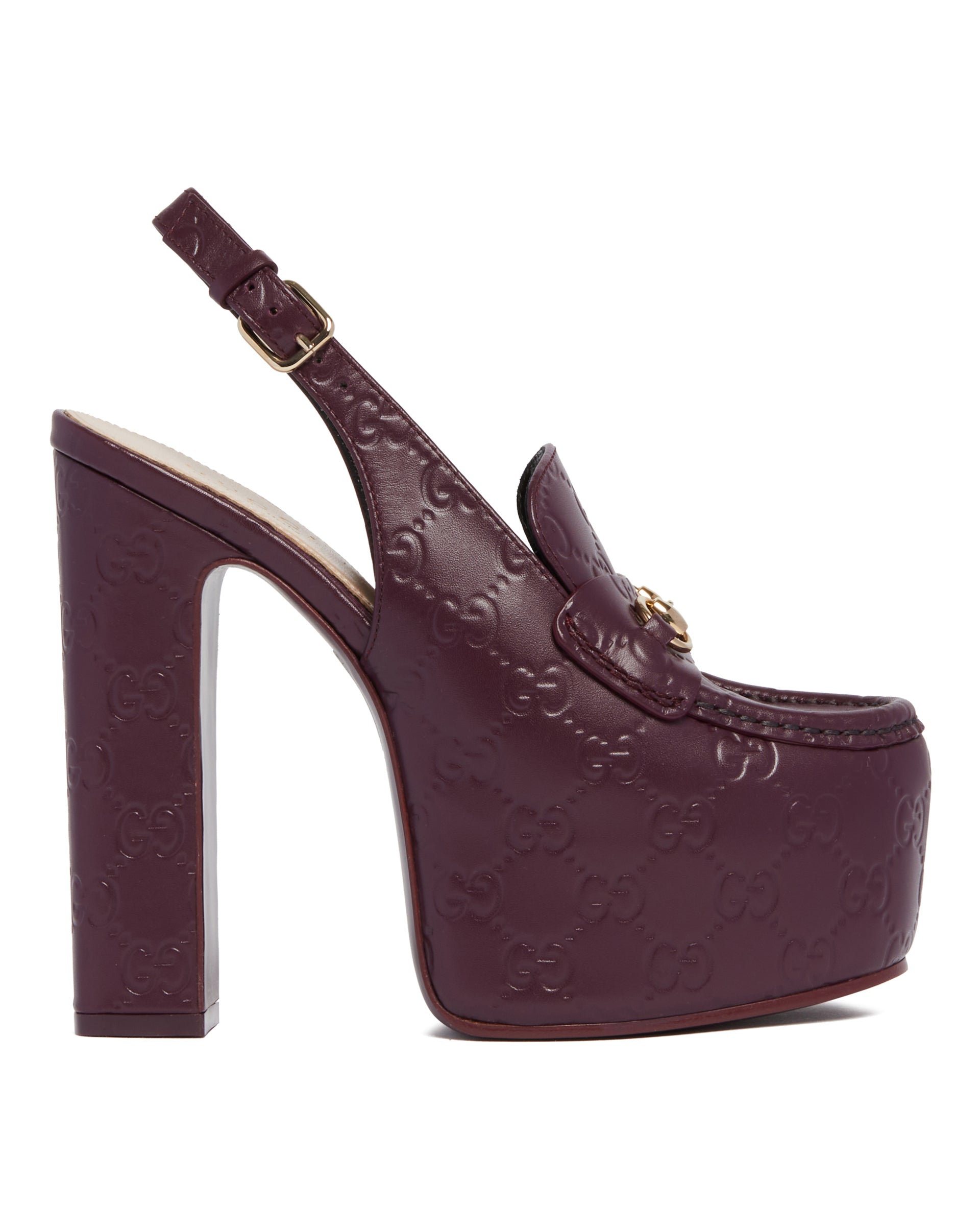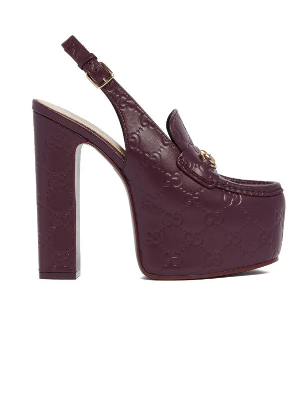 Gucci Purple Platform Loafers. Purple leather upper with GG detail, almond-shaped toe and slingback design. Horsebit detail, adjustable ankle strap with buckle and high heel with matching platform. Heel Height: 14 cm