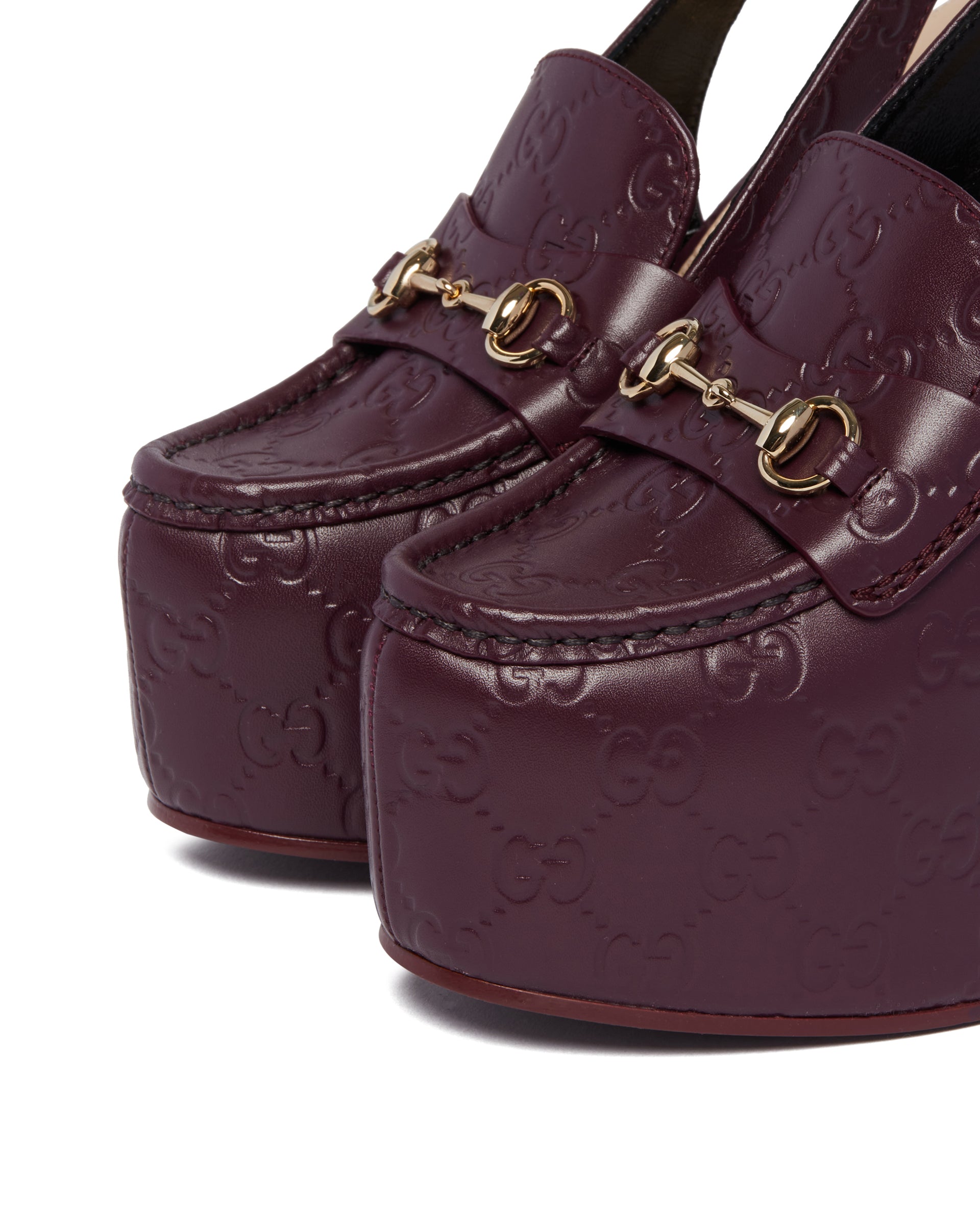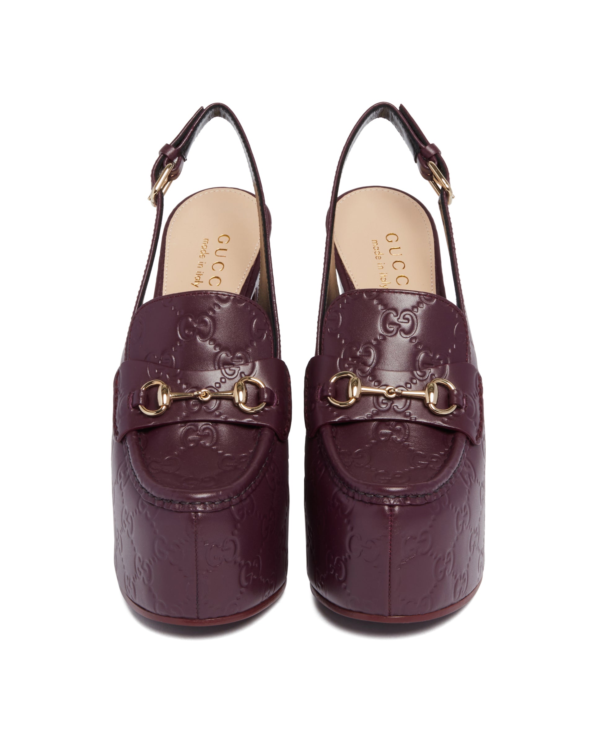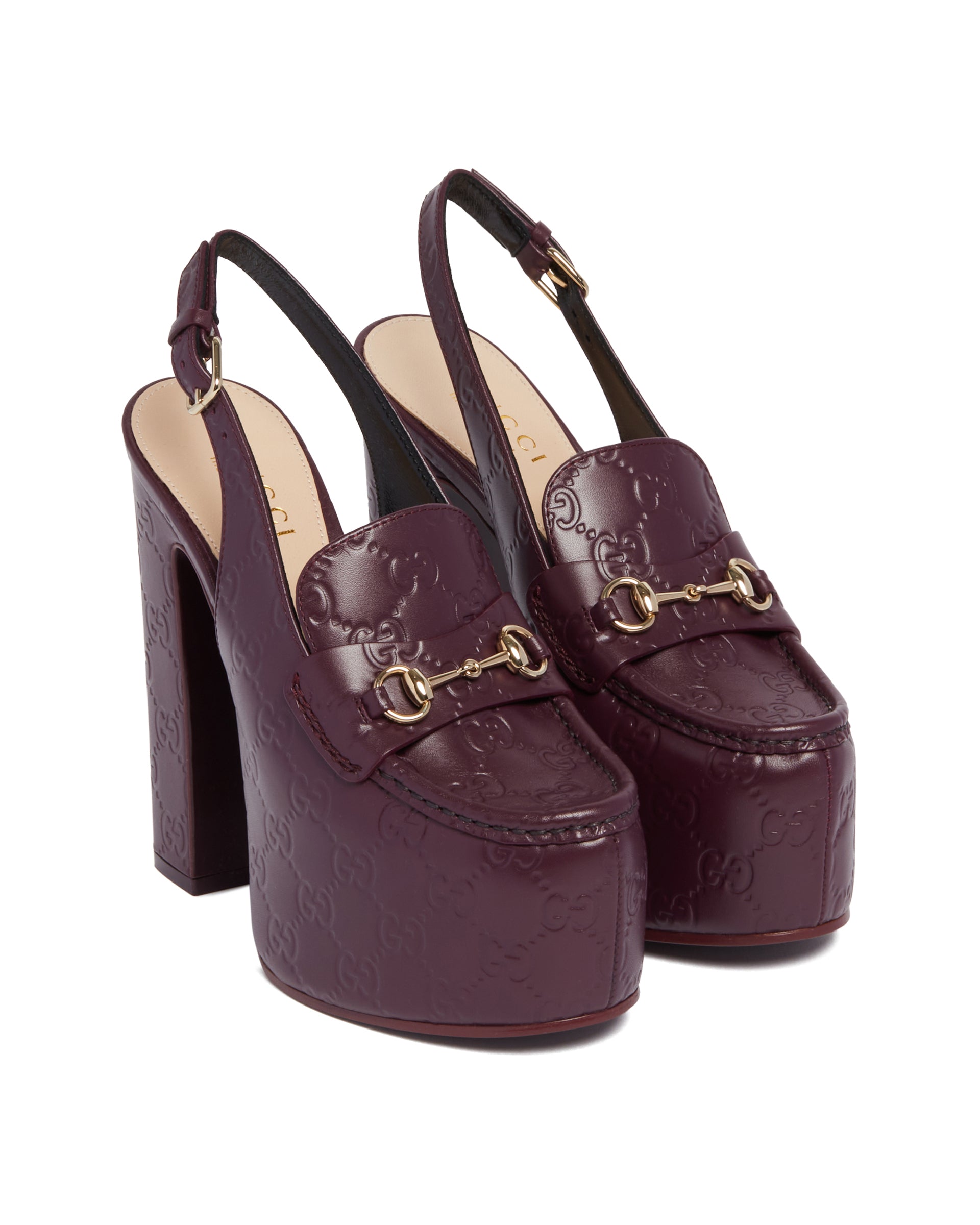 Gucci Purple Platform Loafers. Purple leather upper with GG detail, almond-shaped toe and slingback design. Horsebit detail, adjustable ankle strap with buckle and high heel with matching platform. Heel Height: 14 cm