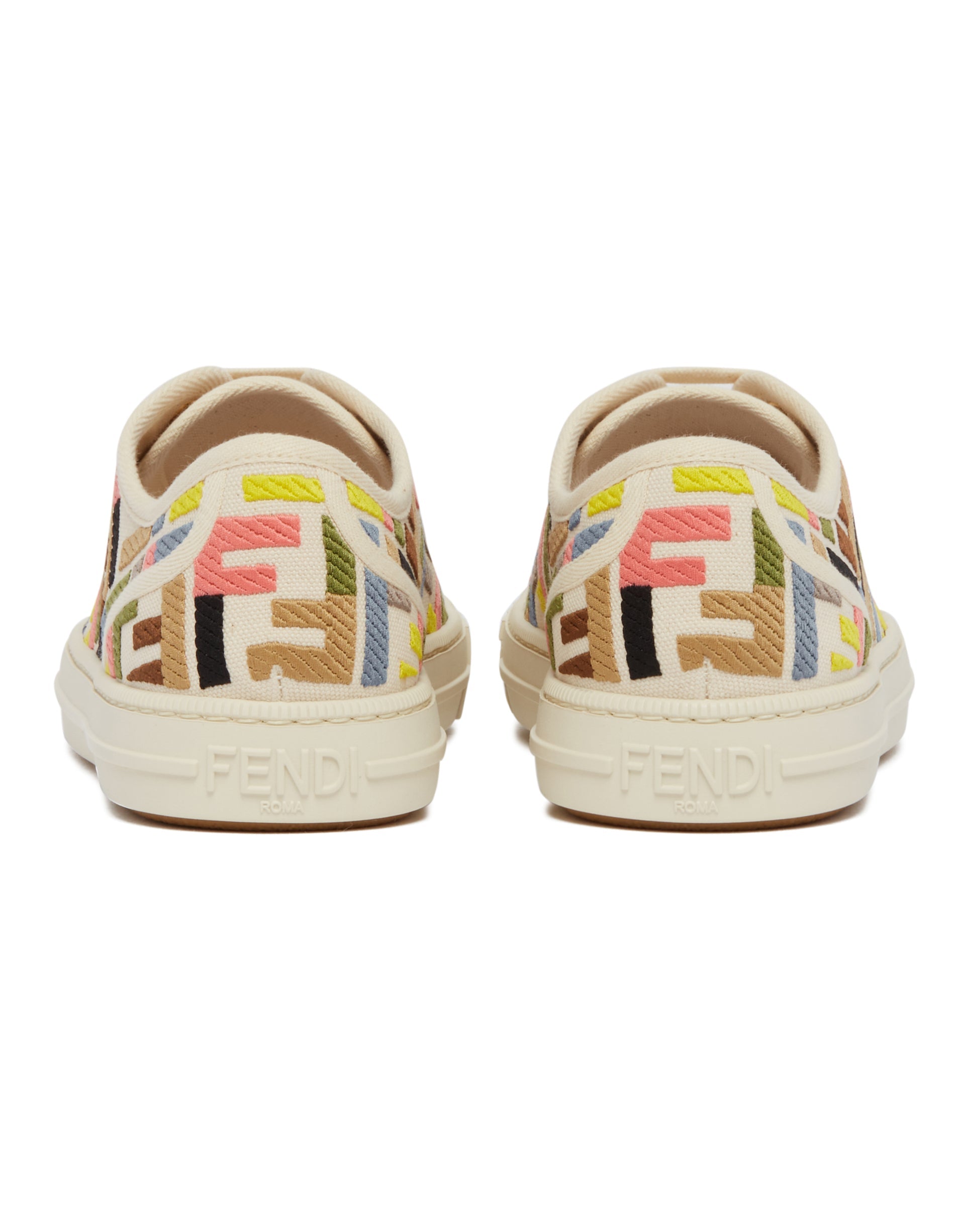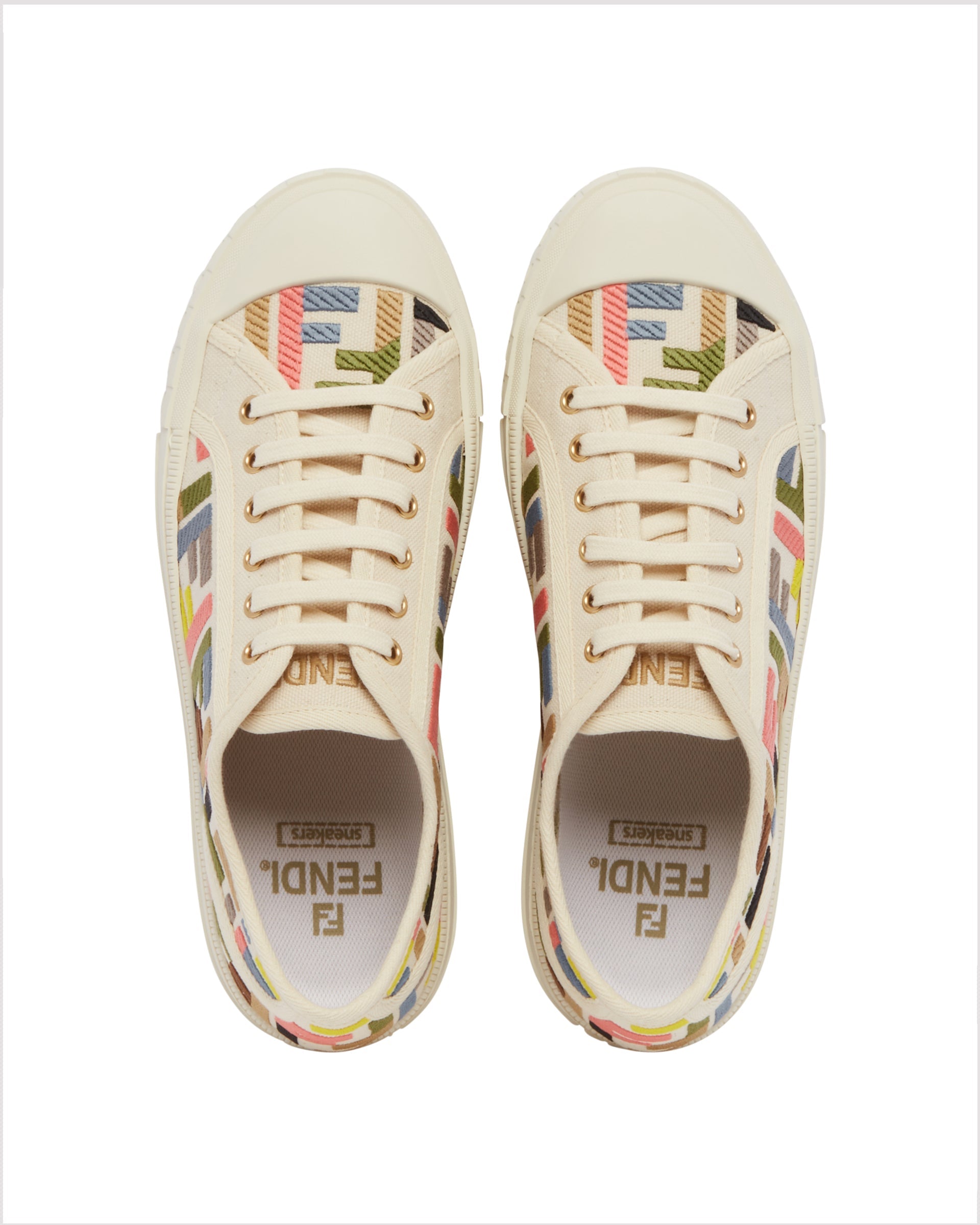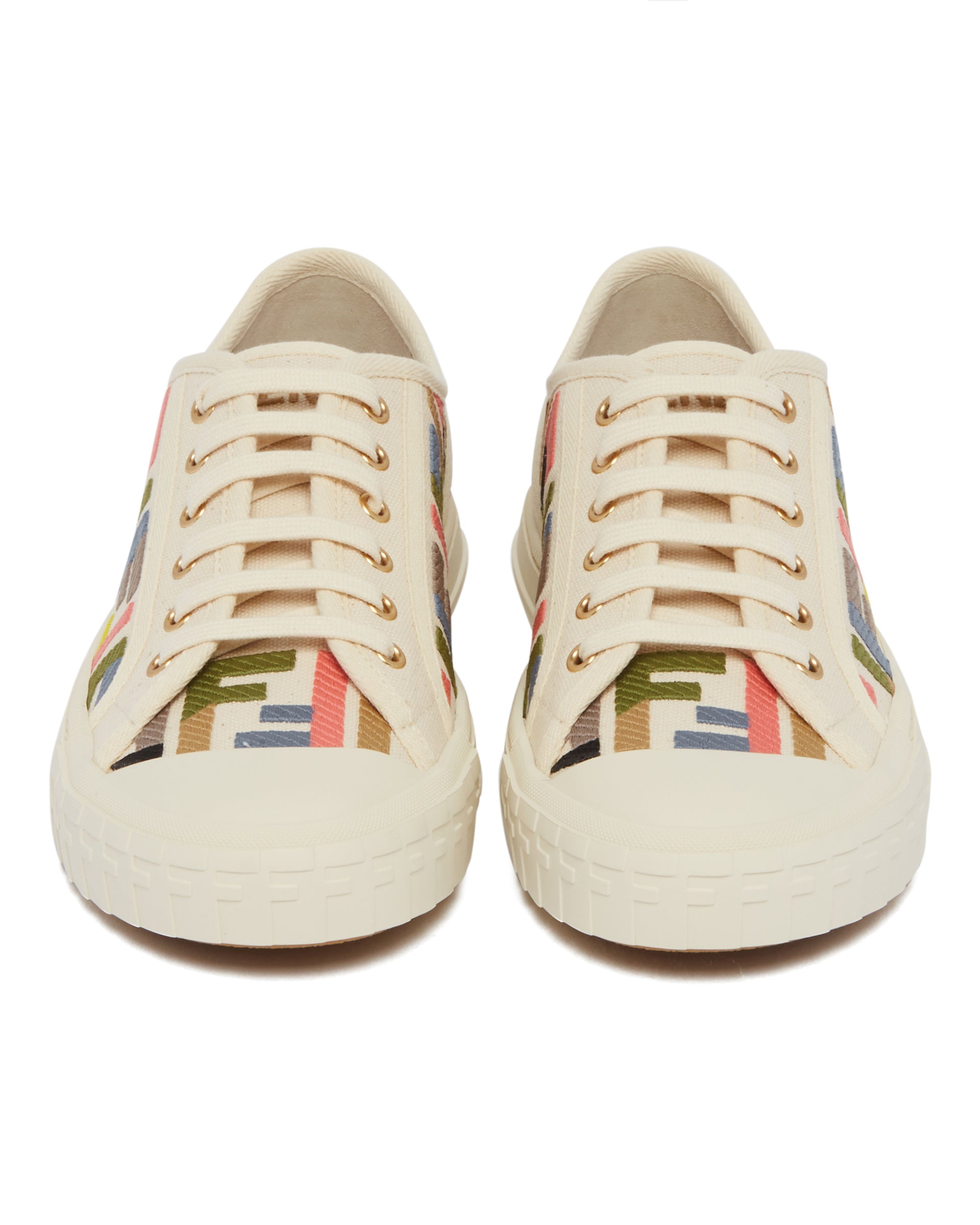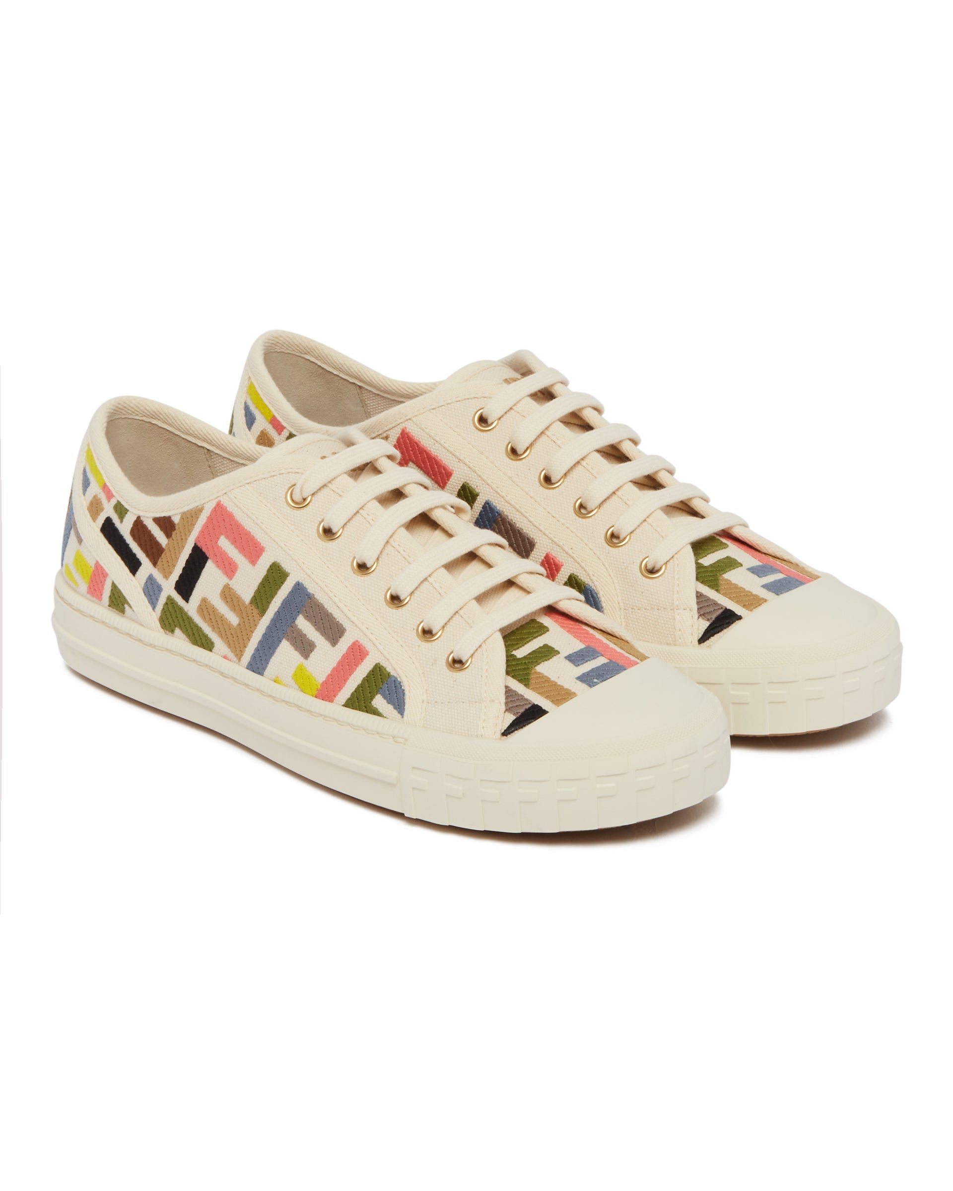 Fendi White Domino Sneakers. Upper crafted in white canvas with multicolor embroidered FF motif. Round toe, front lace-up fastening, toe cap, logoed details, rubber outsole.