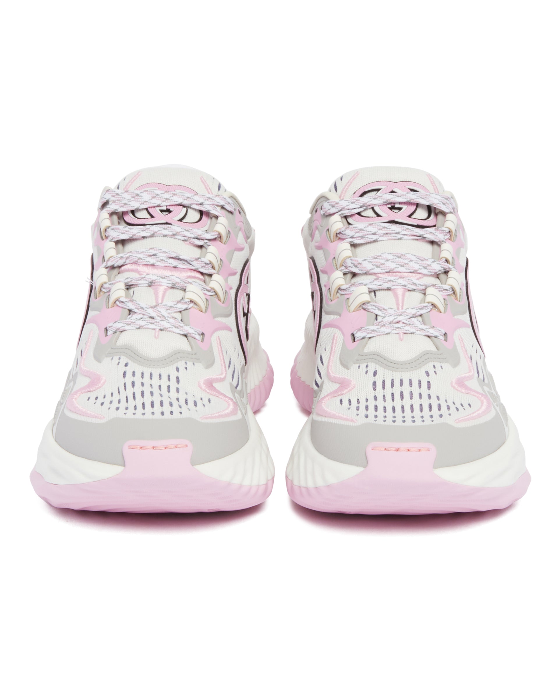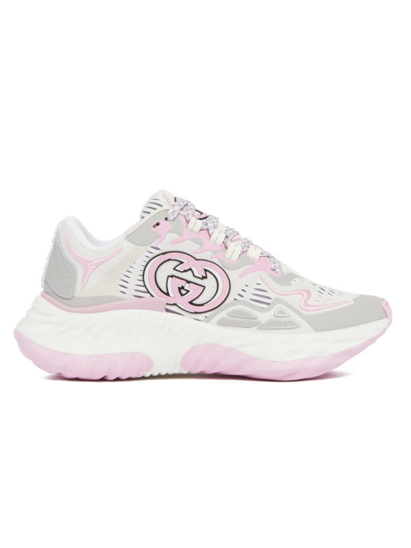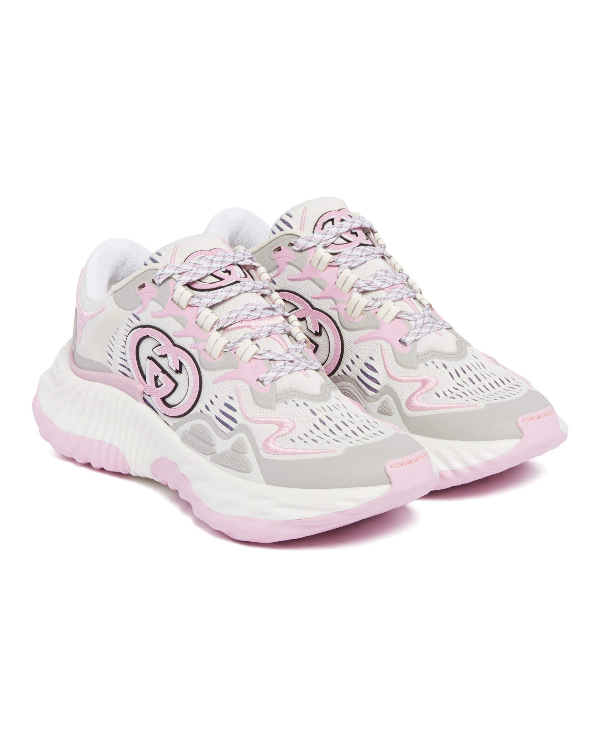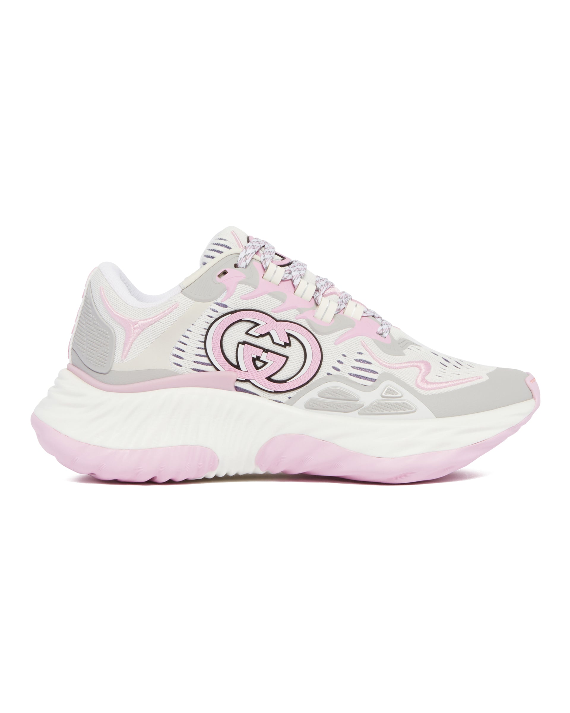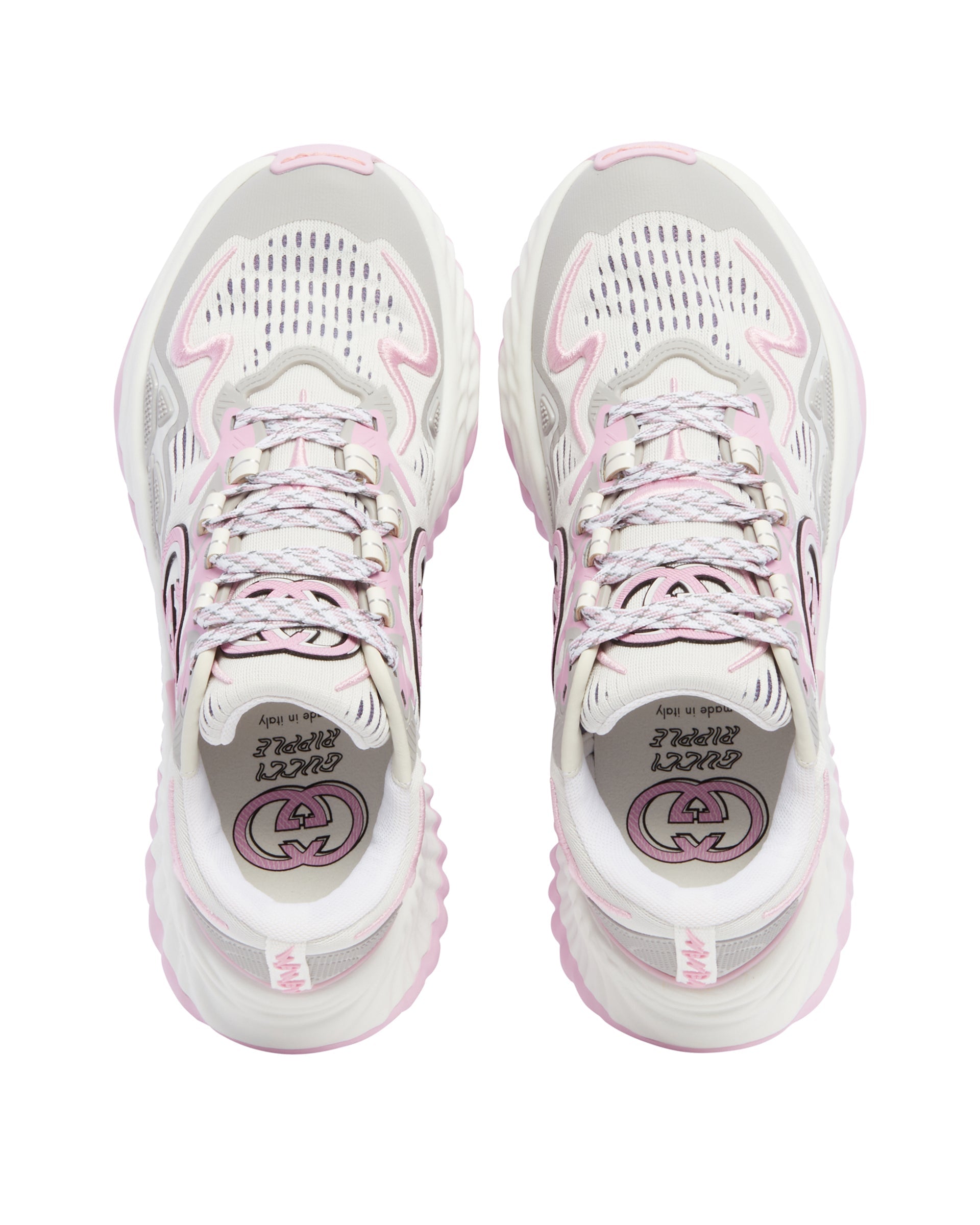 Gucci White Ripple Sneakers. Upper crafted in white fabric and rubber with contrasting details. Round toe, front lace-up fastening, logoed details, Interlocking G on tongue and side, 3D elements, oversized rubber outsole.